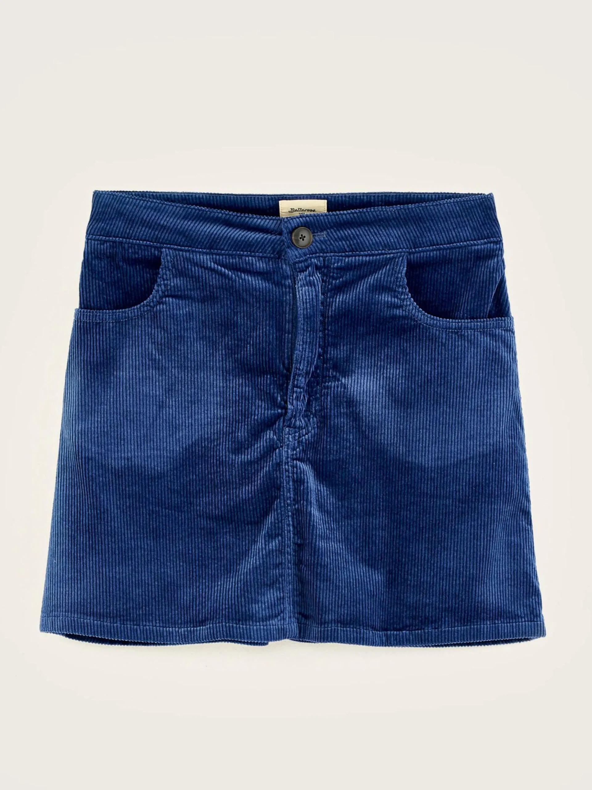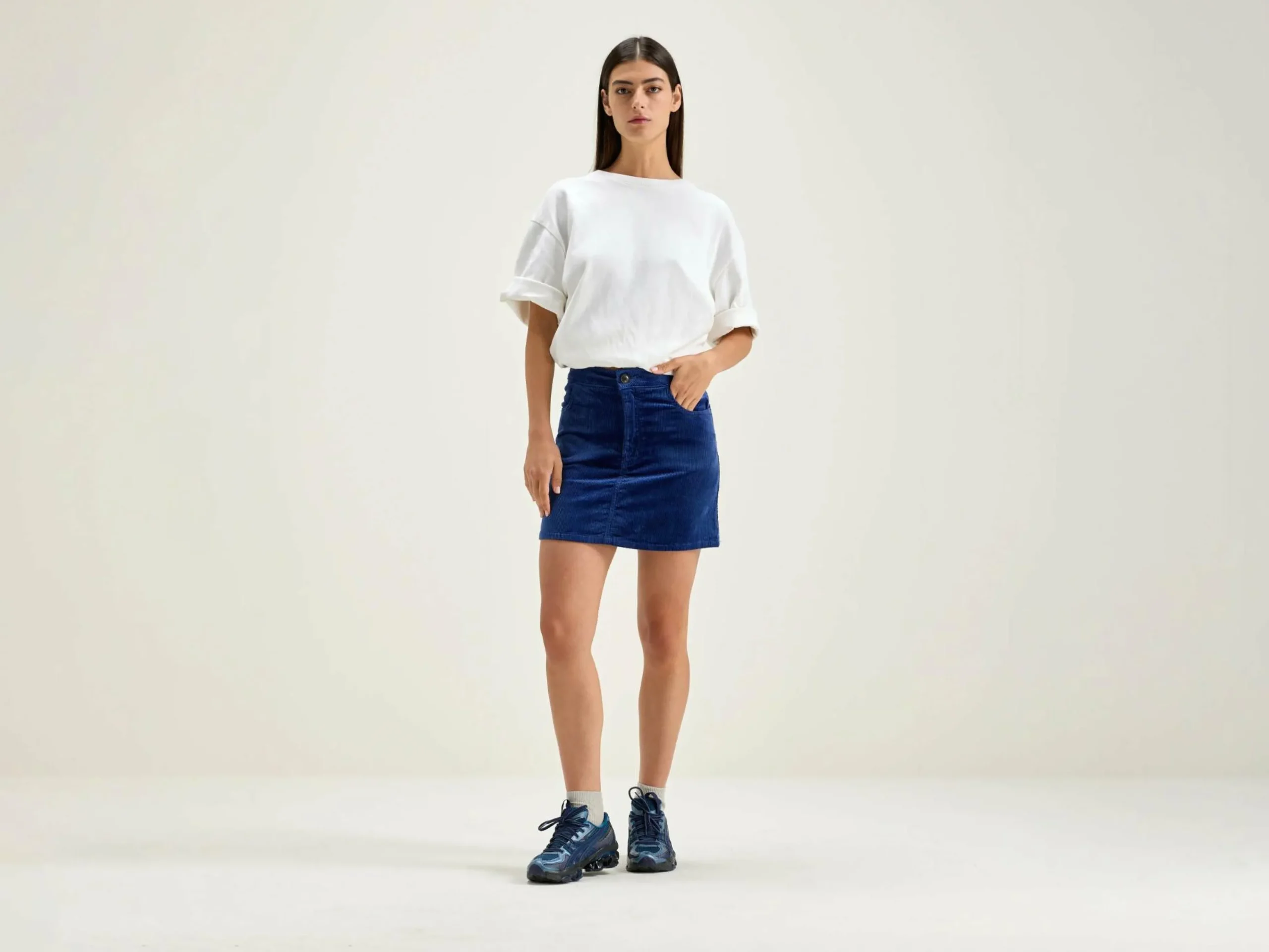 Mini-jupe en velours côtelé bleu, forme trapèze et style 5 poches.
