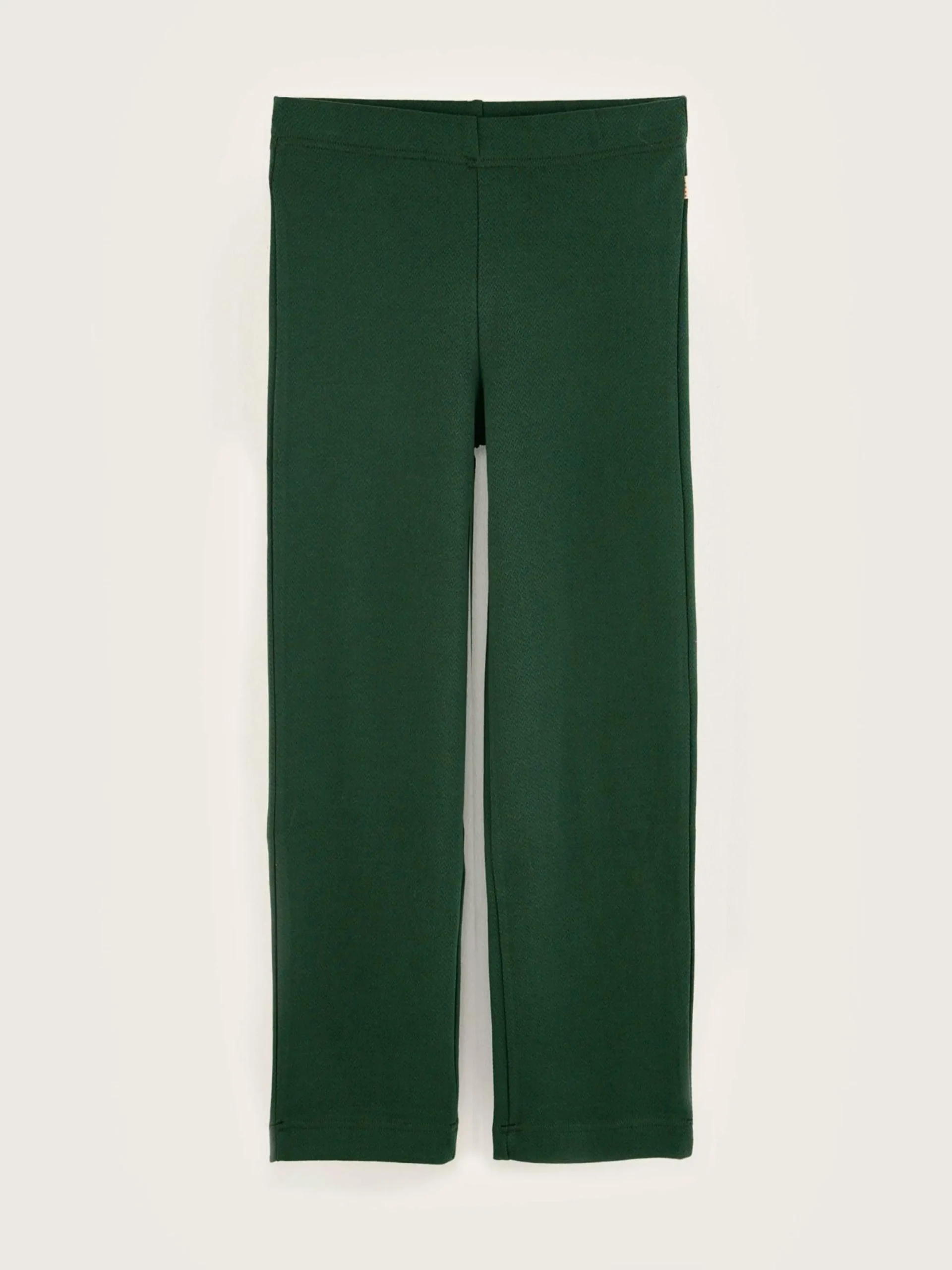 Pantalon vert bouteille à taille élastique et jambes évasées.