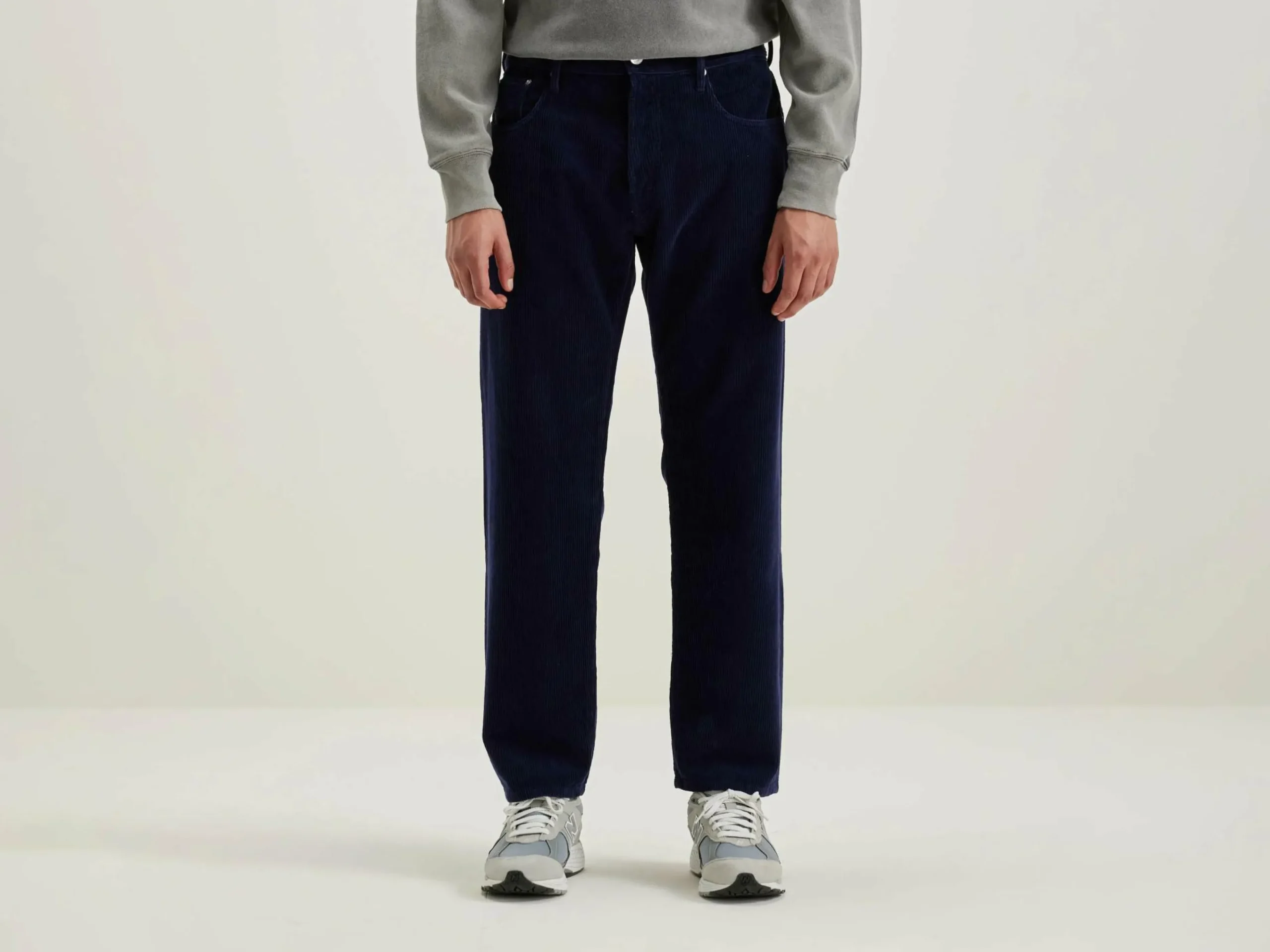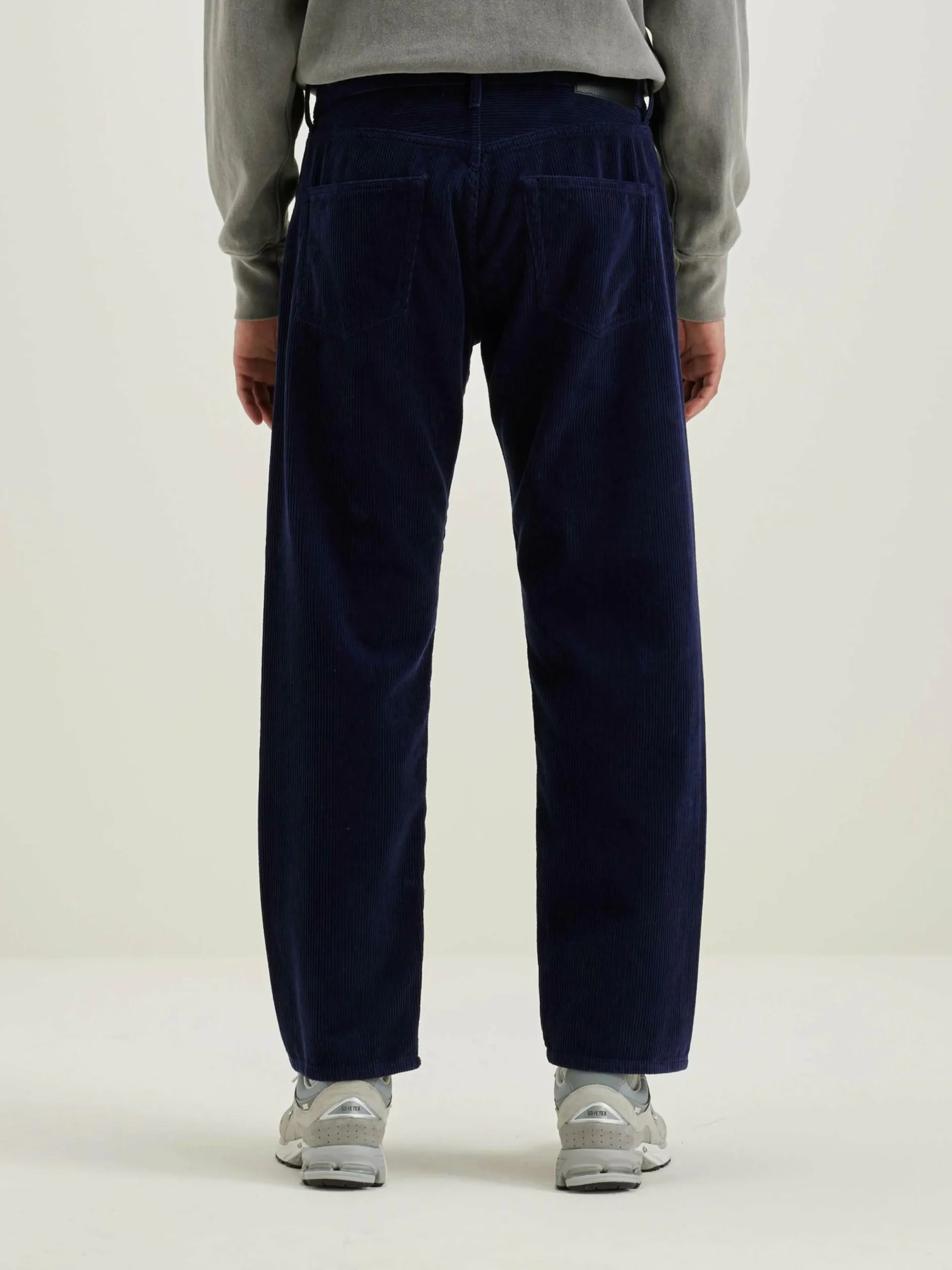 Pantalon 5 poches « dad style », taille basse et jambes droites, en velours de coton bleu foncé.