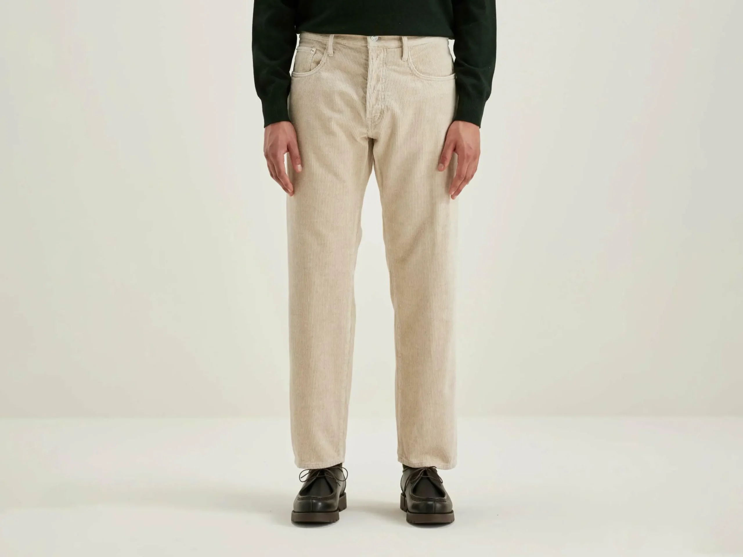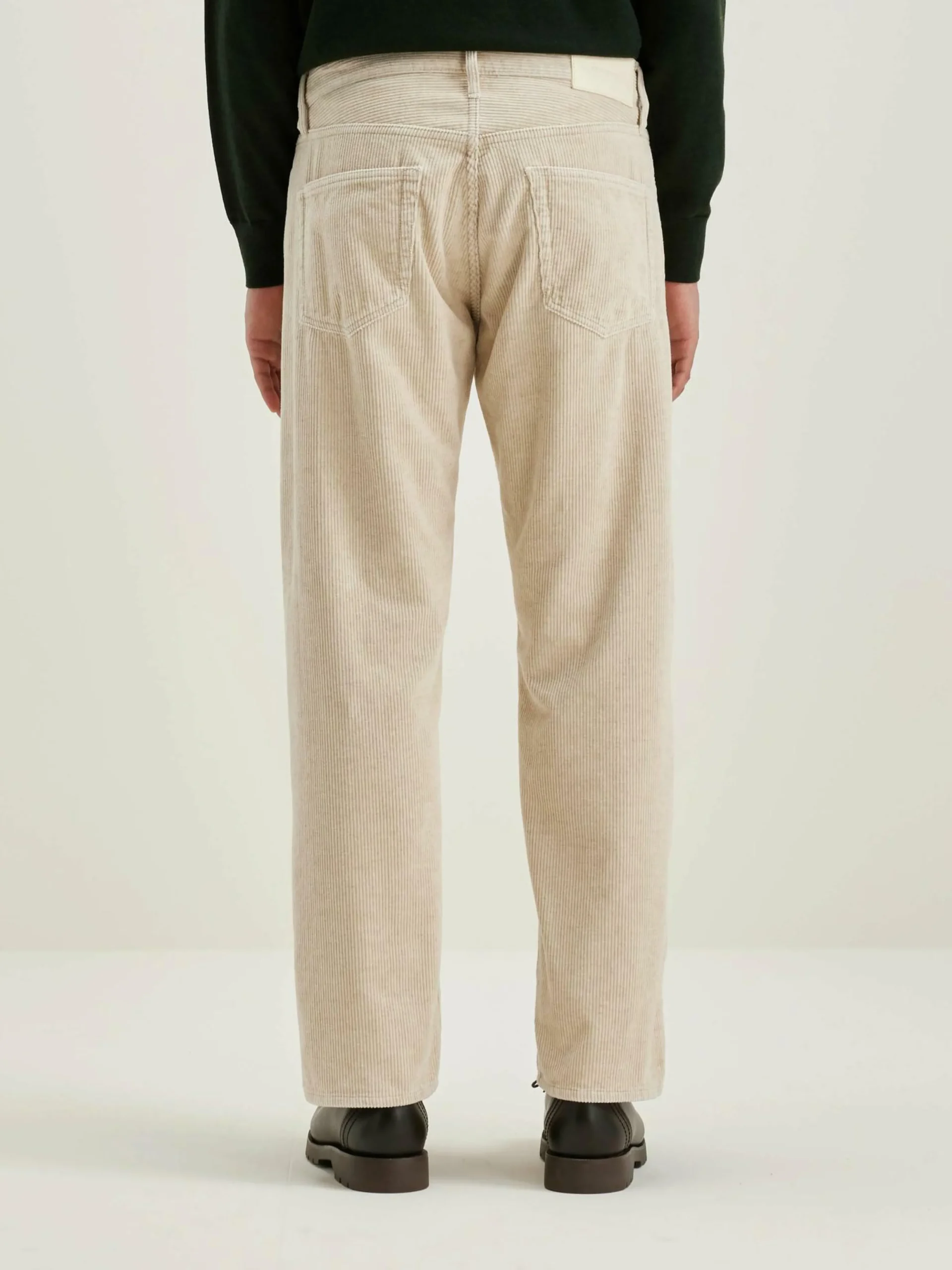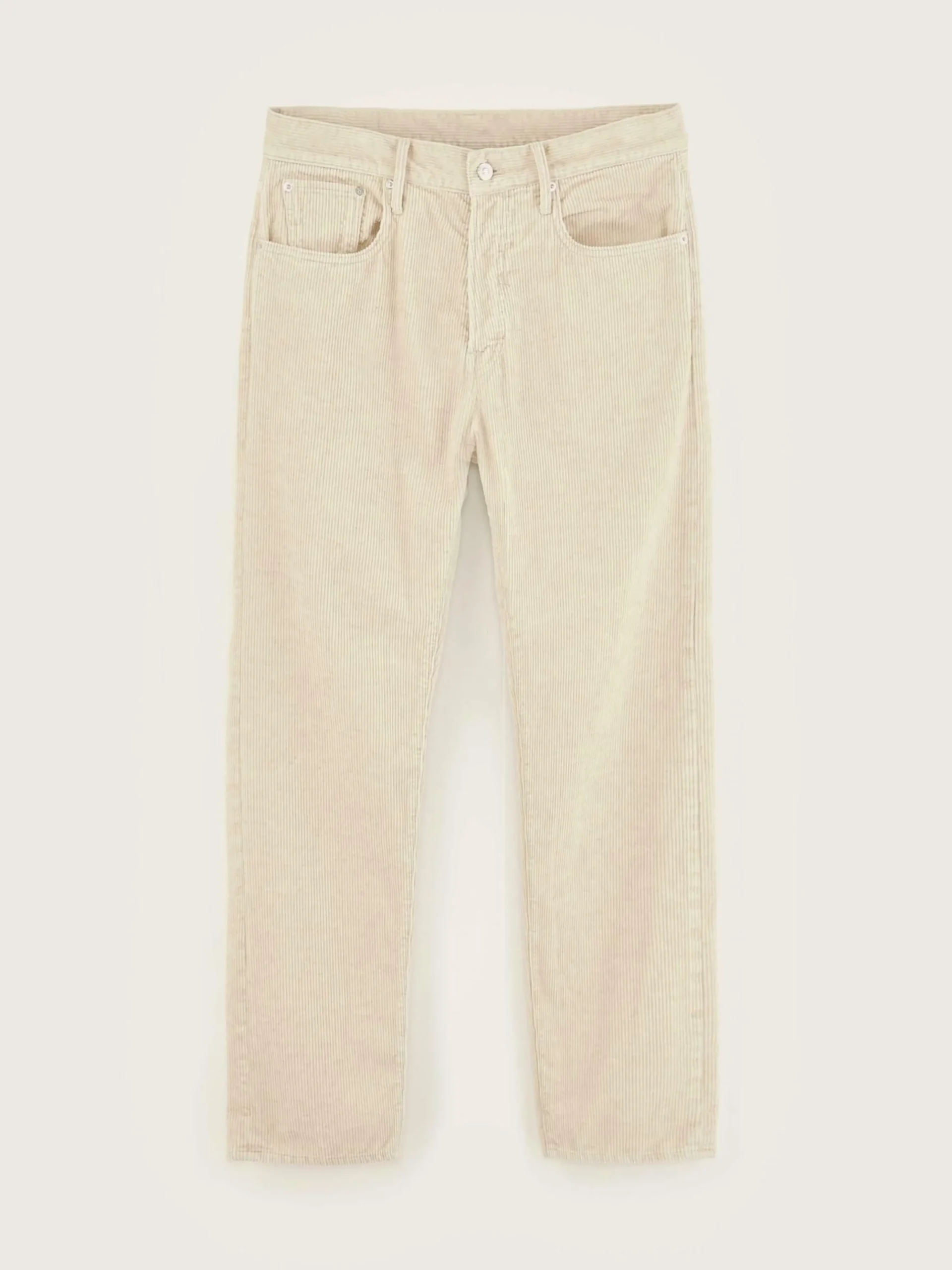 Pantalon 5 poches « dad style », taille basse et jambes droites, en velours de coton et lin couleur beige.