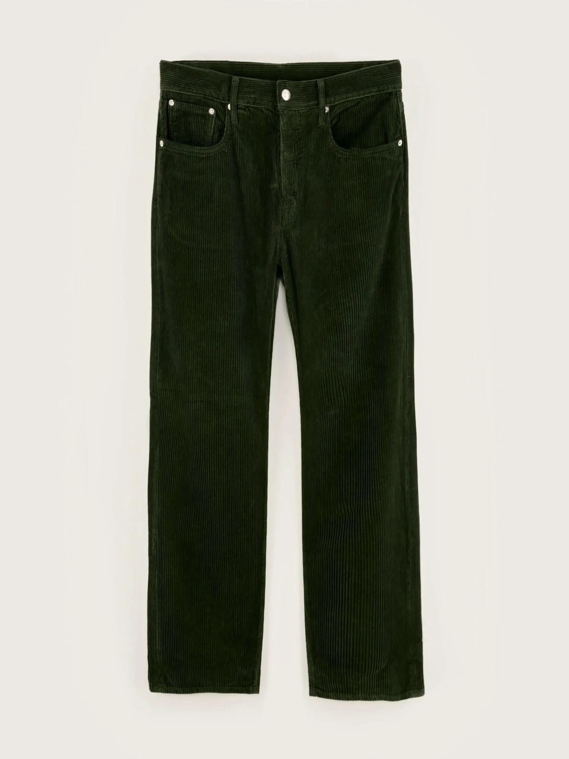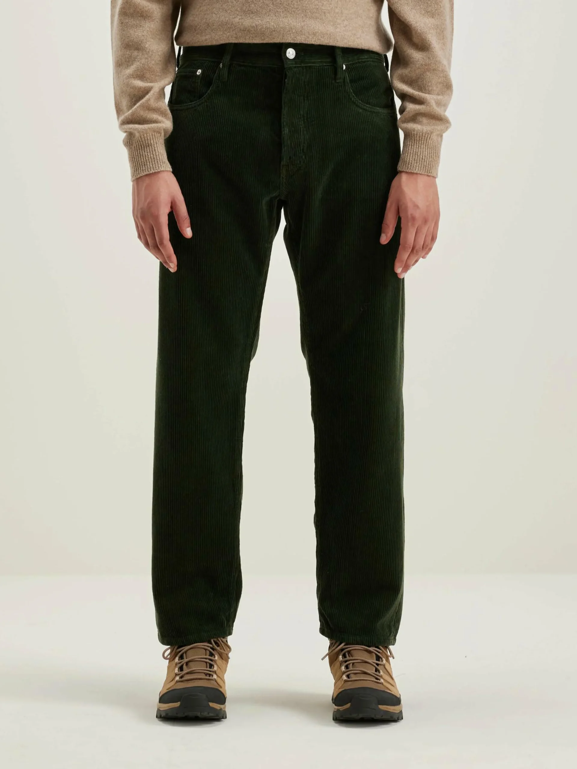 Pantalon 5 poches « dad style », taille basse et jambes droites, en velours de coton vert foncé.