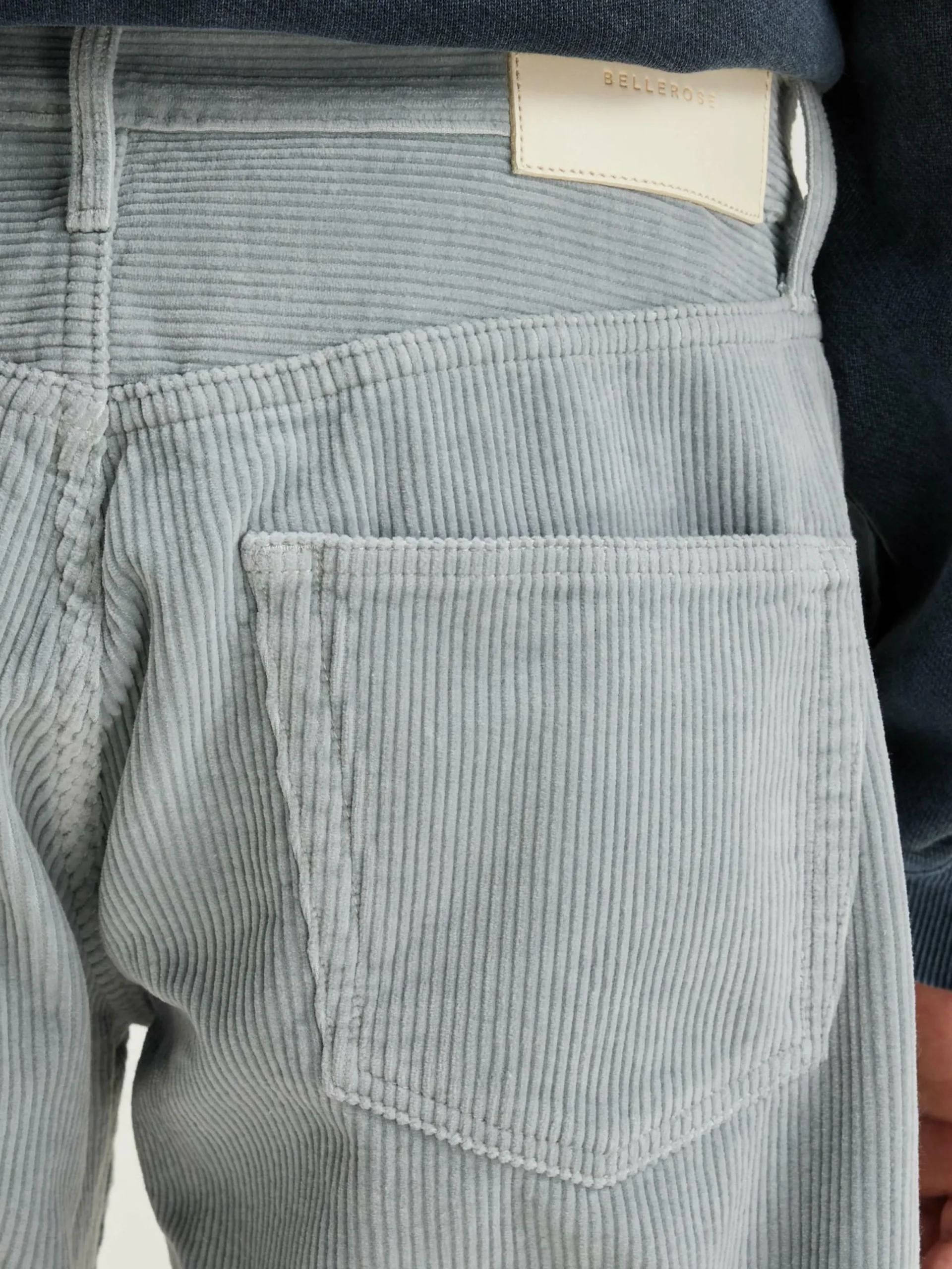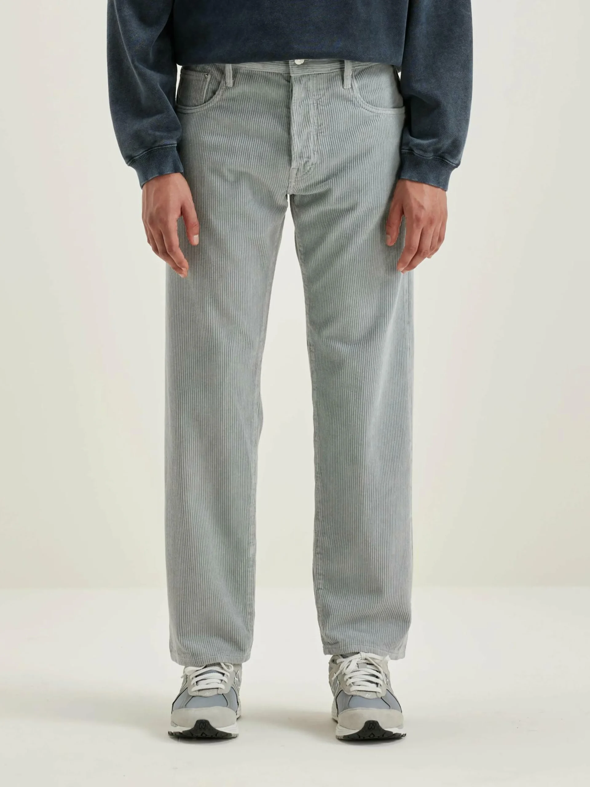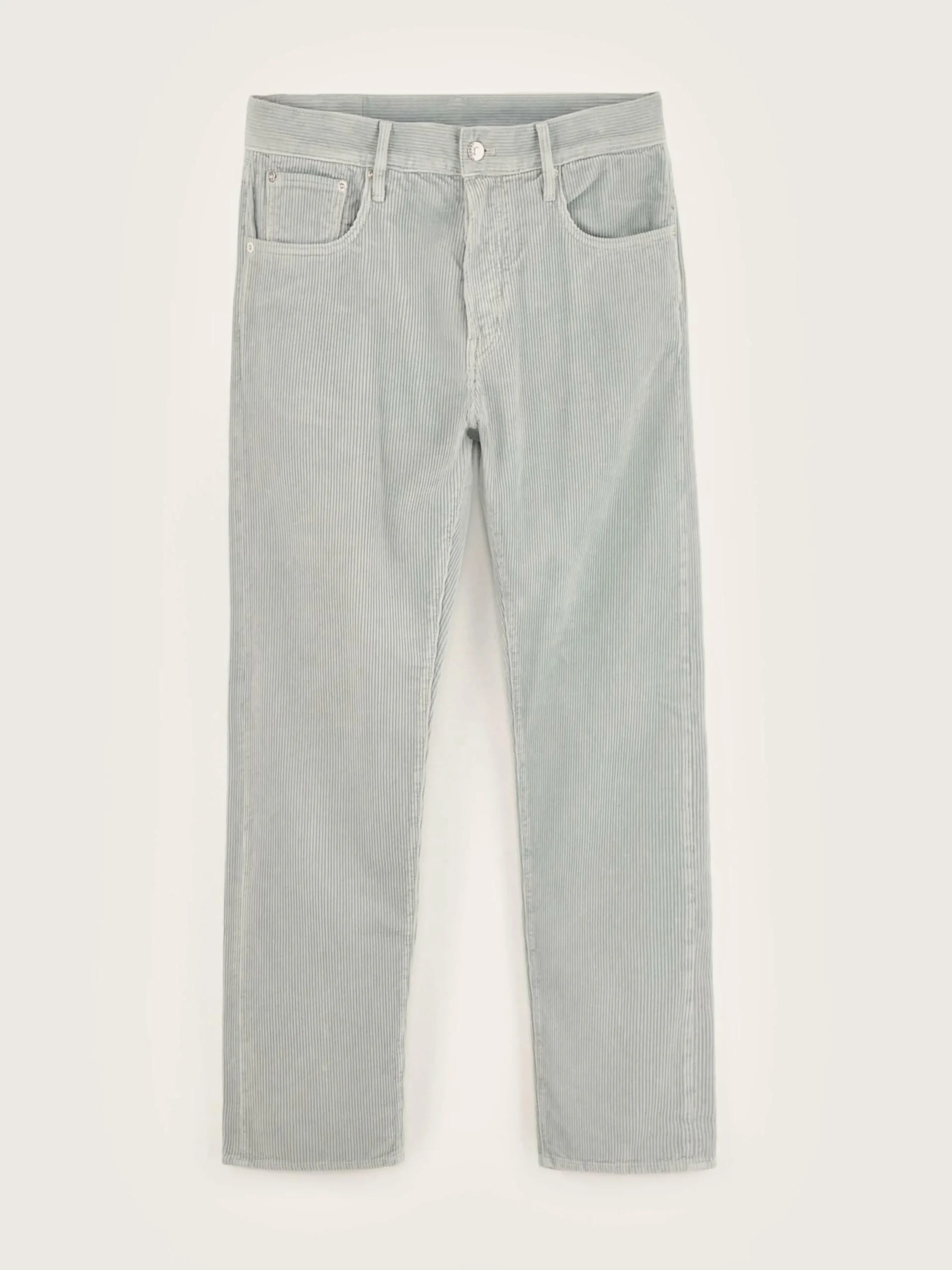 Pantalon 5 poches « dad style », taille basse et jambes droites, en velours de coton côtelé couleur bleu-gris.