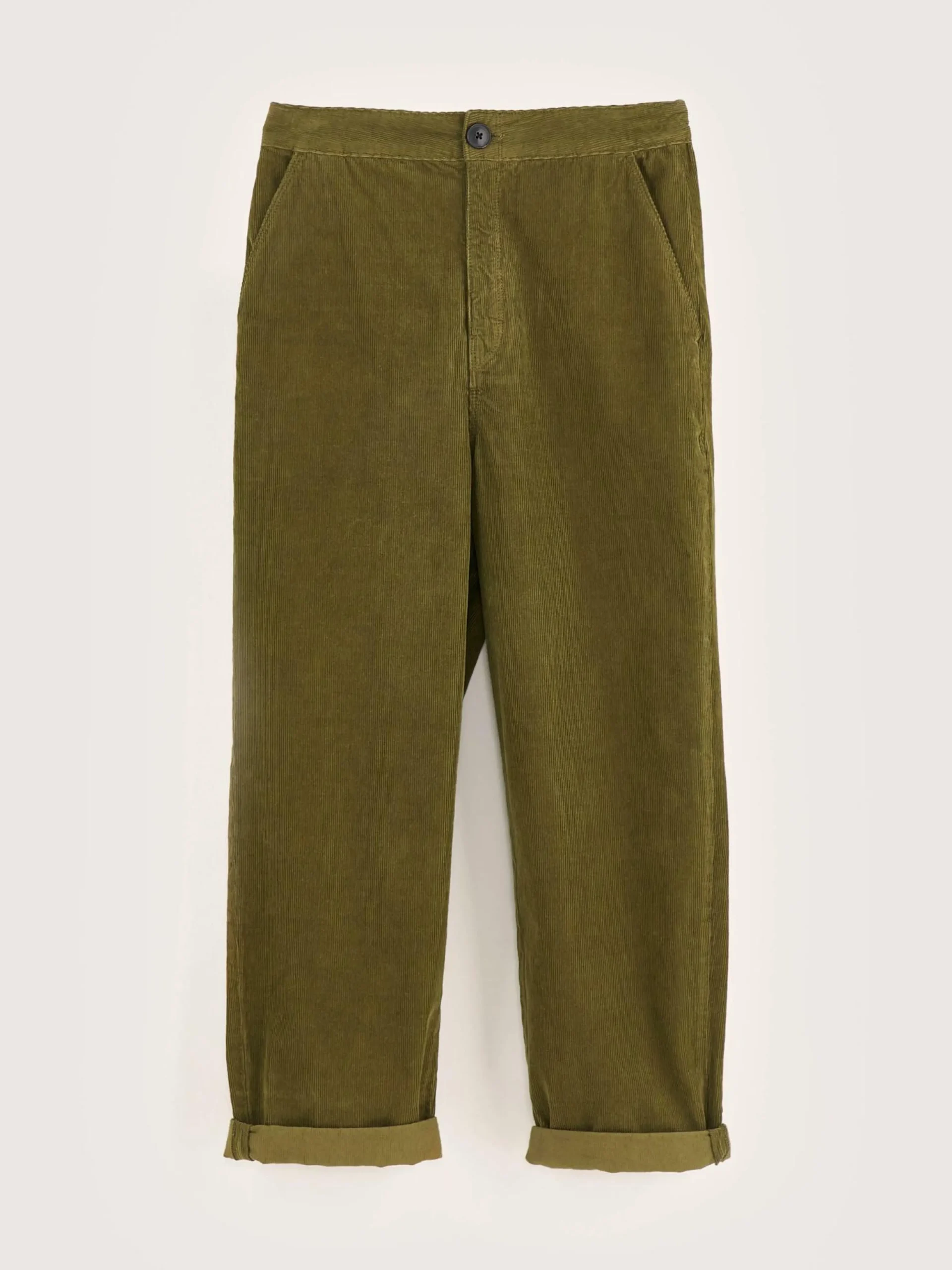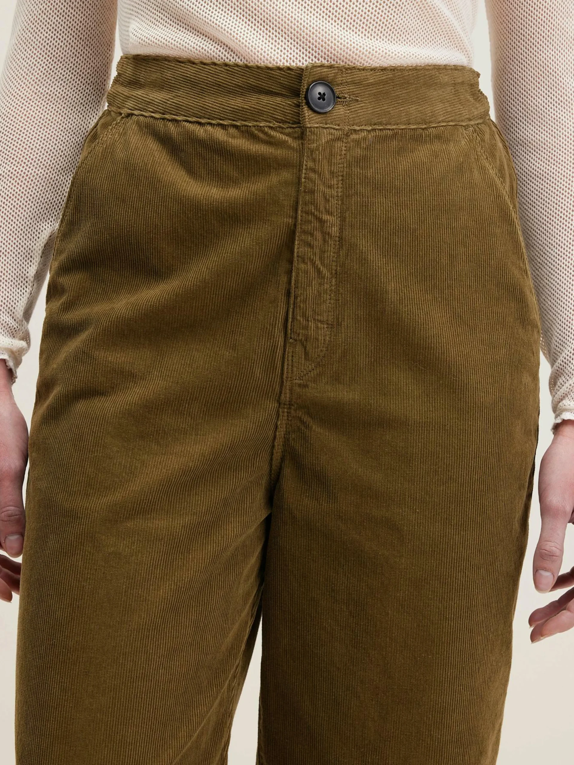 Pantalon décontracté en velours de coton côtelé couleur vert militaire.
