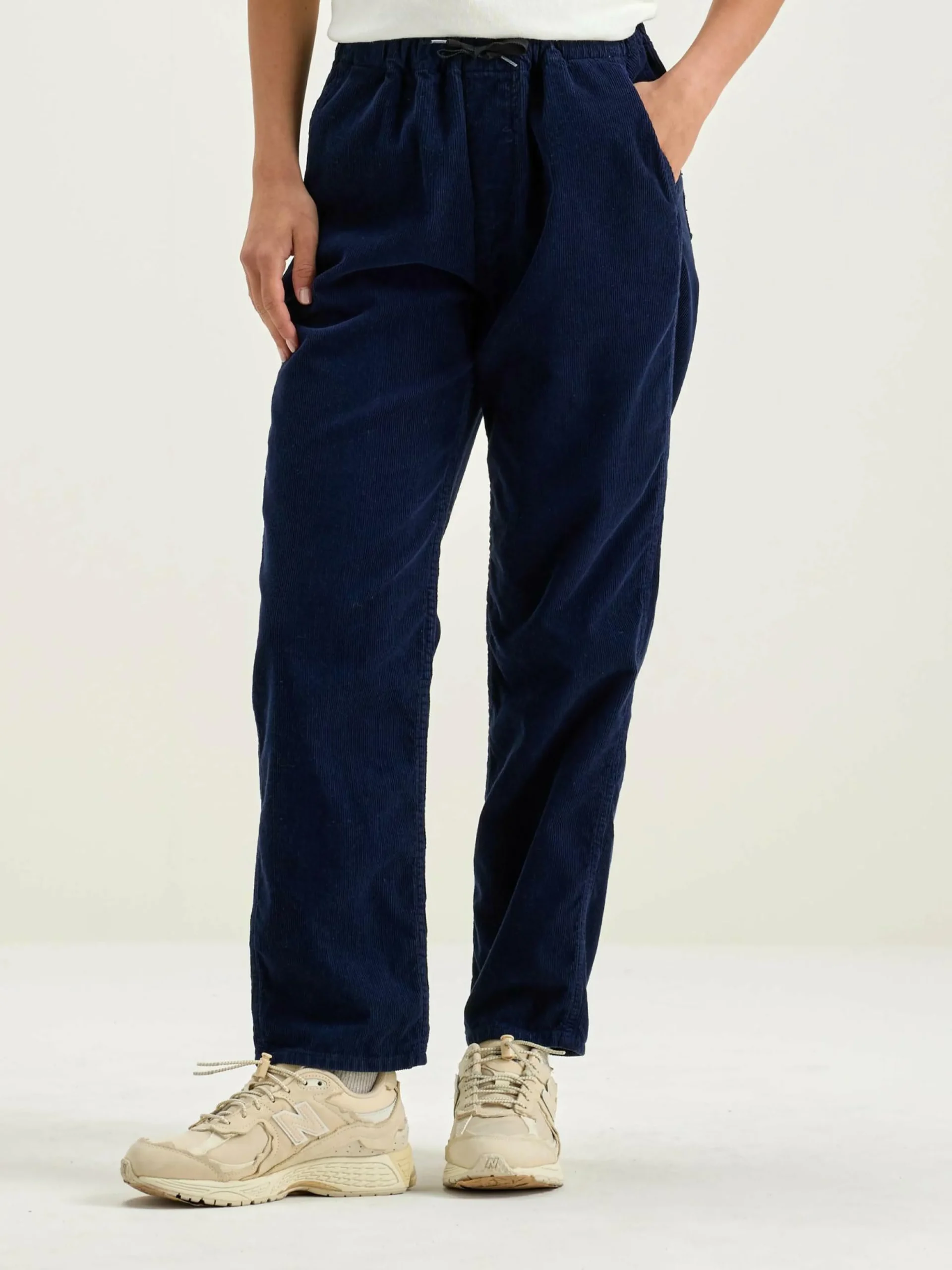 Pantalon décontracté à taille élastique en velours de coton côtelé couleur bleu marine.