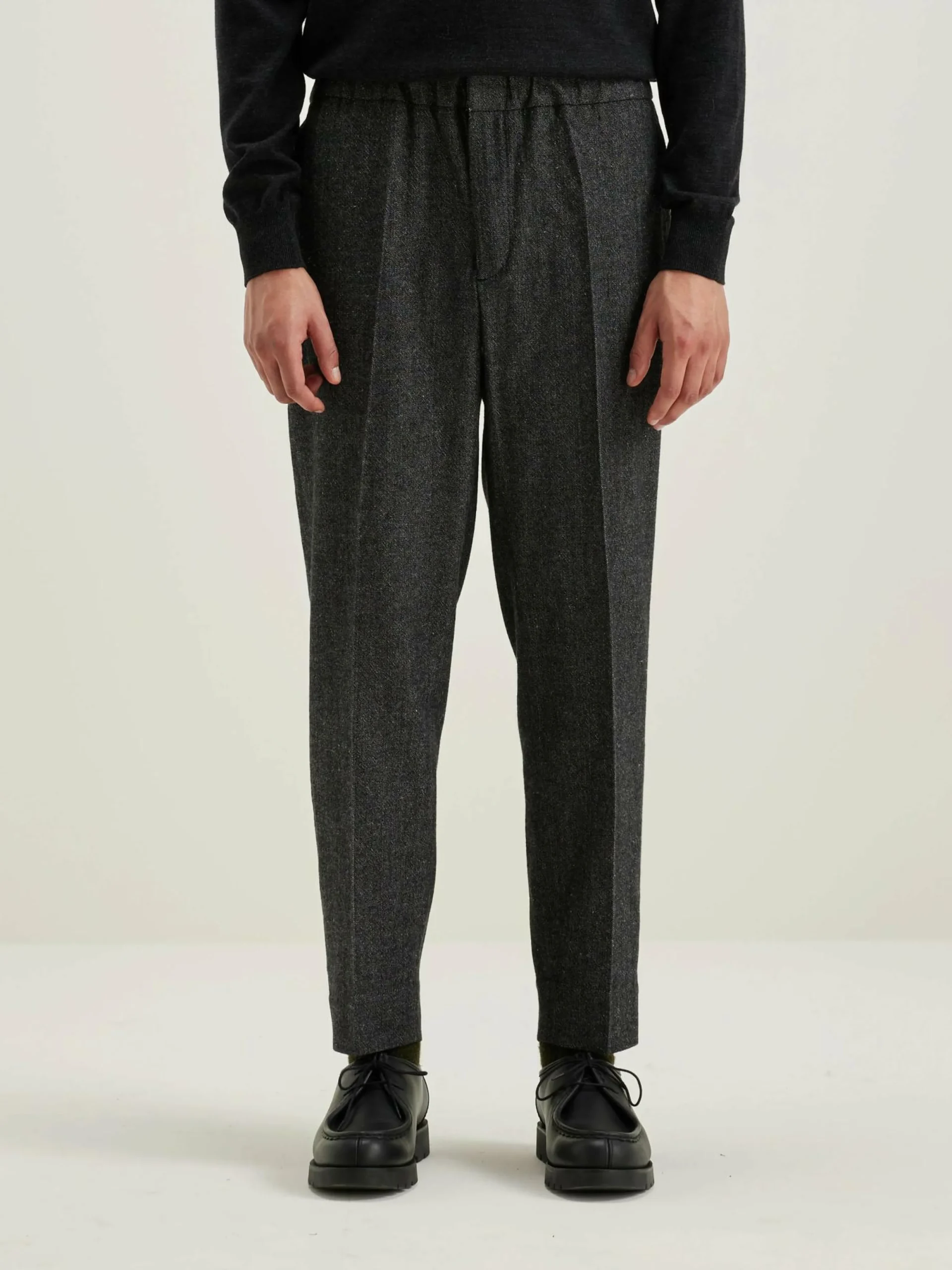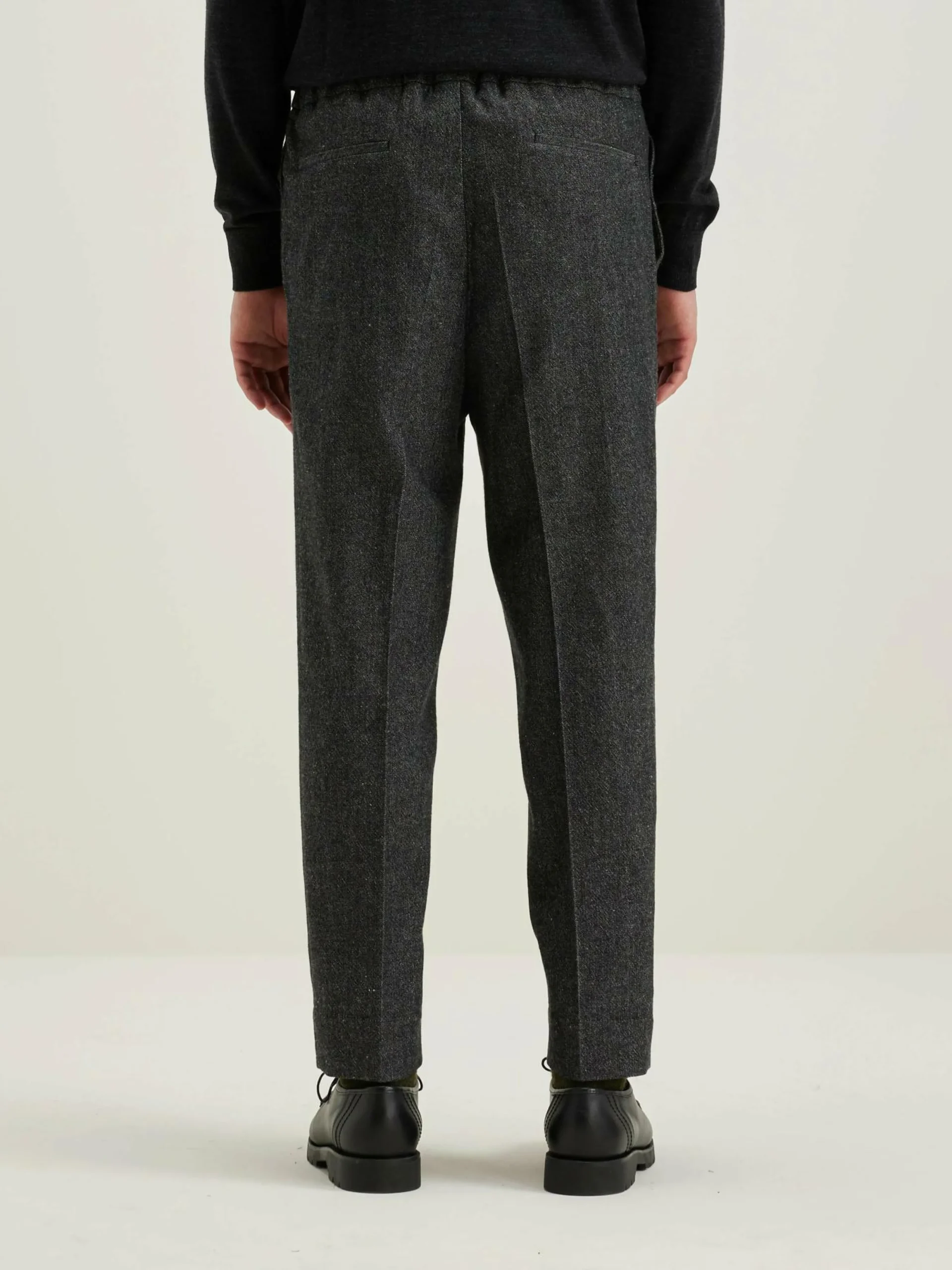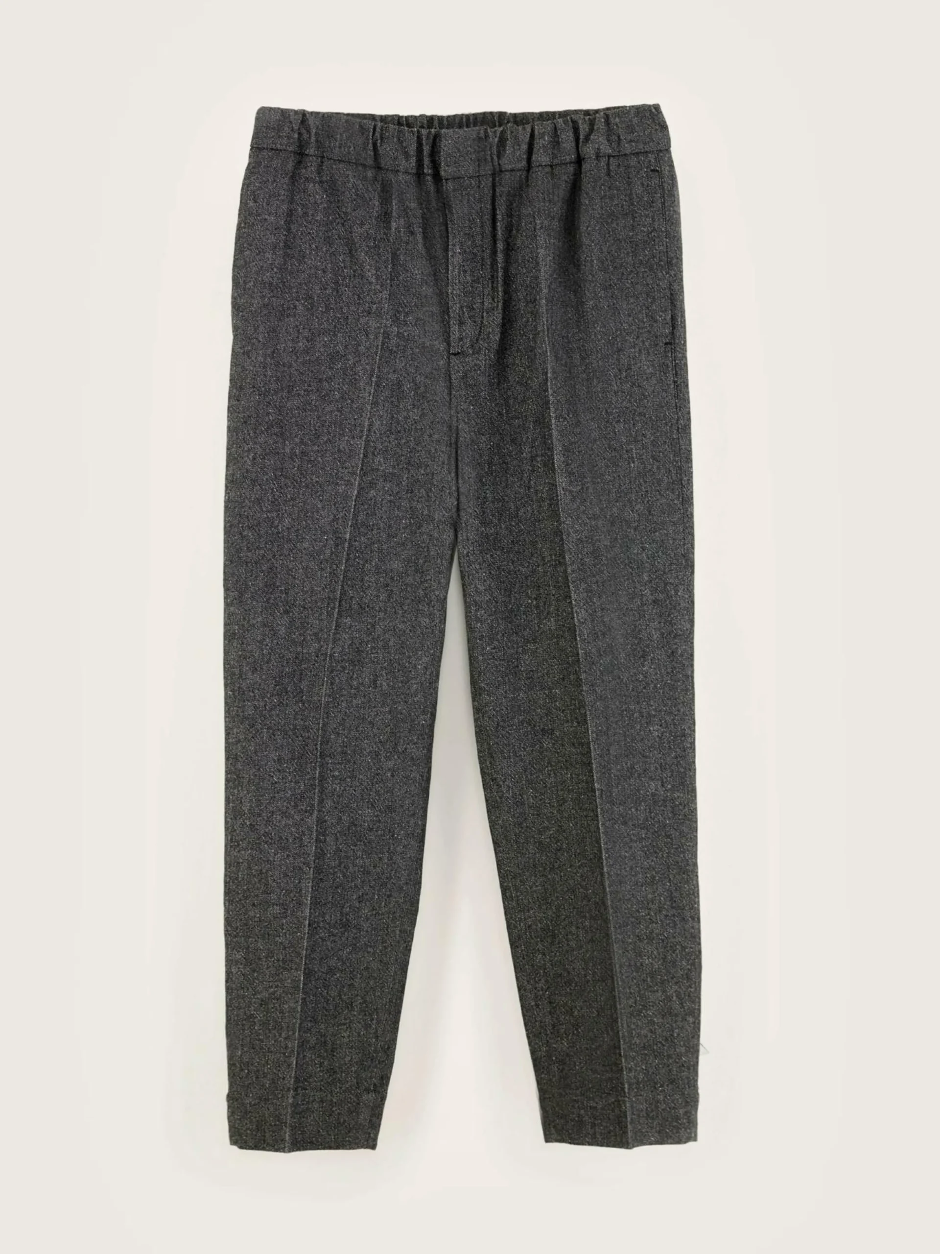 Pantalon décontracté, taille élastiquée et jambes larges et fuselées en tissu gris à motifs chevrons.