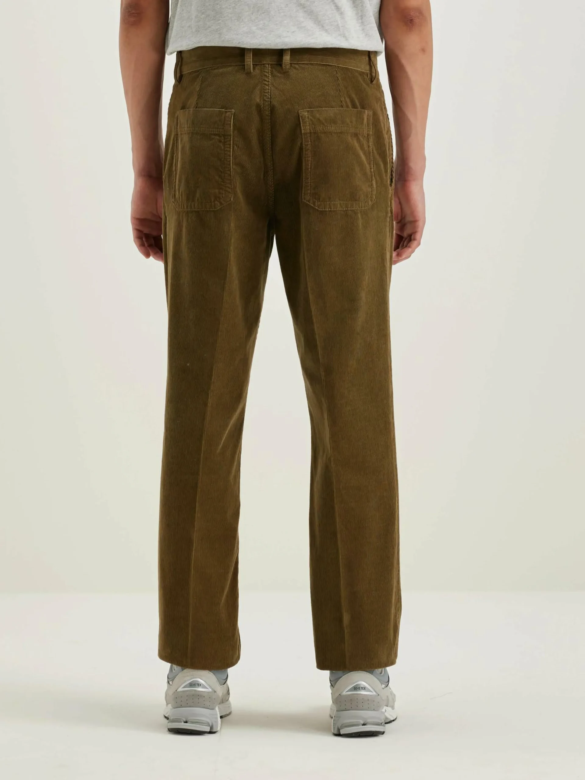 Pantalon coupe regular, jambes droites en velours de coton milleraie vert militaire.
