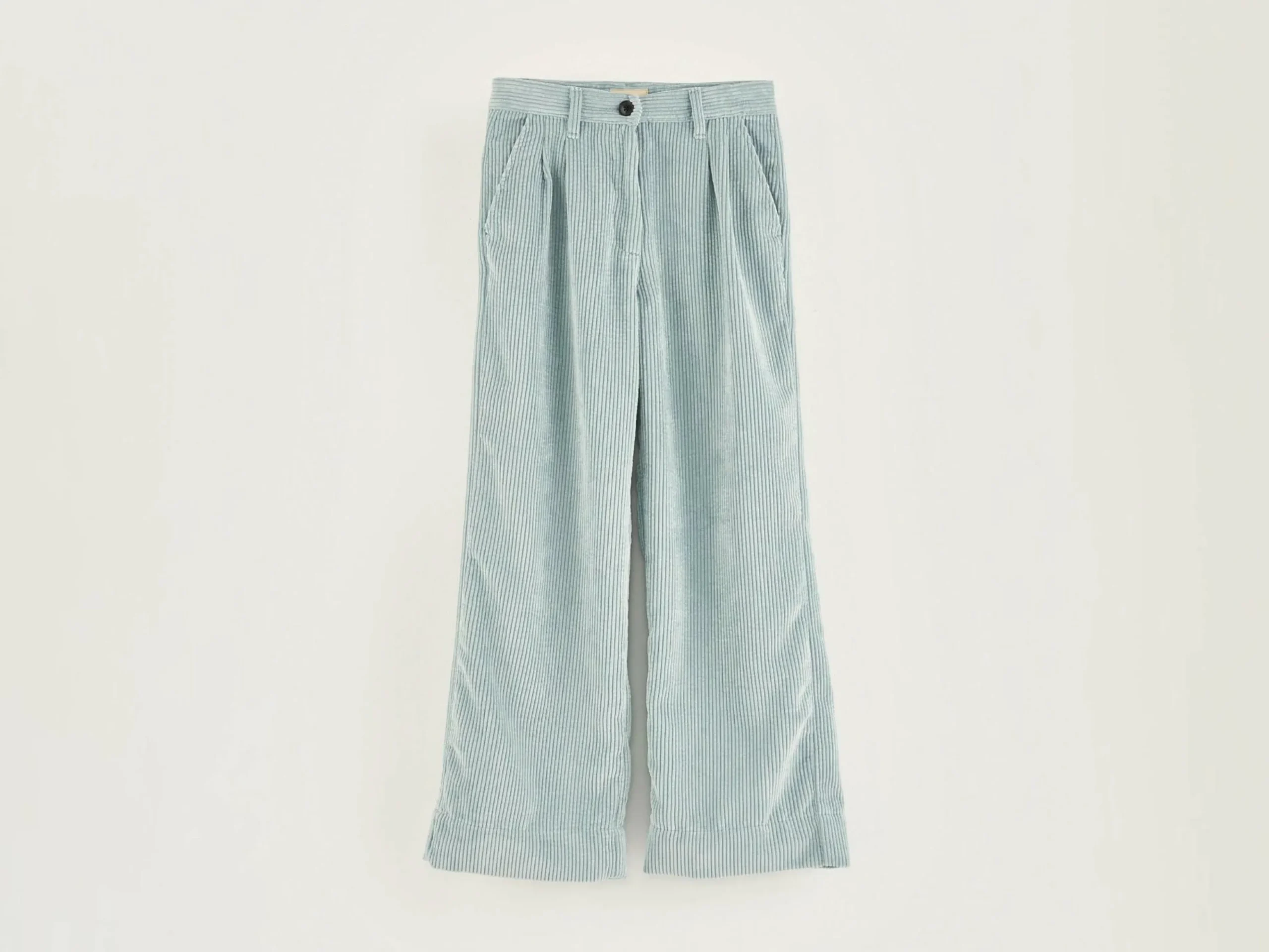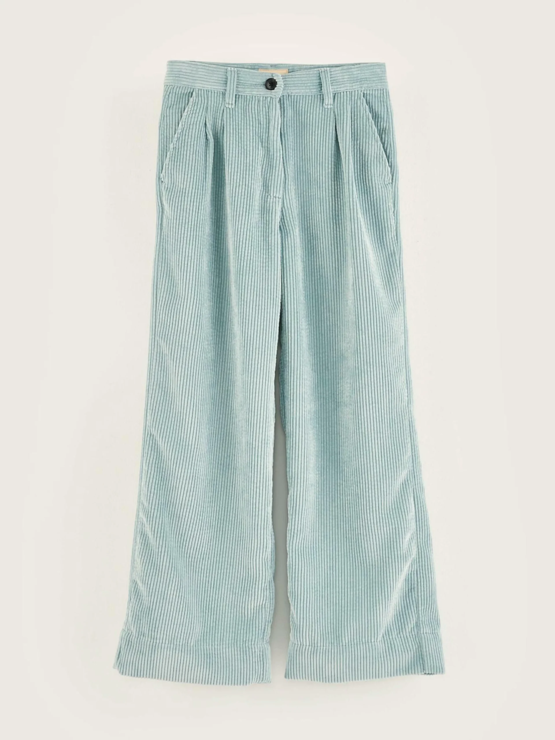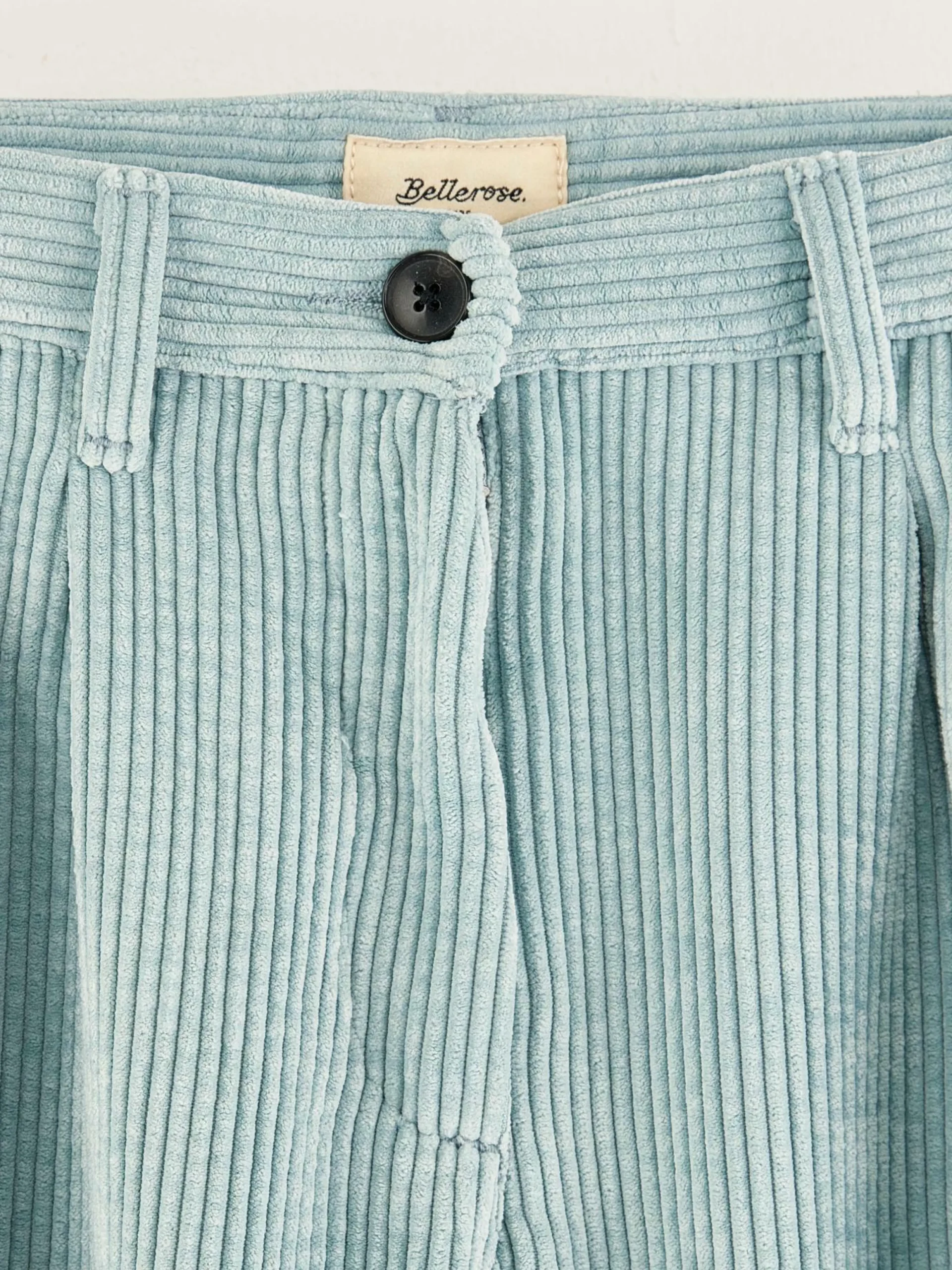 Pantalon de tailleur, taille haute en velours bleu à larges côtes.