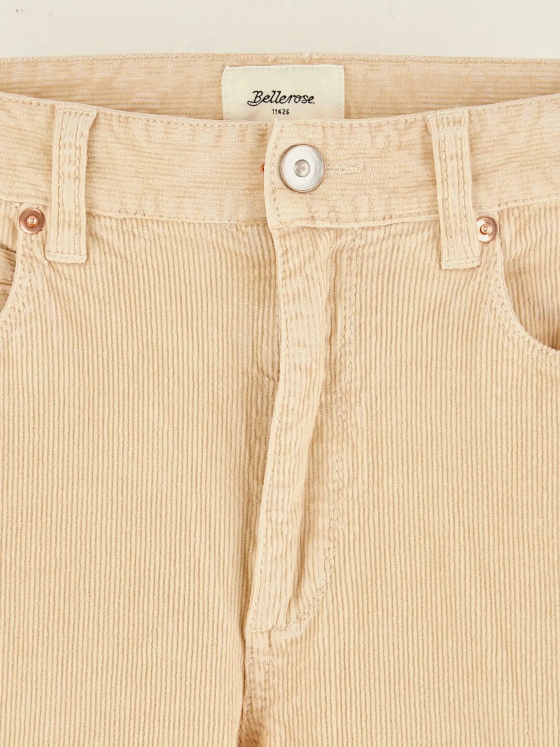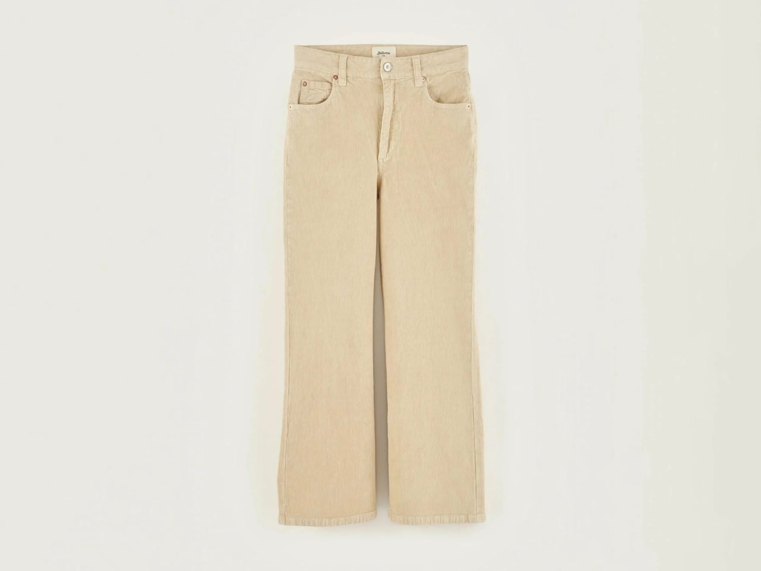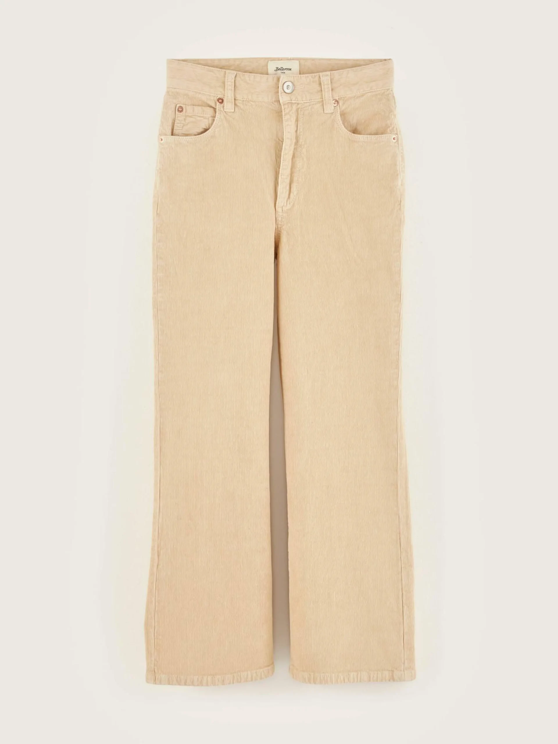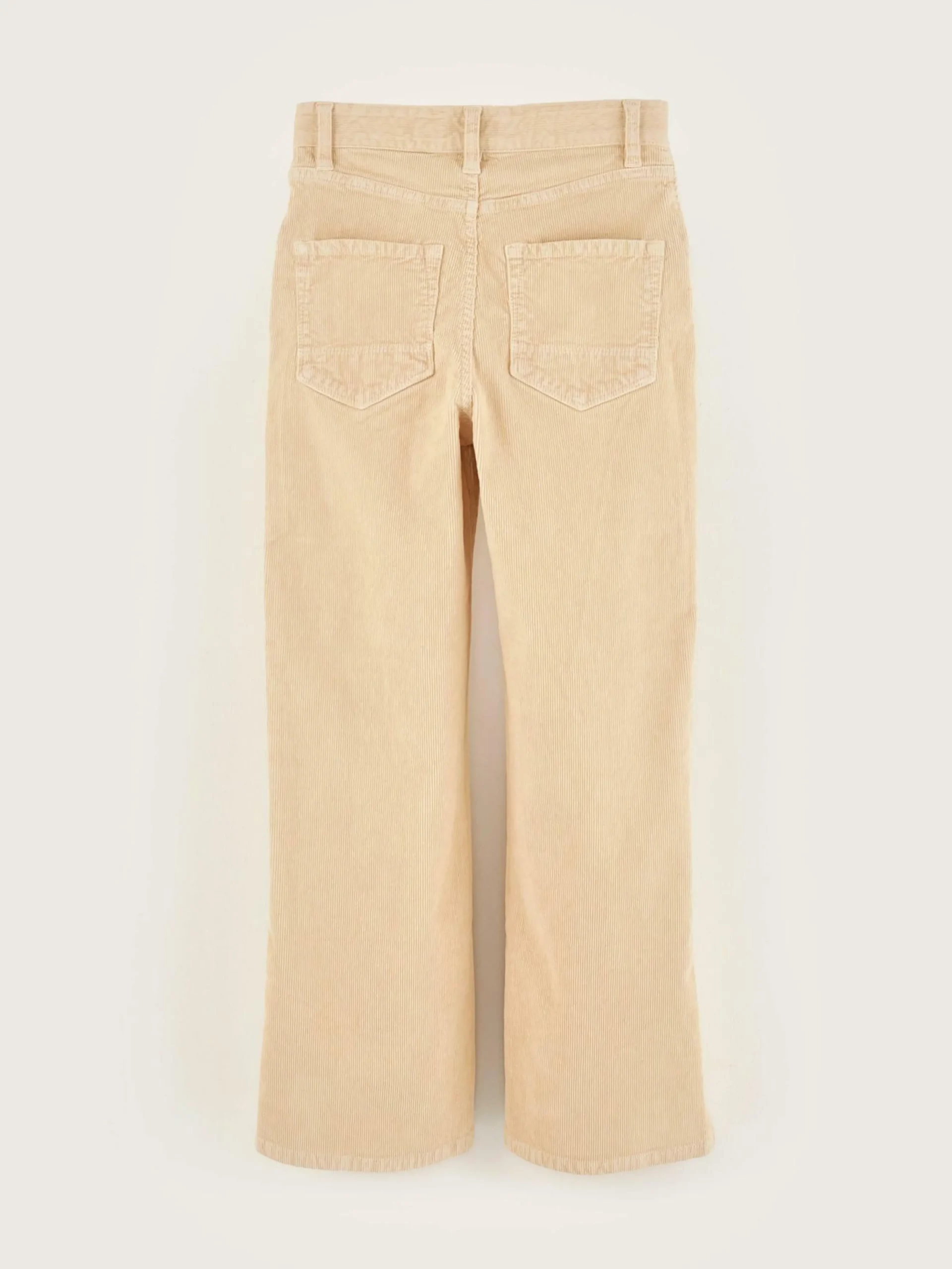 Pantalon taille haute, jambes flared en velours milleraies de couleur beige.