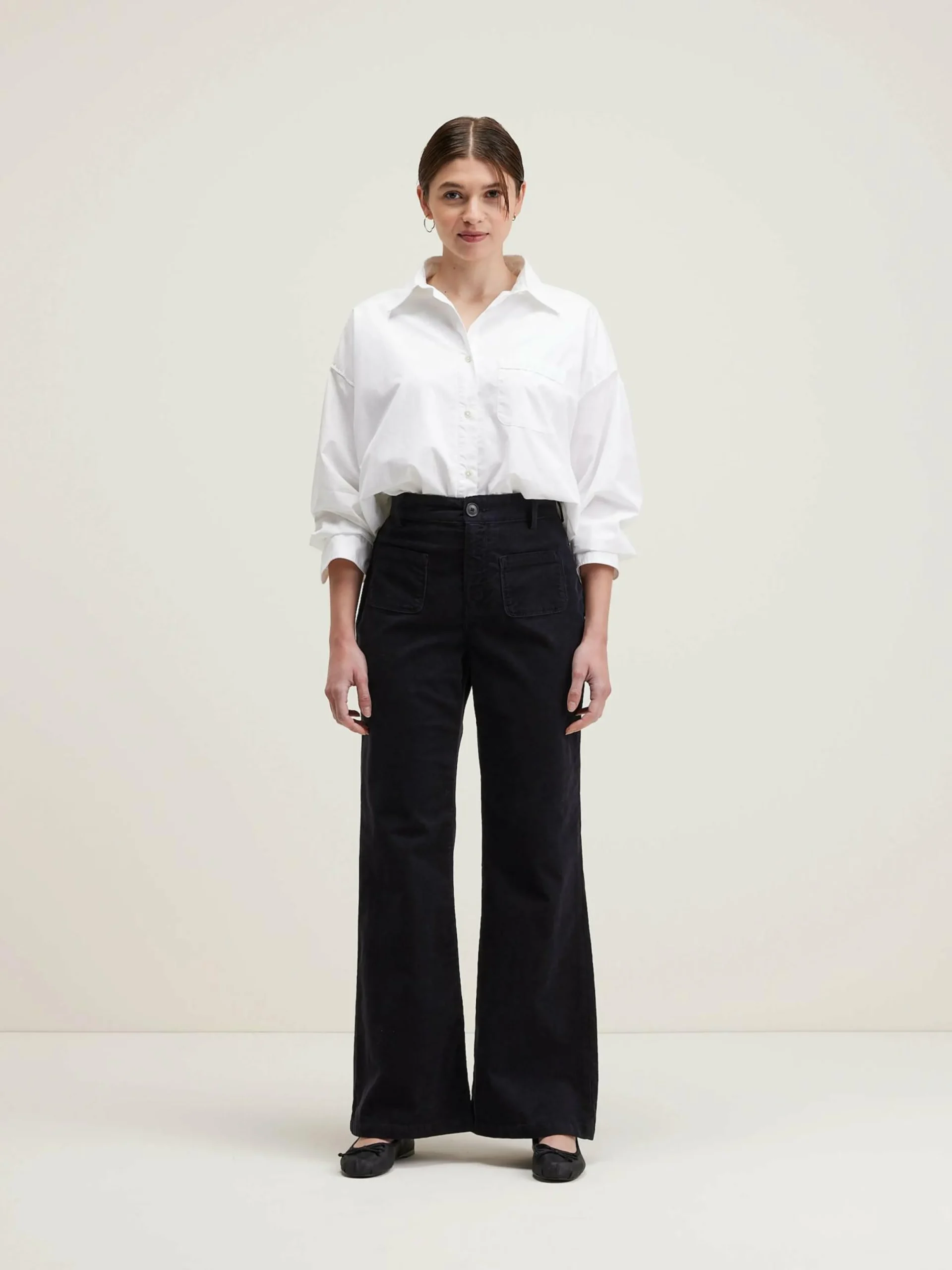 Pantalon taille haute, jambes flared en velours milleraies noir.