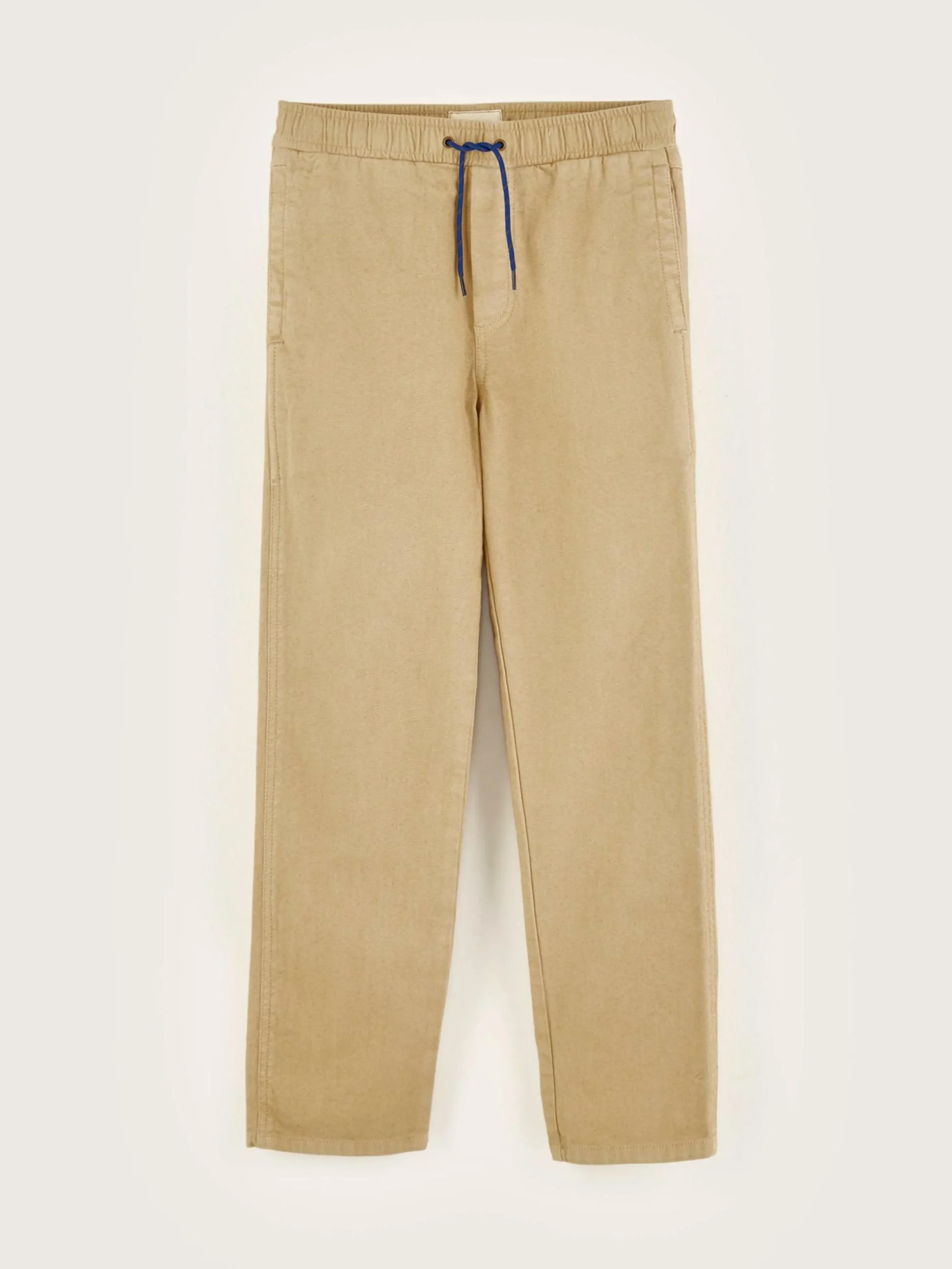 Pantalon décontracté en toile couleur greige, coupe fuselée et cordon de serrage à la taille.