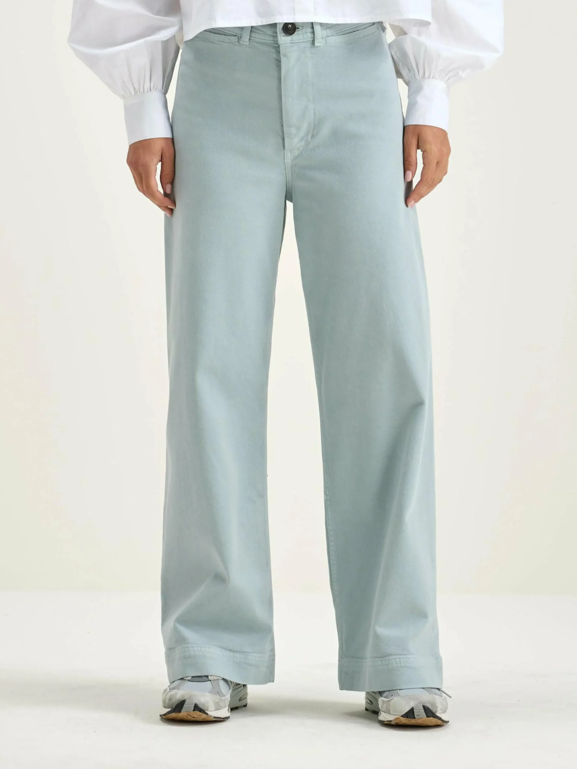 Pantalon taille haute, jambes larges, en sergé gris-bleu.