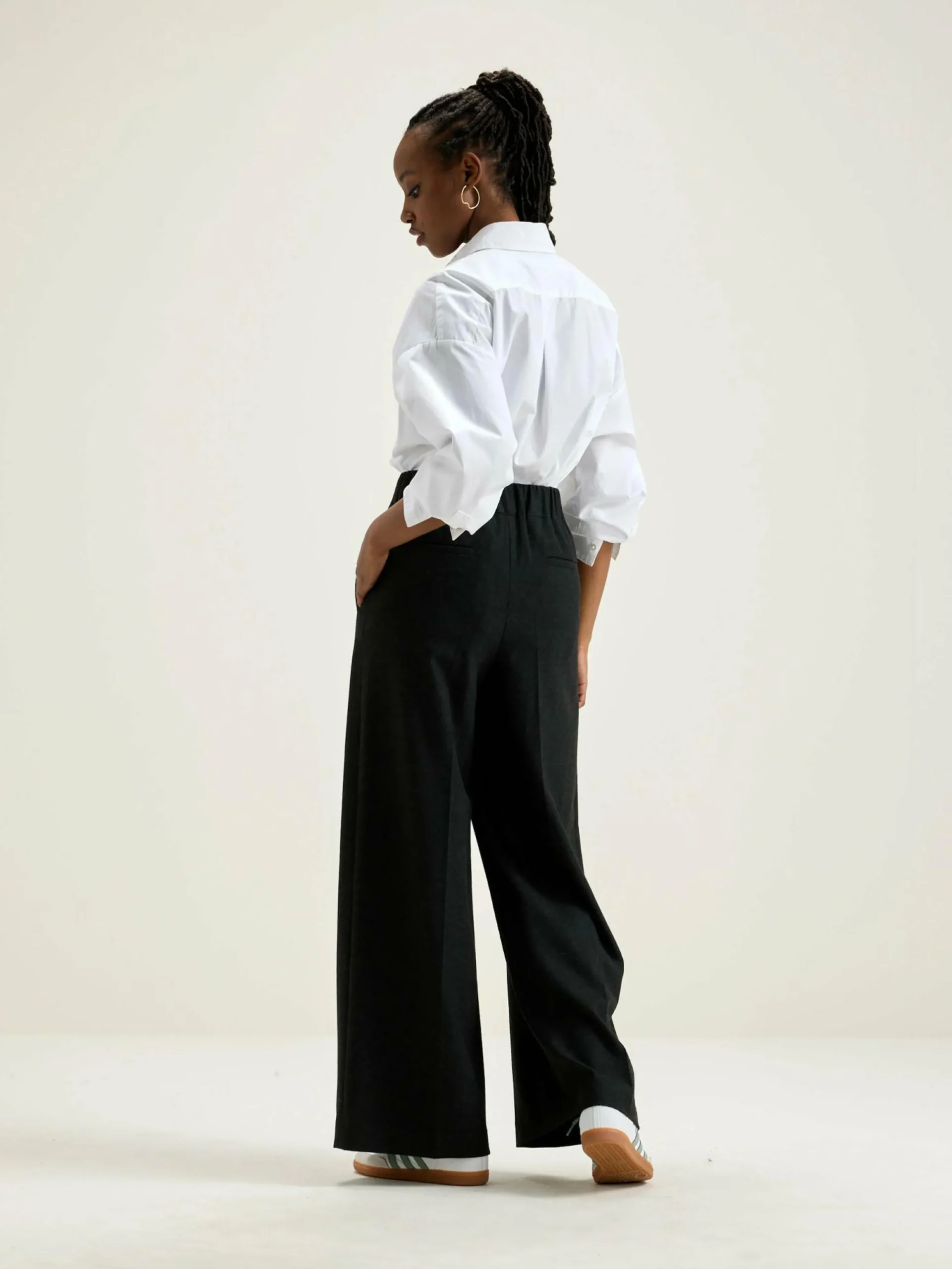 Pantalon à jambes larges, taille élastique et poches passepoilées, couleur gris anthracite.