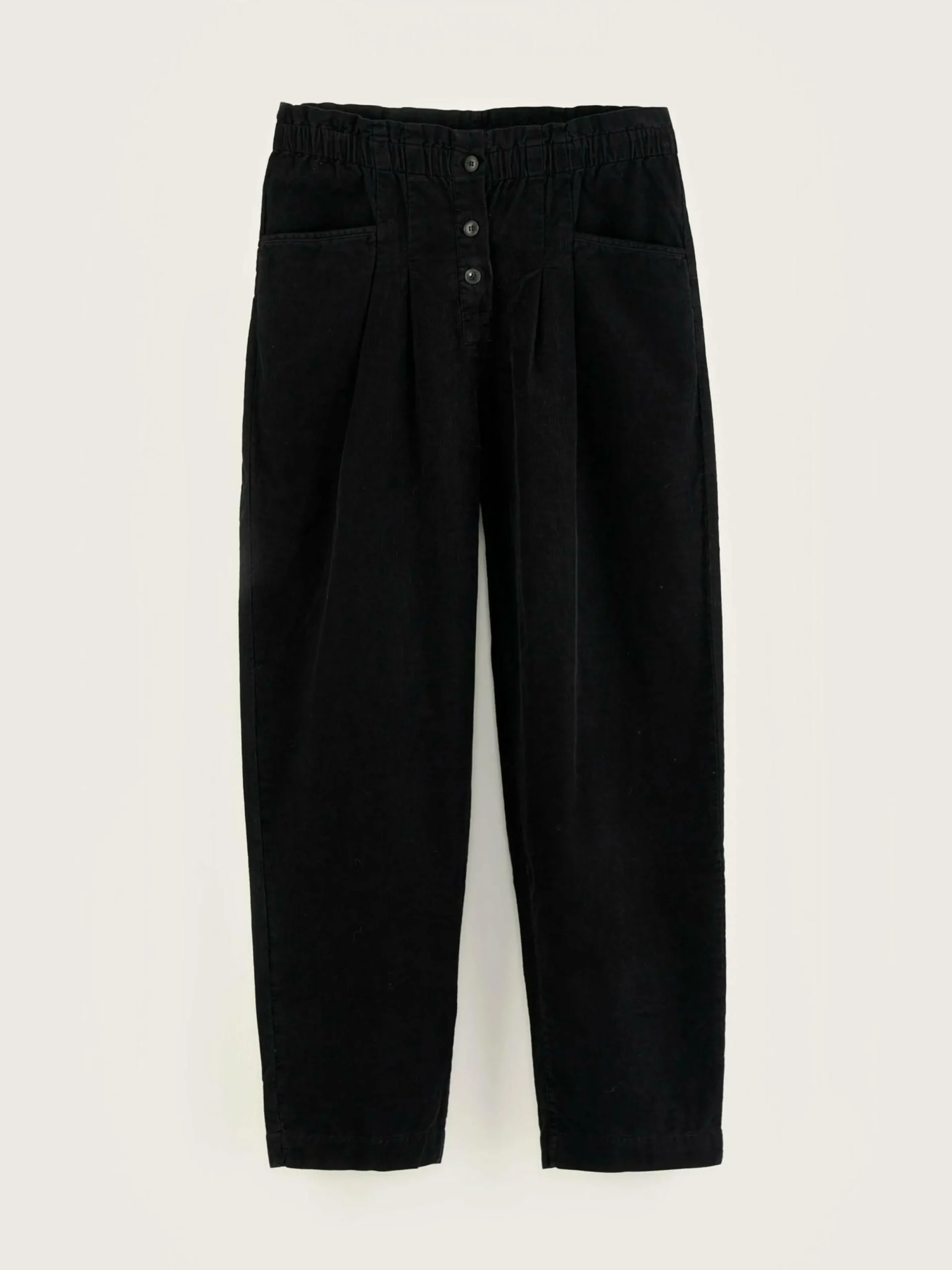 Pantalon taille haute et élastiquée et jambes fuselées décontractées en toile de lin et coton noire.