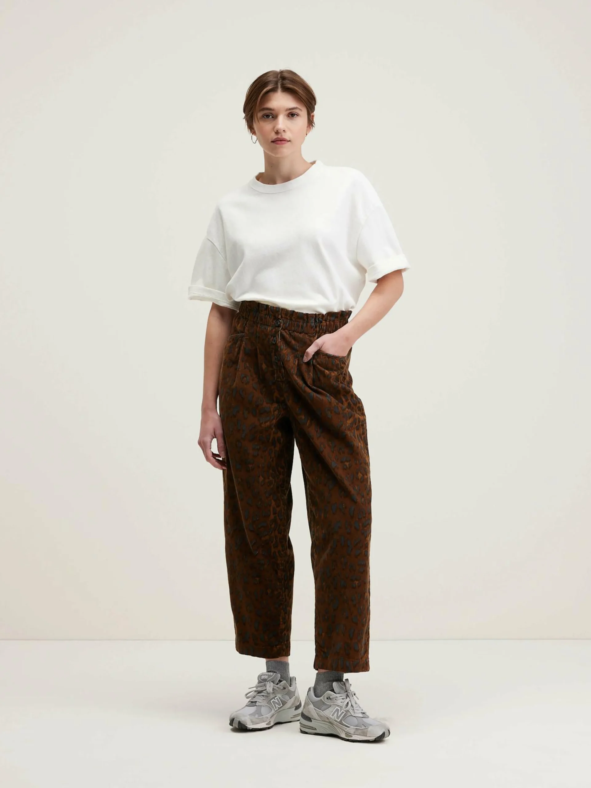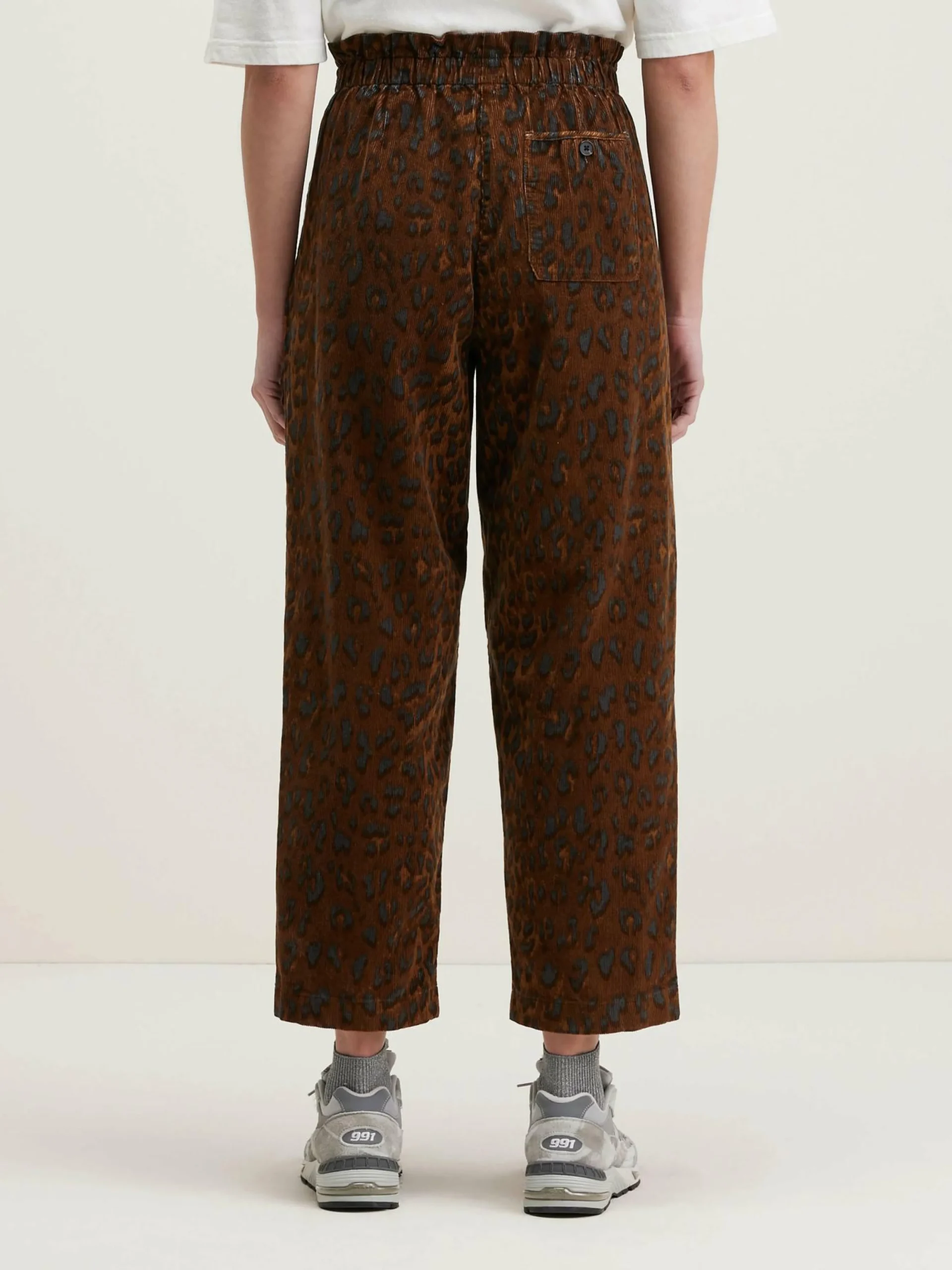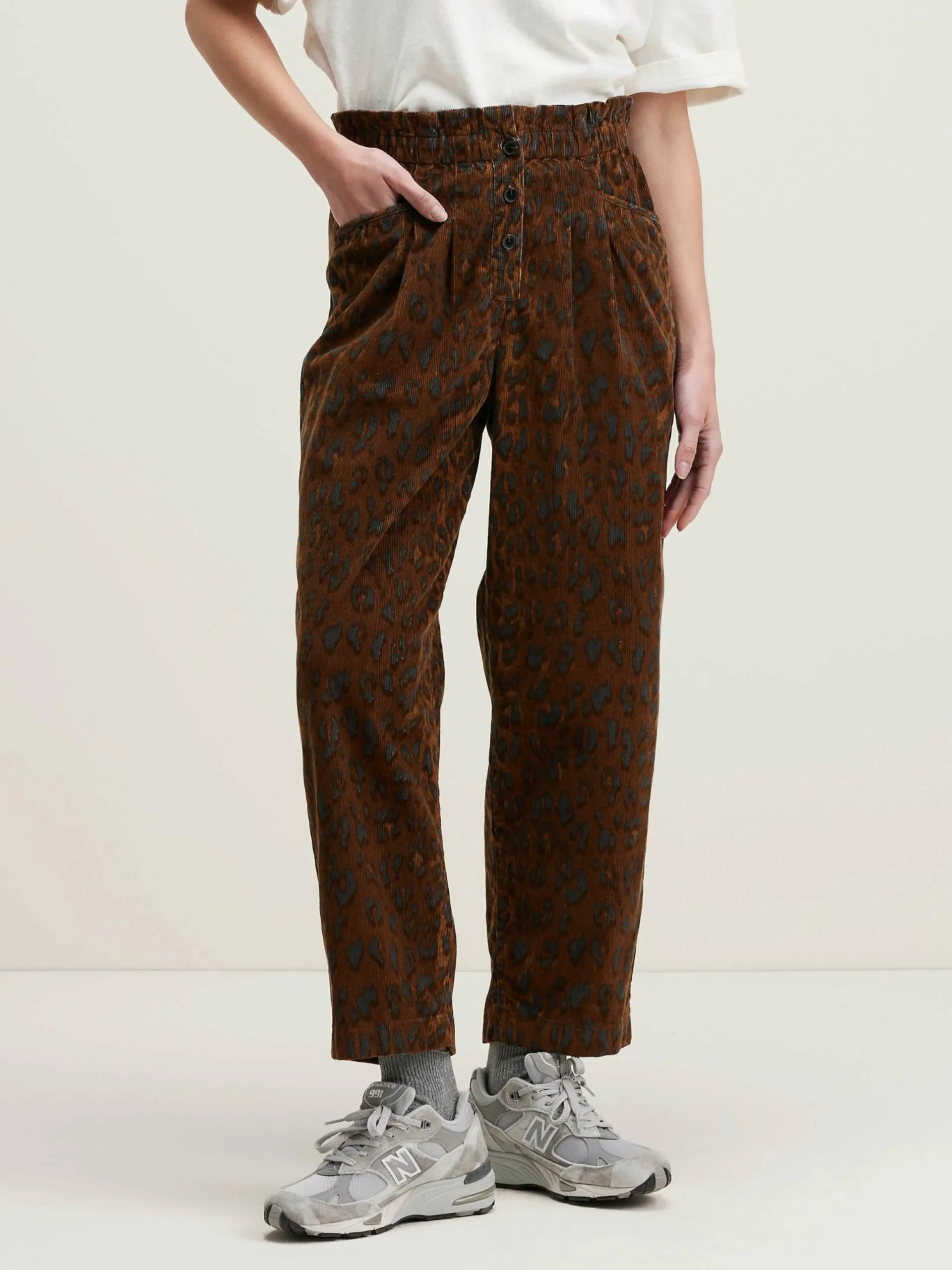 Pantalon « paperbag » en velours de coton milleraies imprimé léopard.
