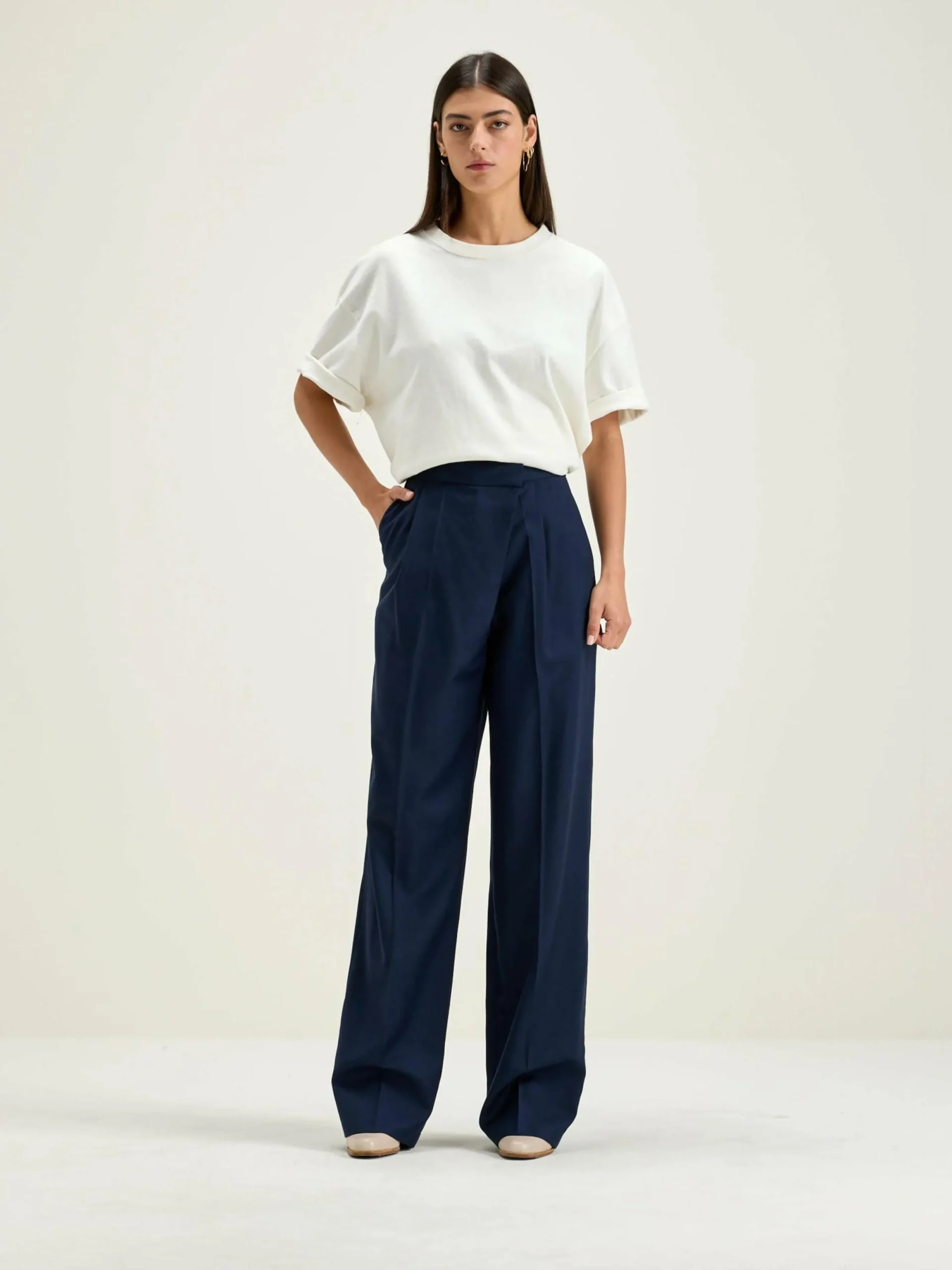 Pantalon de tailleur en laine bleu marine, taille haute avec avant drapé et croisé et jambes droites.