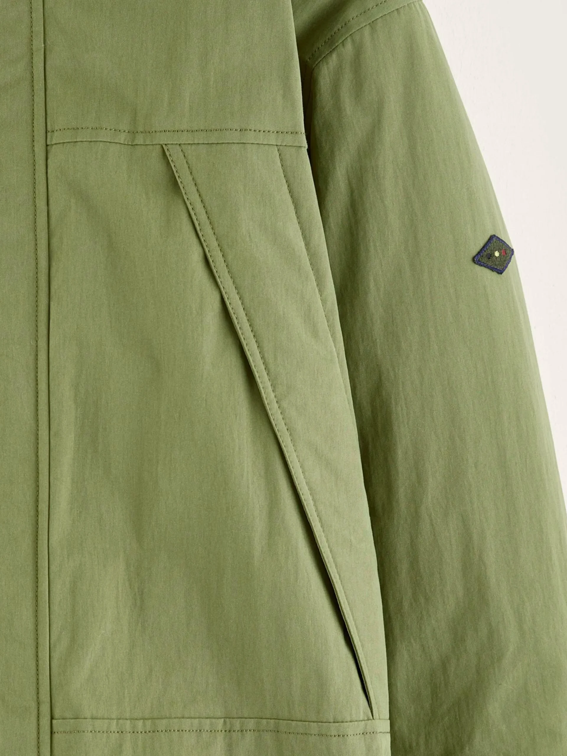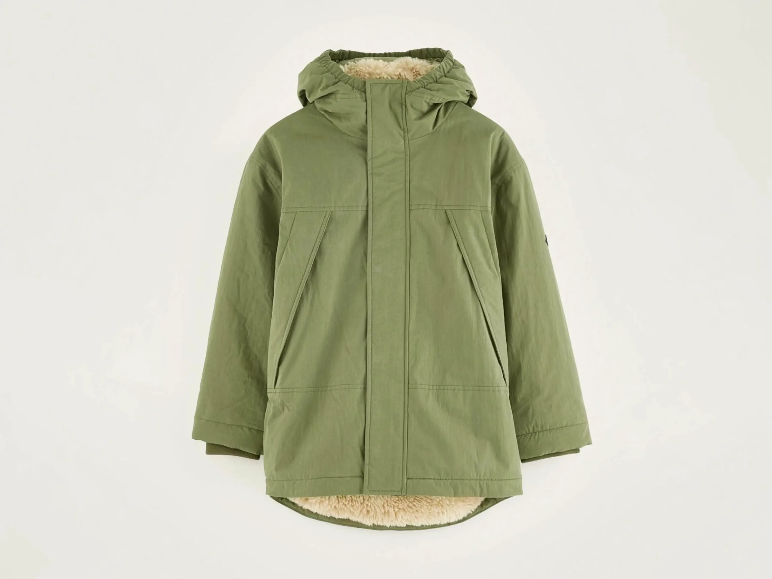Parka à capuche kaki, coupe classique, poches obliques zippées et doublure en fausse fourrure.