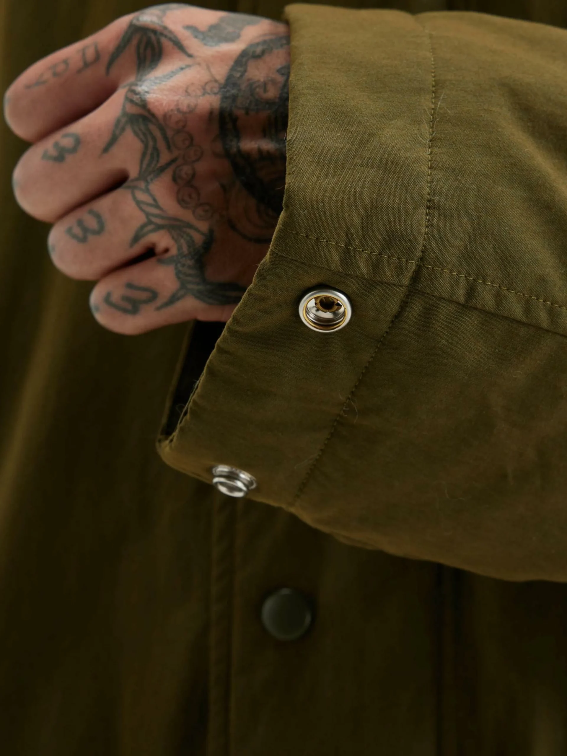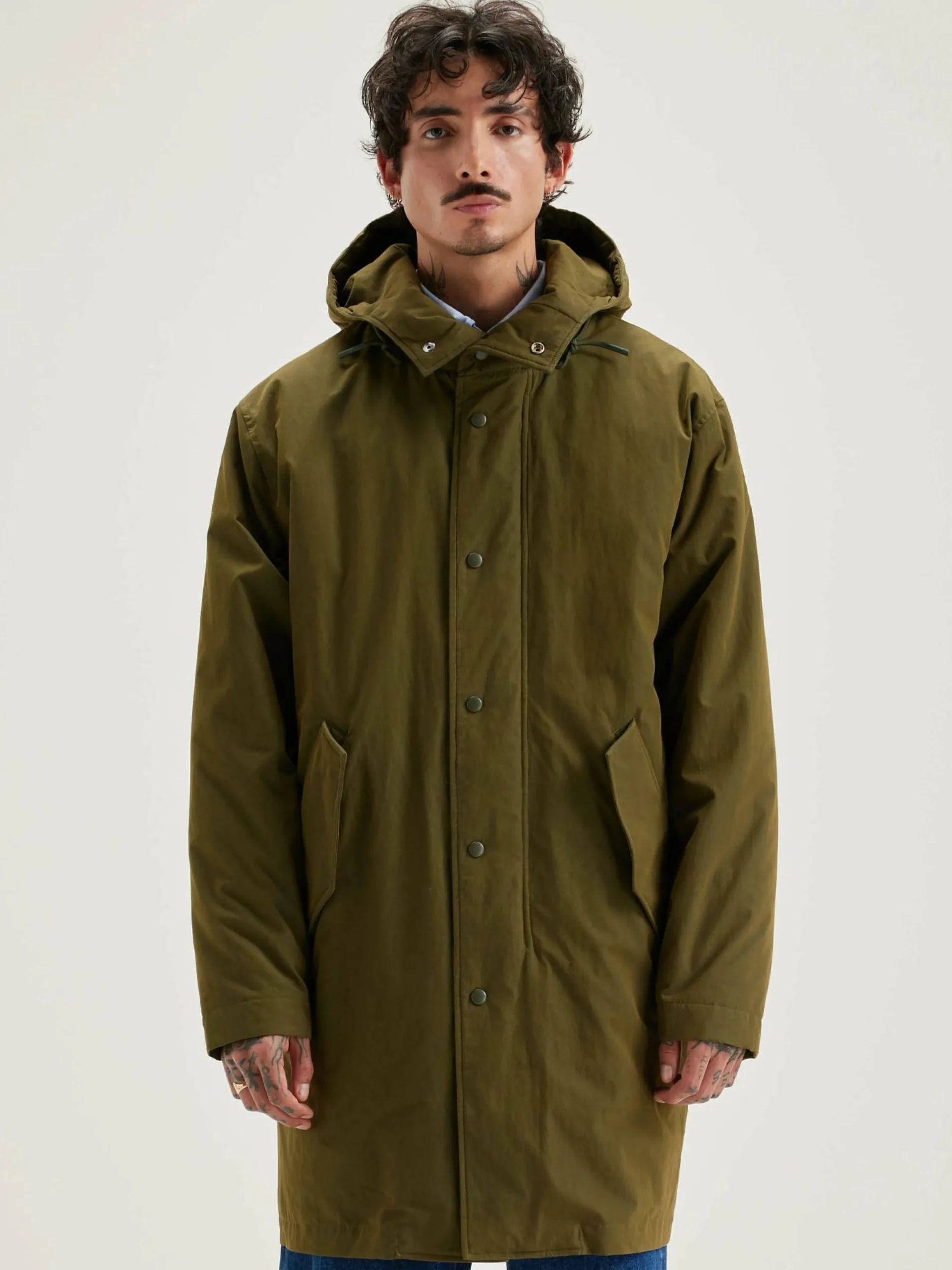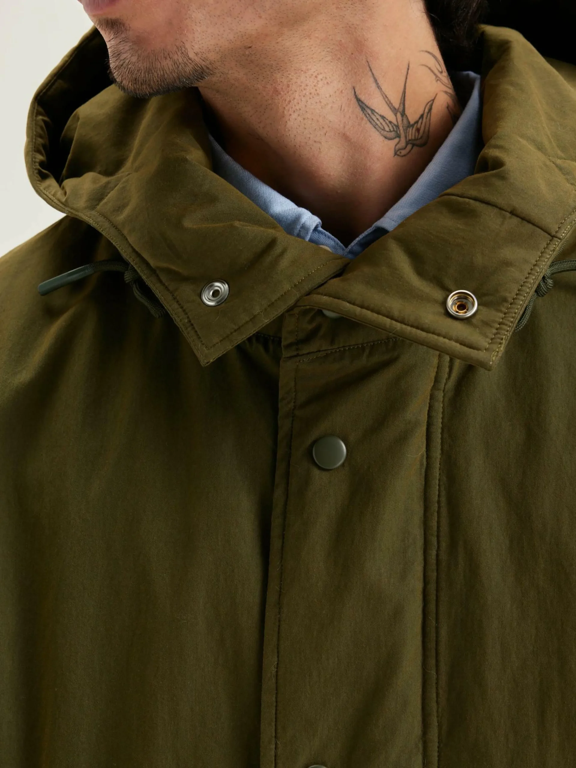 Parka à capuche coupe classique en toile vert olive avec doublure en teddy.