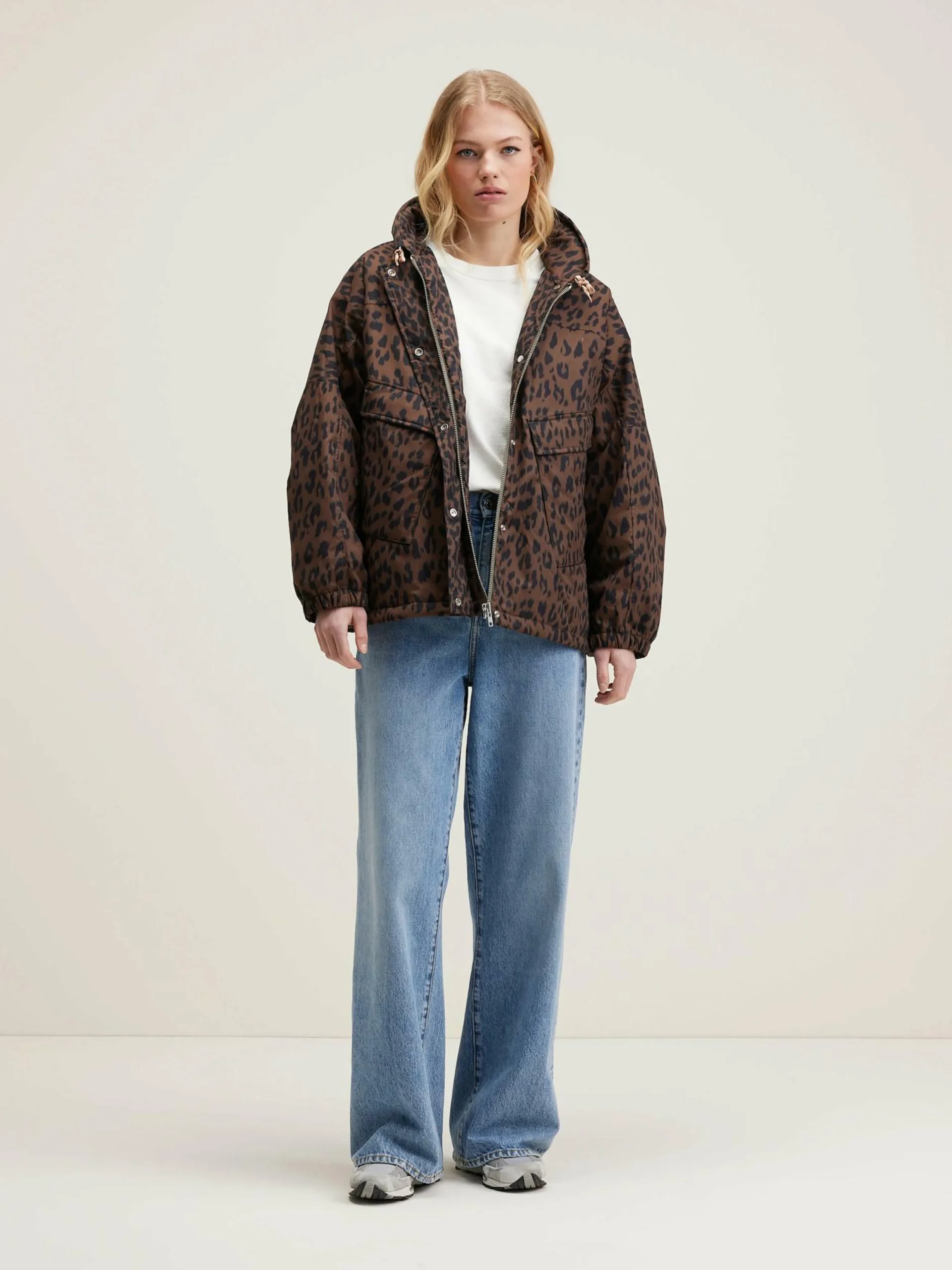 Parka oversize imprimée léopard avec grandes poches plaquées et capuche repliable.
