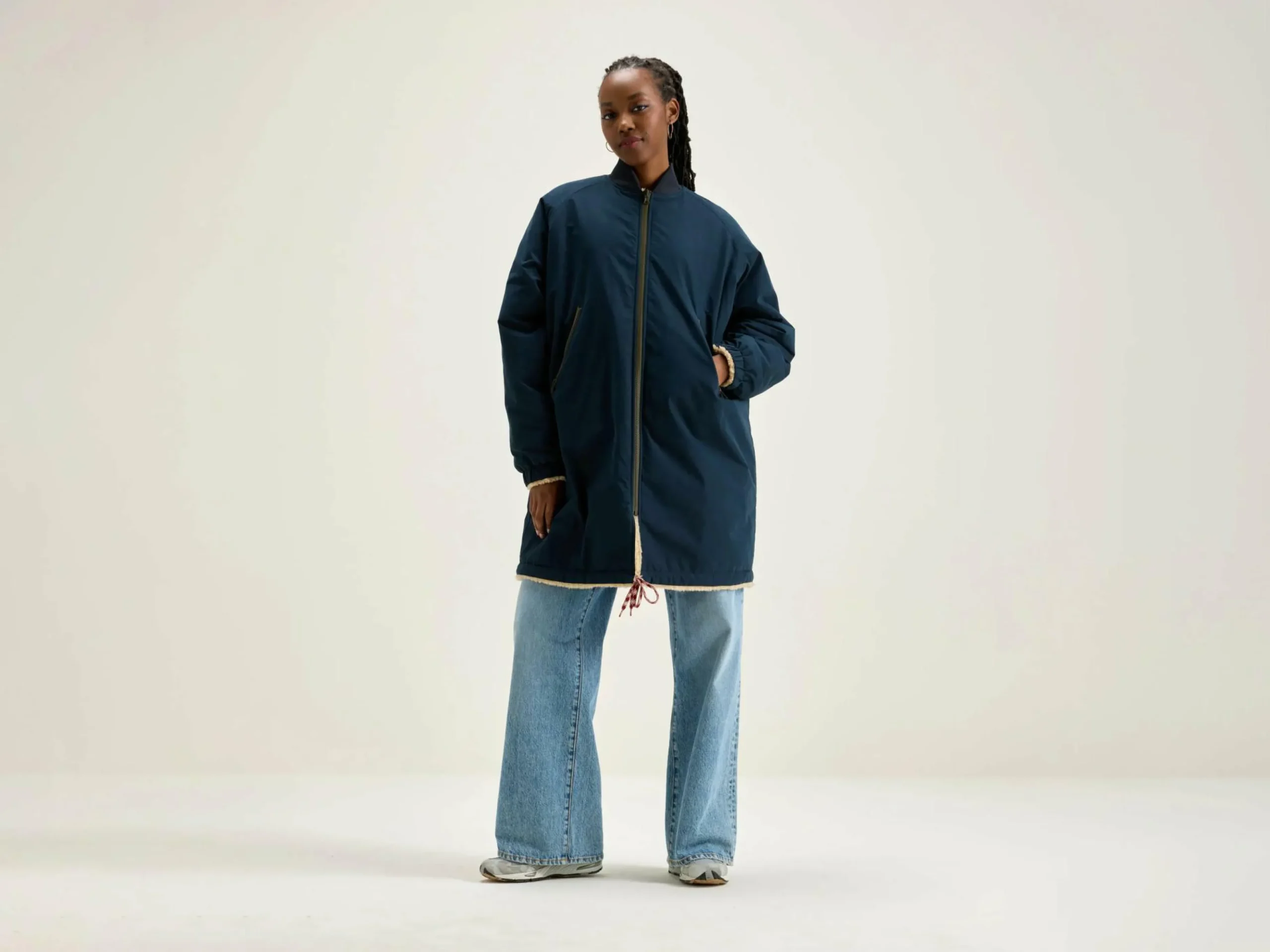 Parka oversize réversible bleu avec poches zippées. Un côté est en tissu matelassé bleu marine, tandis que l’autre est en fausse fourrure beige.