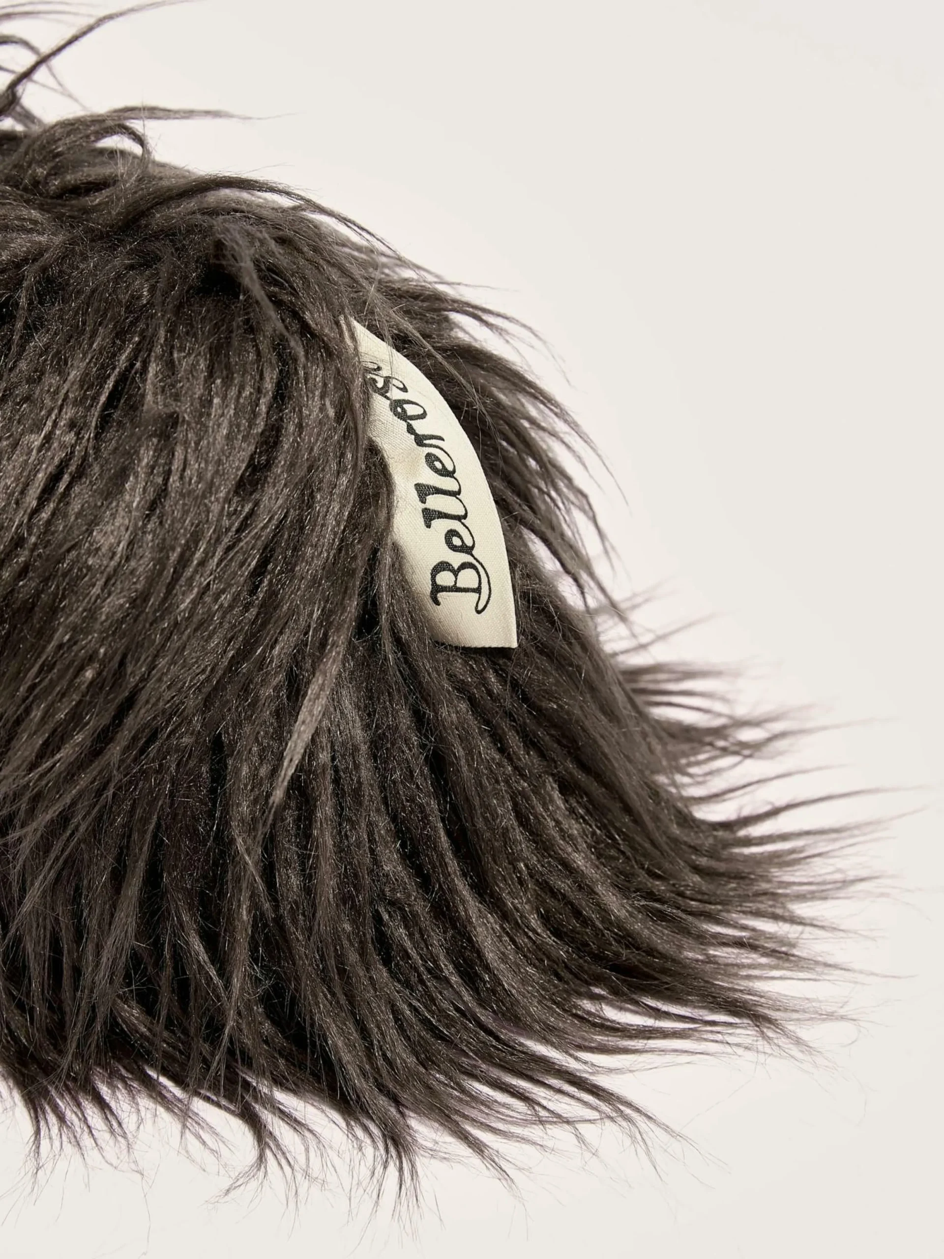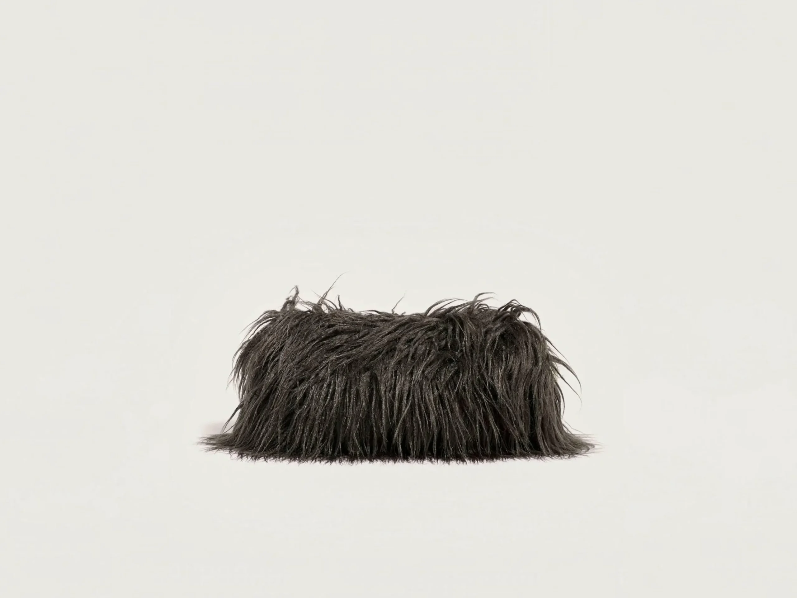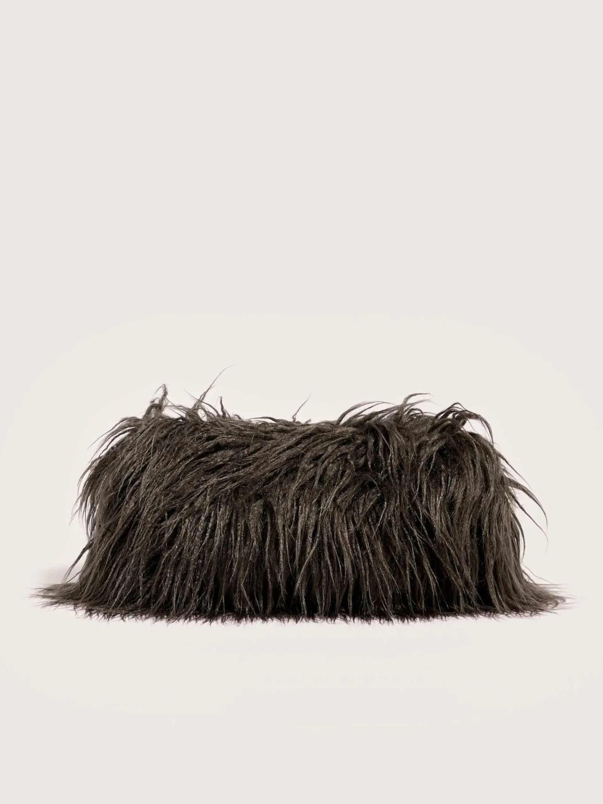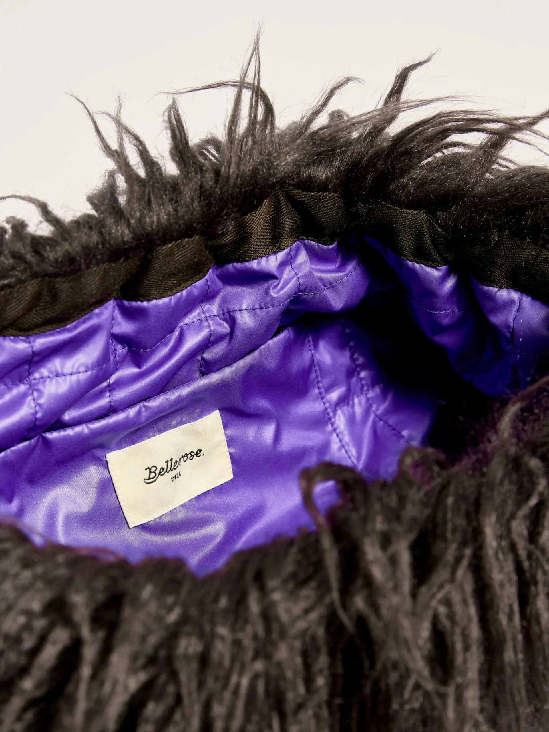 Pochette en fausse fourrure façon agneau de Mongolie, doublée de tissu matelassé violet.