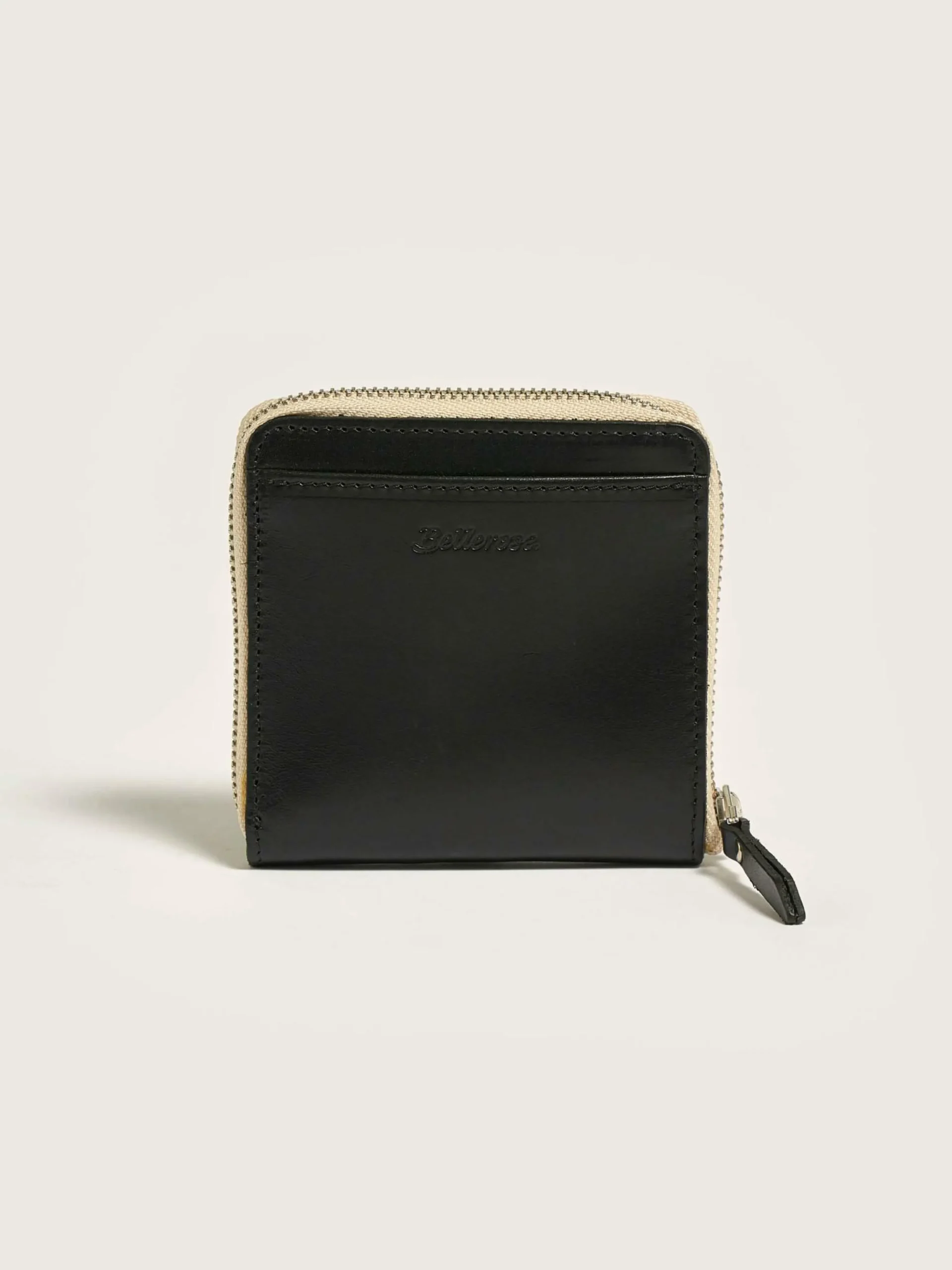 Portefeuille carré zippé en cuir lisse noir avec plusieurs fentes pour cartes et une poche à monnaie.