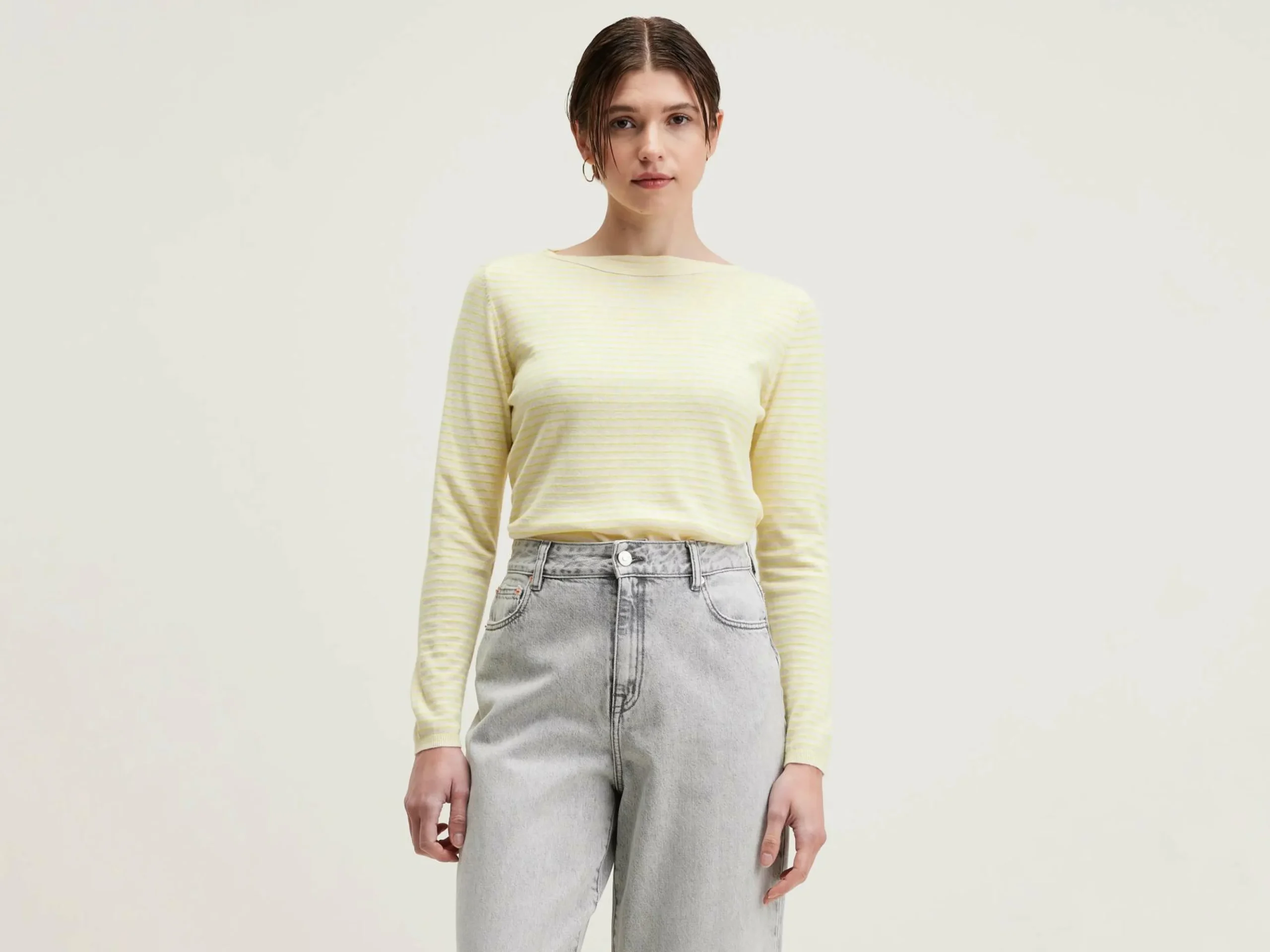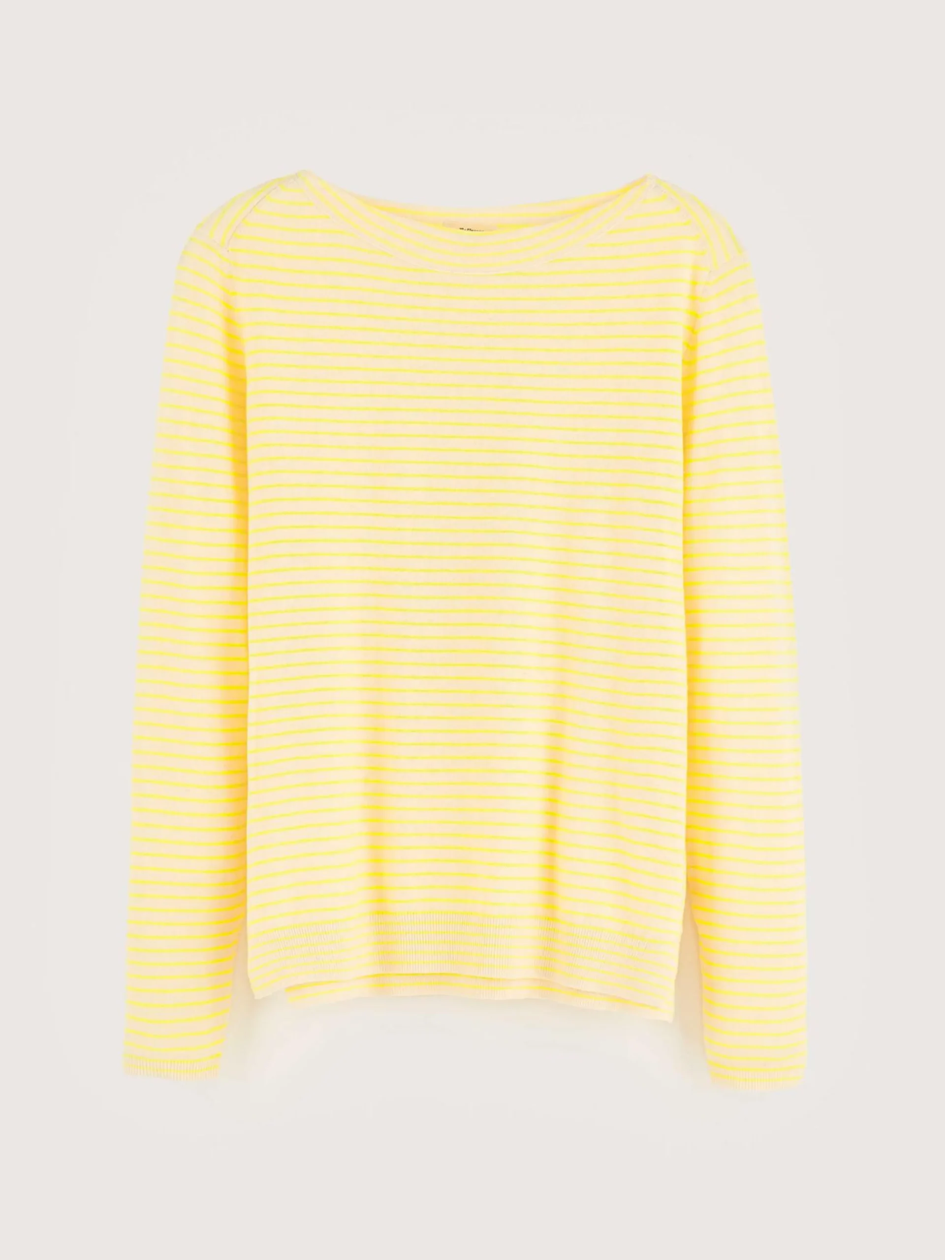 Pull col bateau à rayures jaunes.