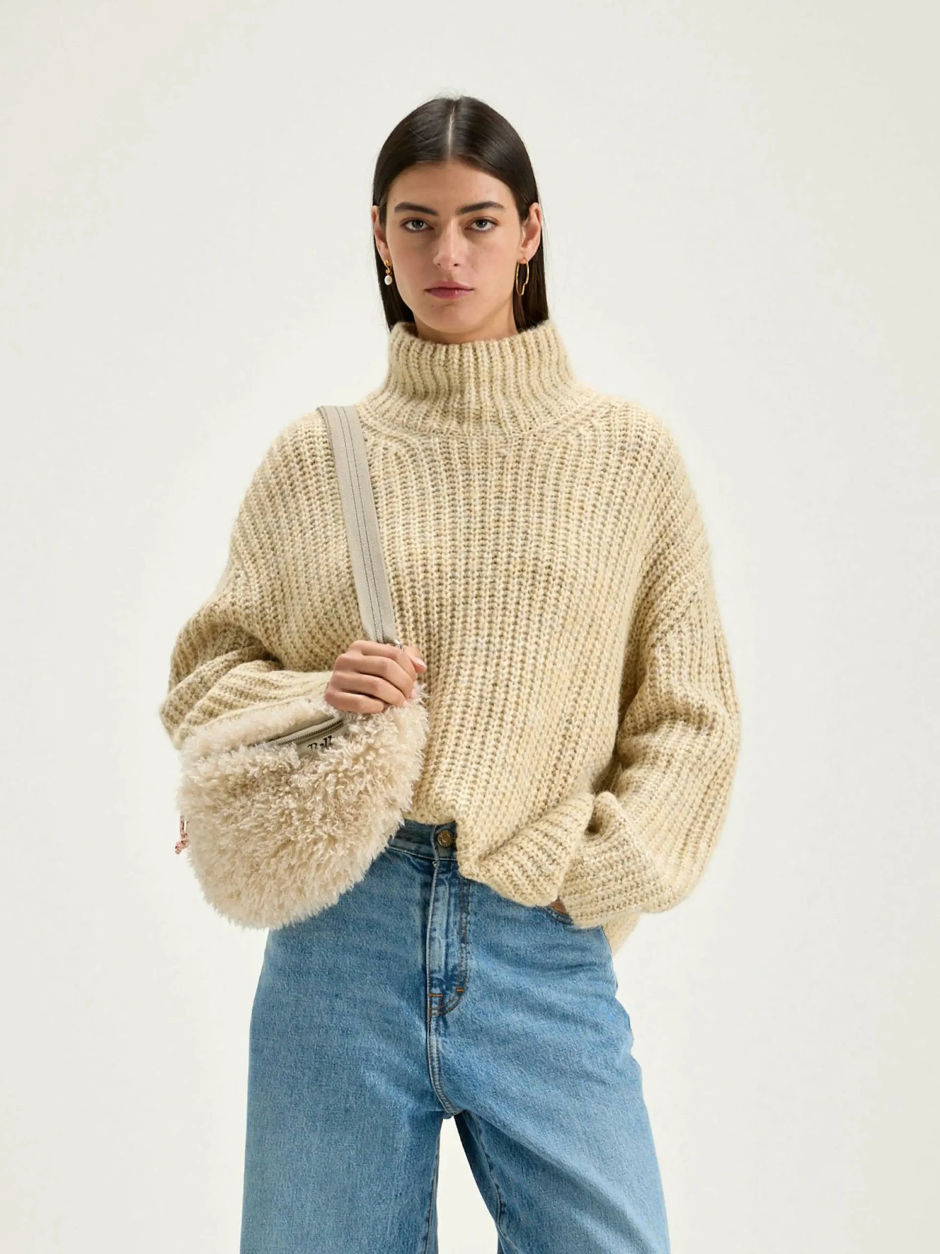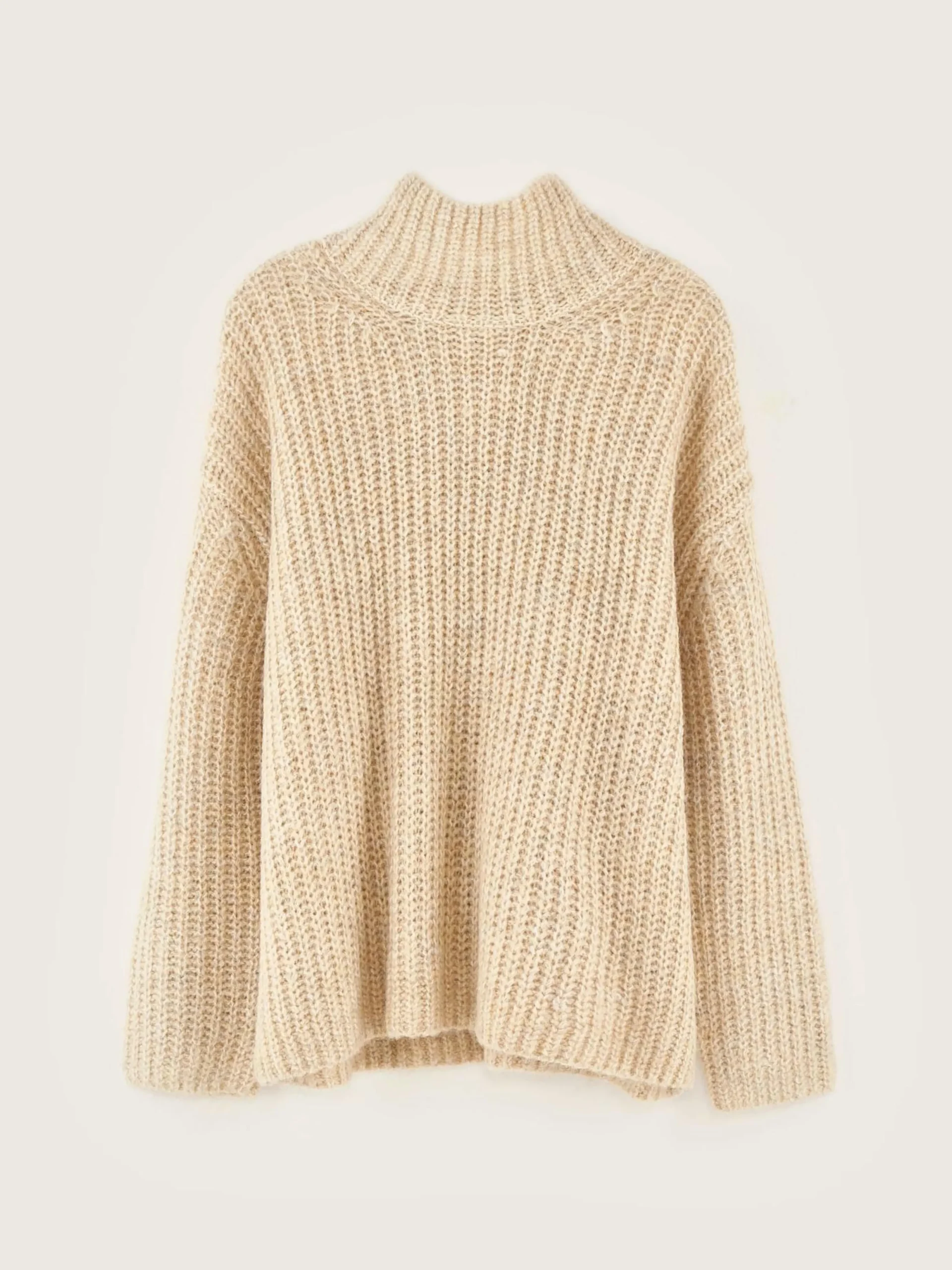Pull à col cheminée, coupe oversize et droite en maille côtelée beige chiné.