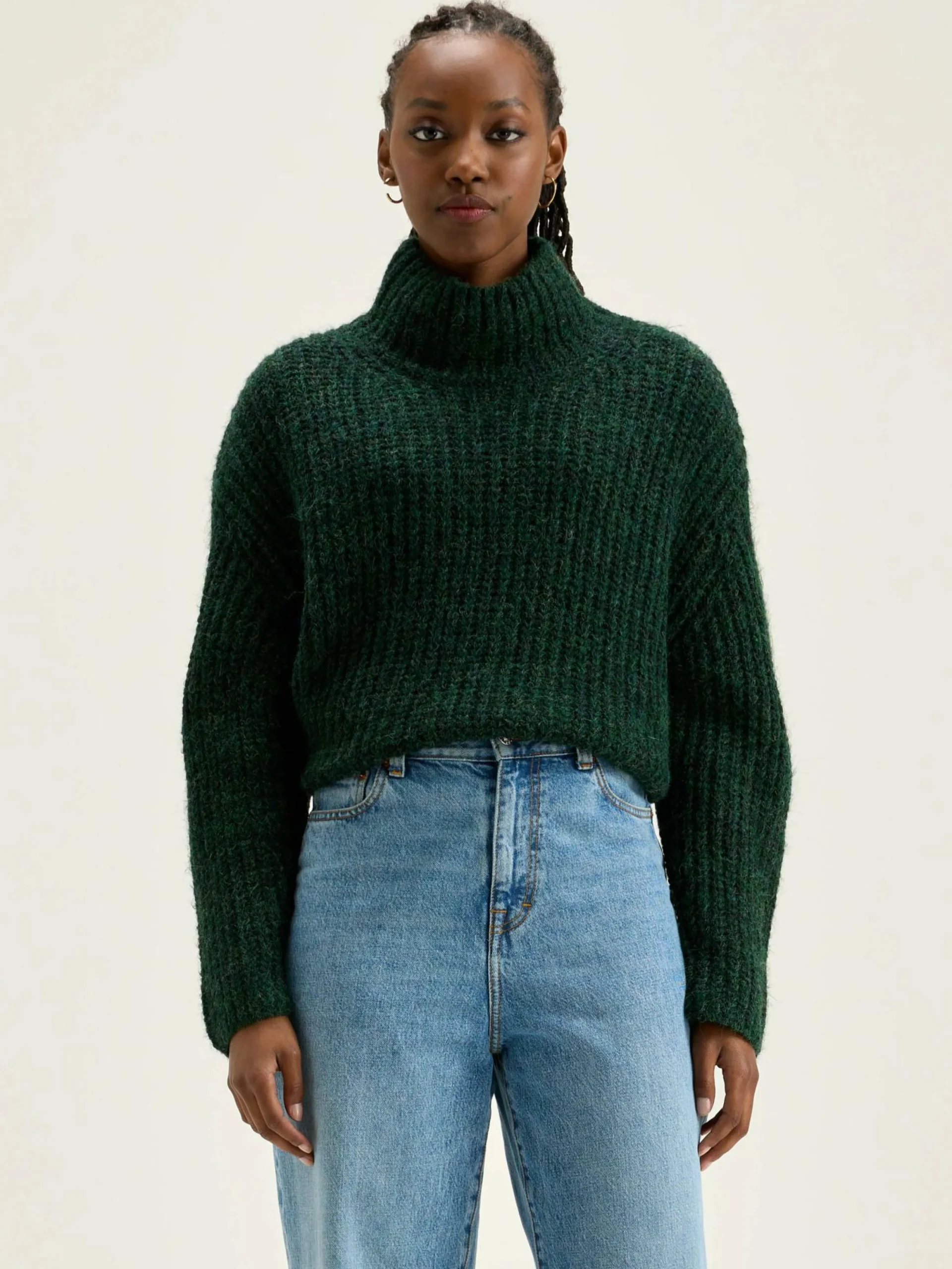 Pull à col cheminée, coupe oversize et droite en maille côtelée vert foncé.