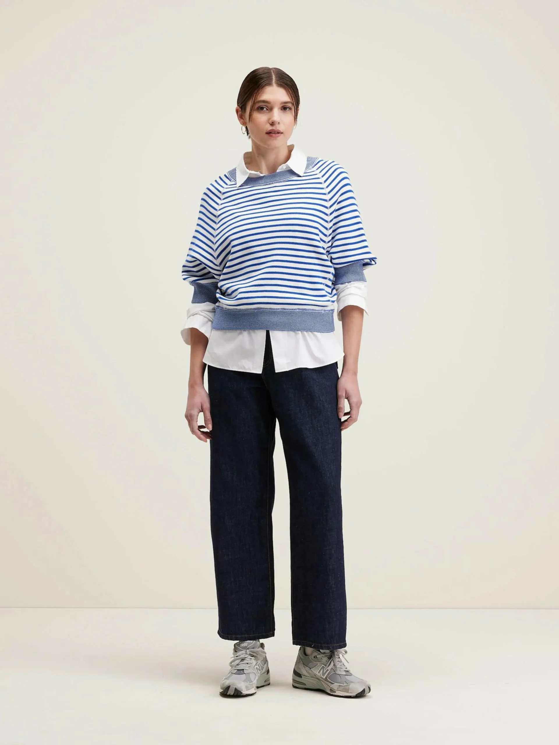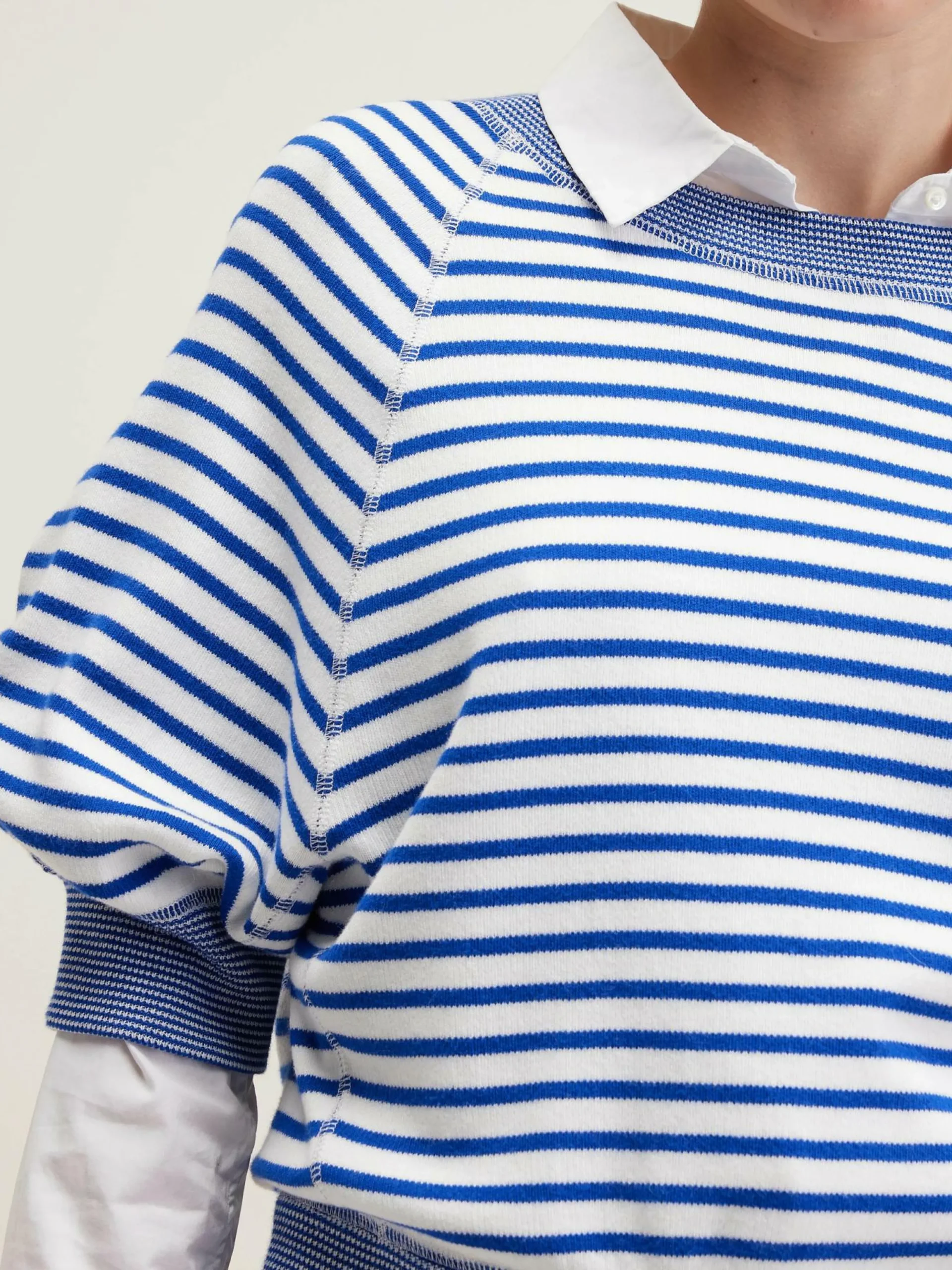 Pull col rond oversize avec manches 3/4 et bords côtelés en coton écru avec rayures bleues.