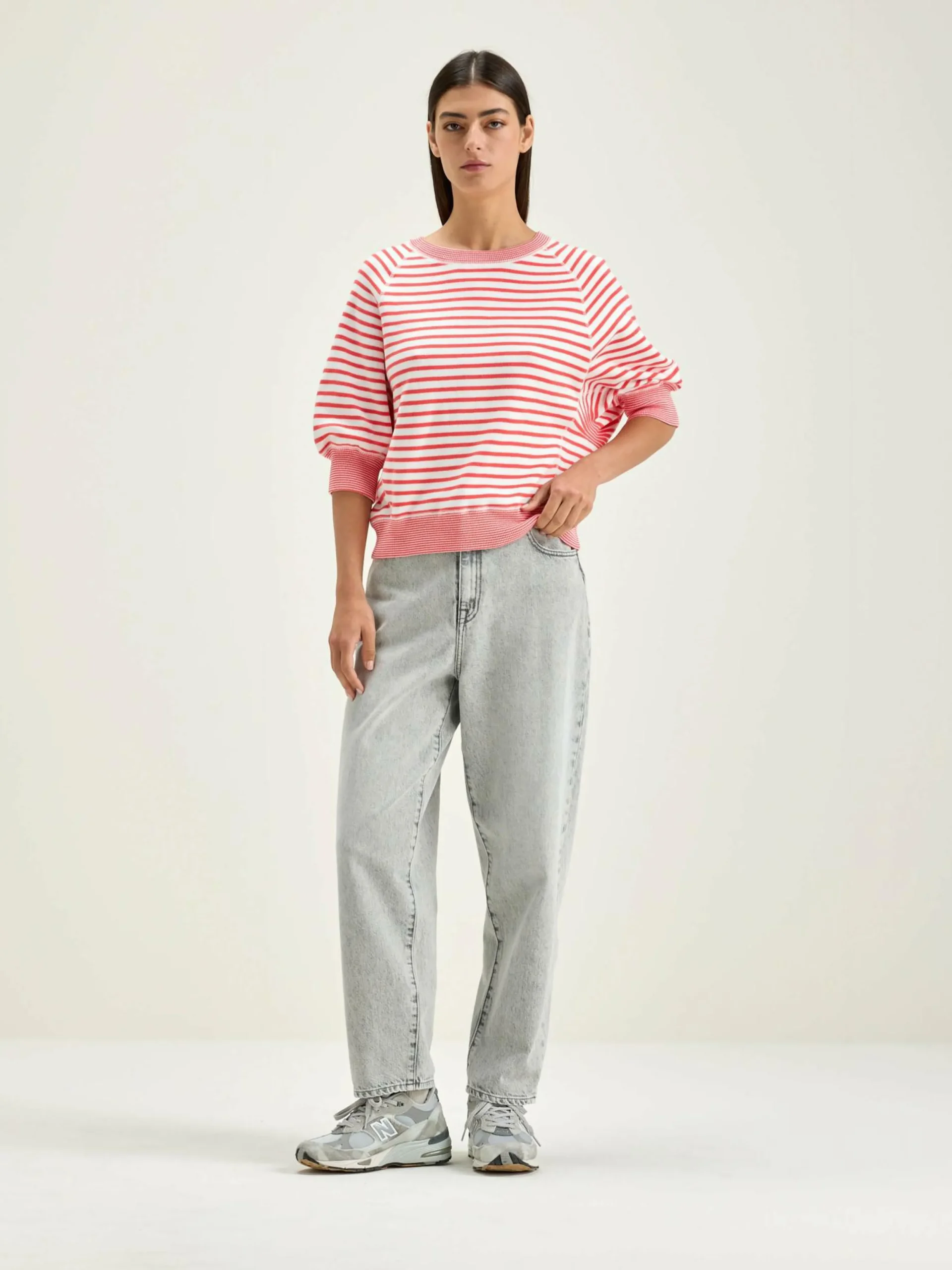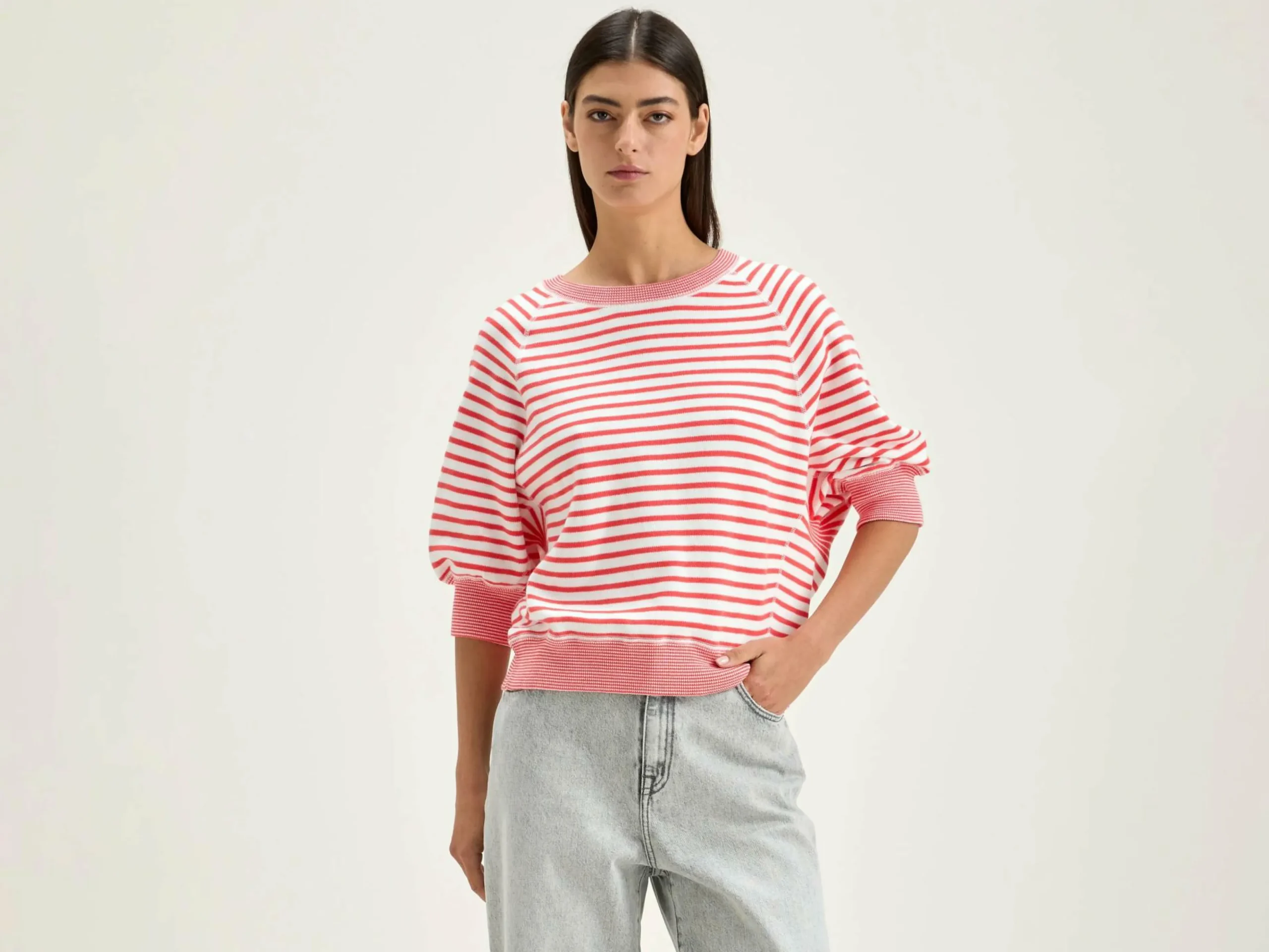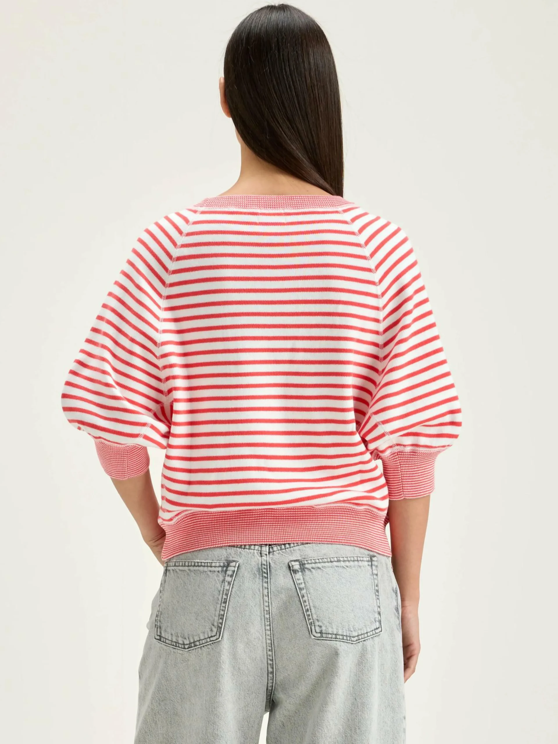 Pull col rond oversize avec manches 3/4 et bords côtelés en coton écru avec rayures roses.