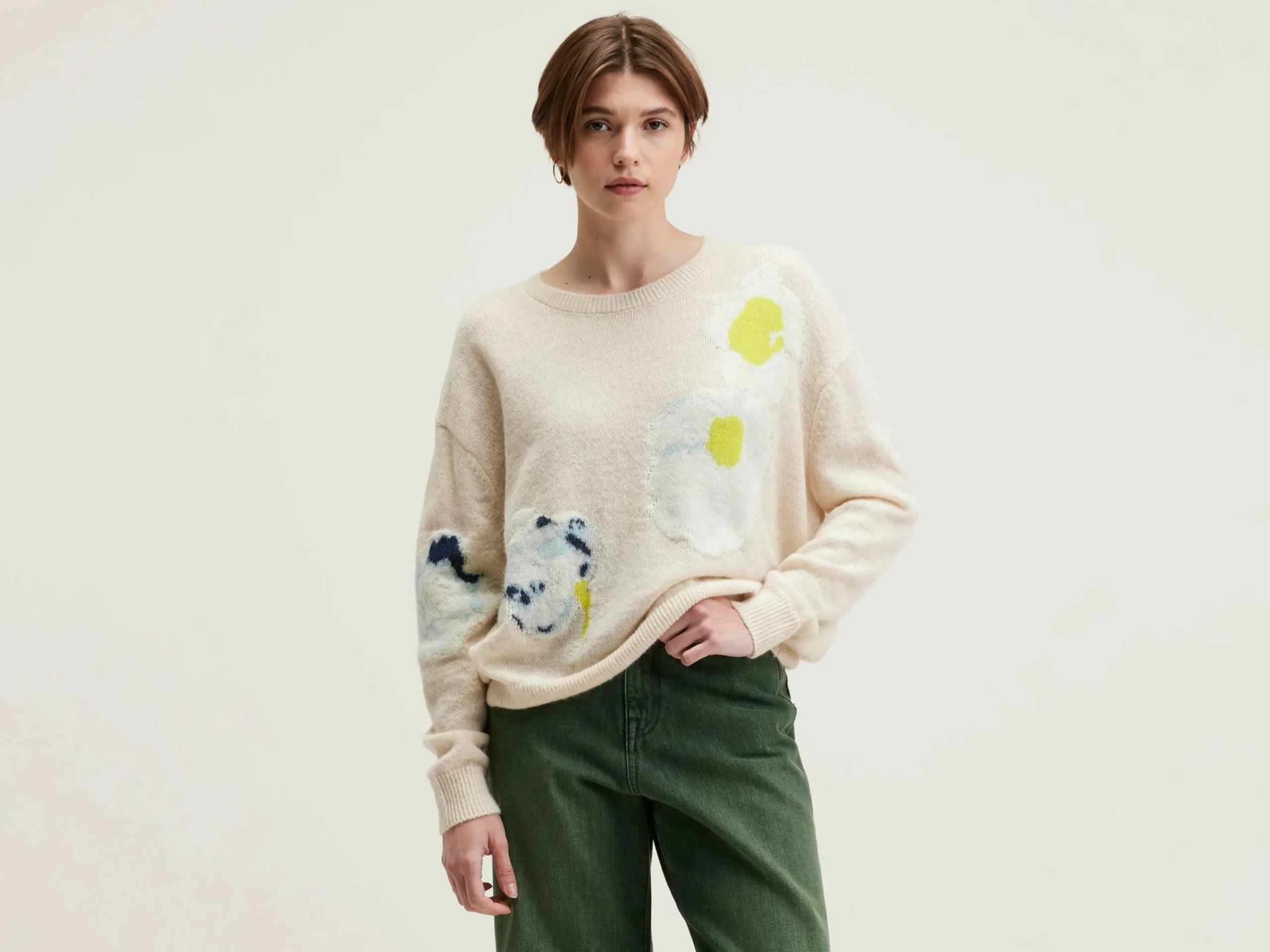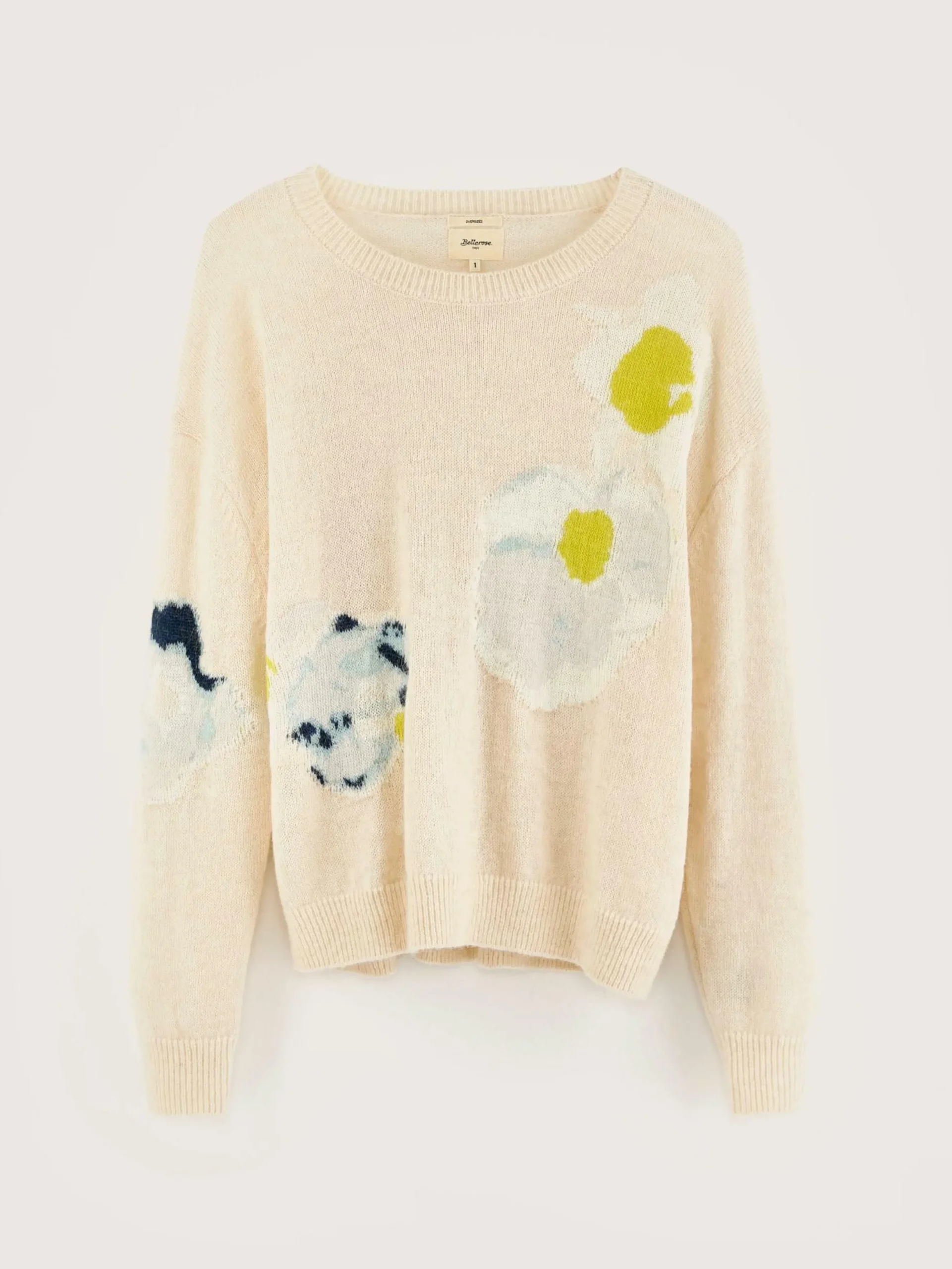 Pull en angora mélangé, coupe oversize et col rond, rehaussé d’un motif de fleurs écrasées multicolores en intarsia.