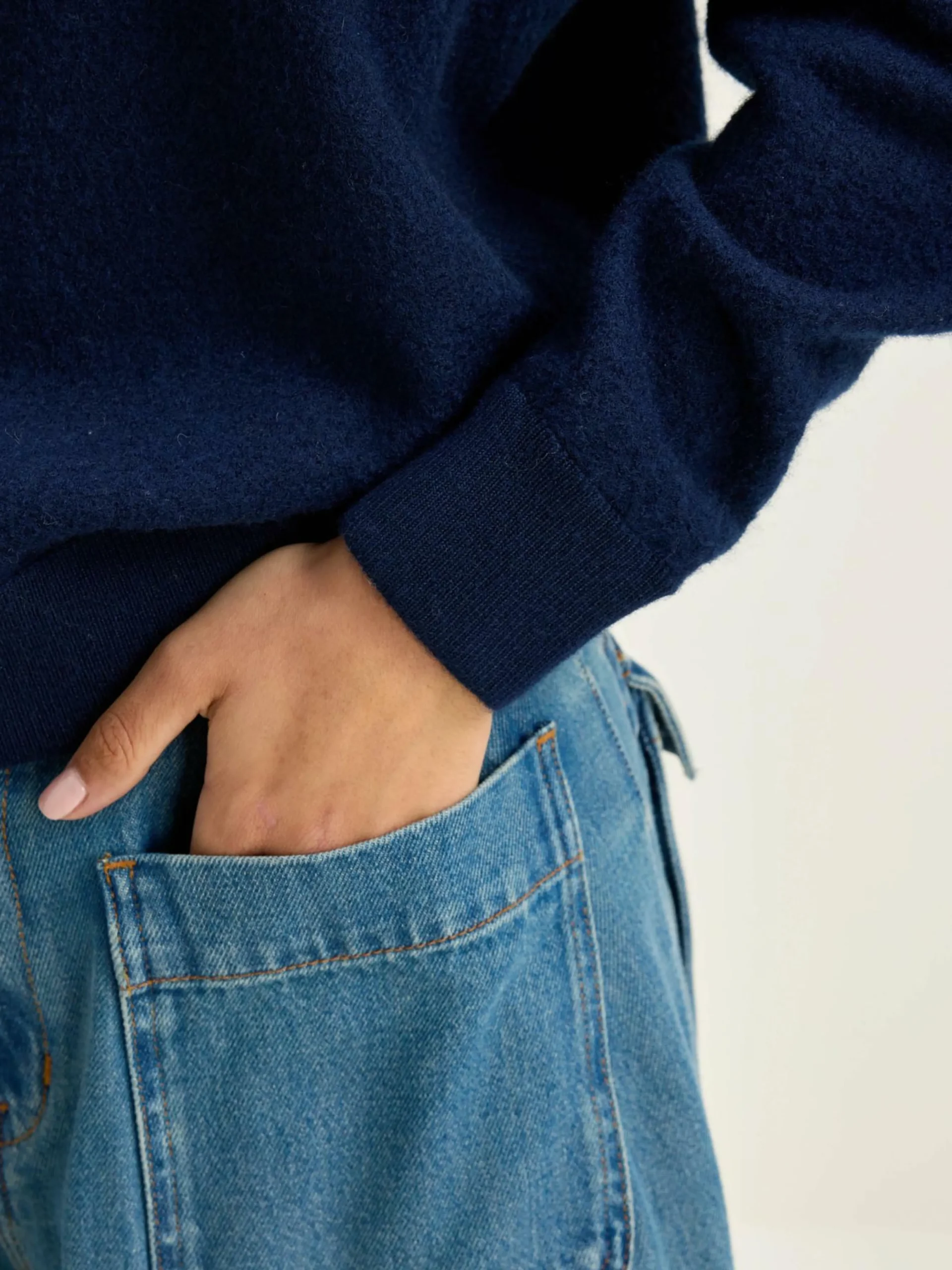 Pull oversize couleur bleu encre avec boutons en nacre sur l’épaule.