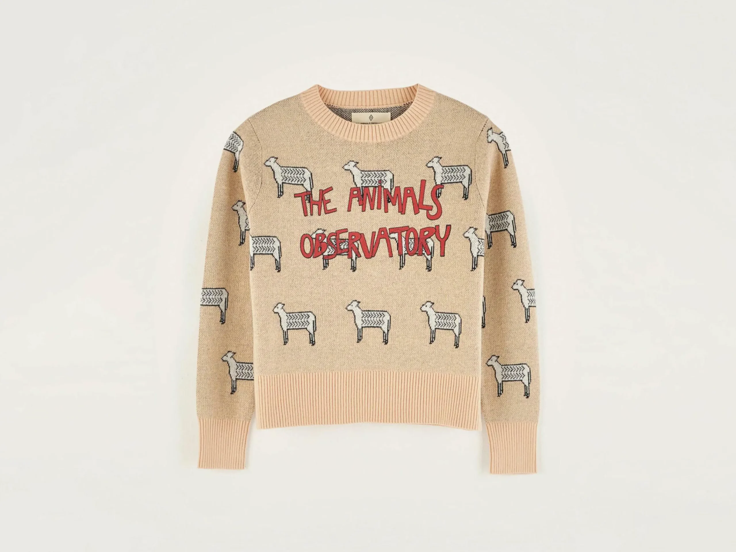 Pull classique avec un motif moutons en jacquard, et l’imprimé du logo Bellerose x The Animal Observatory.