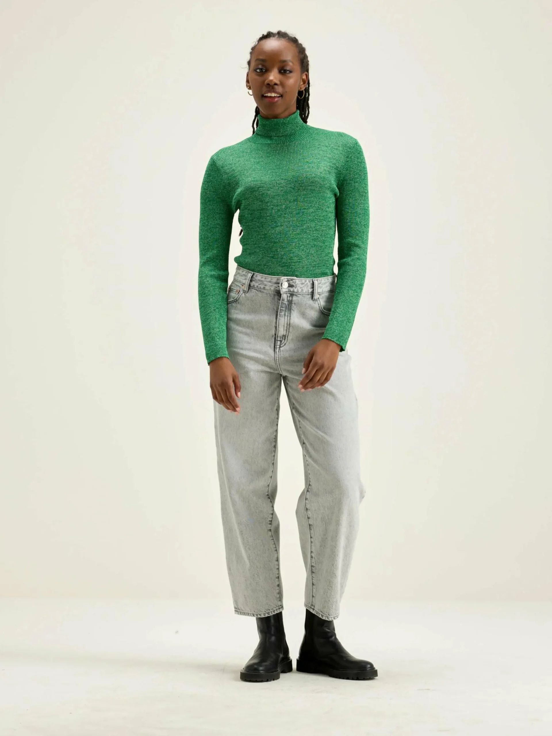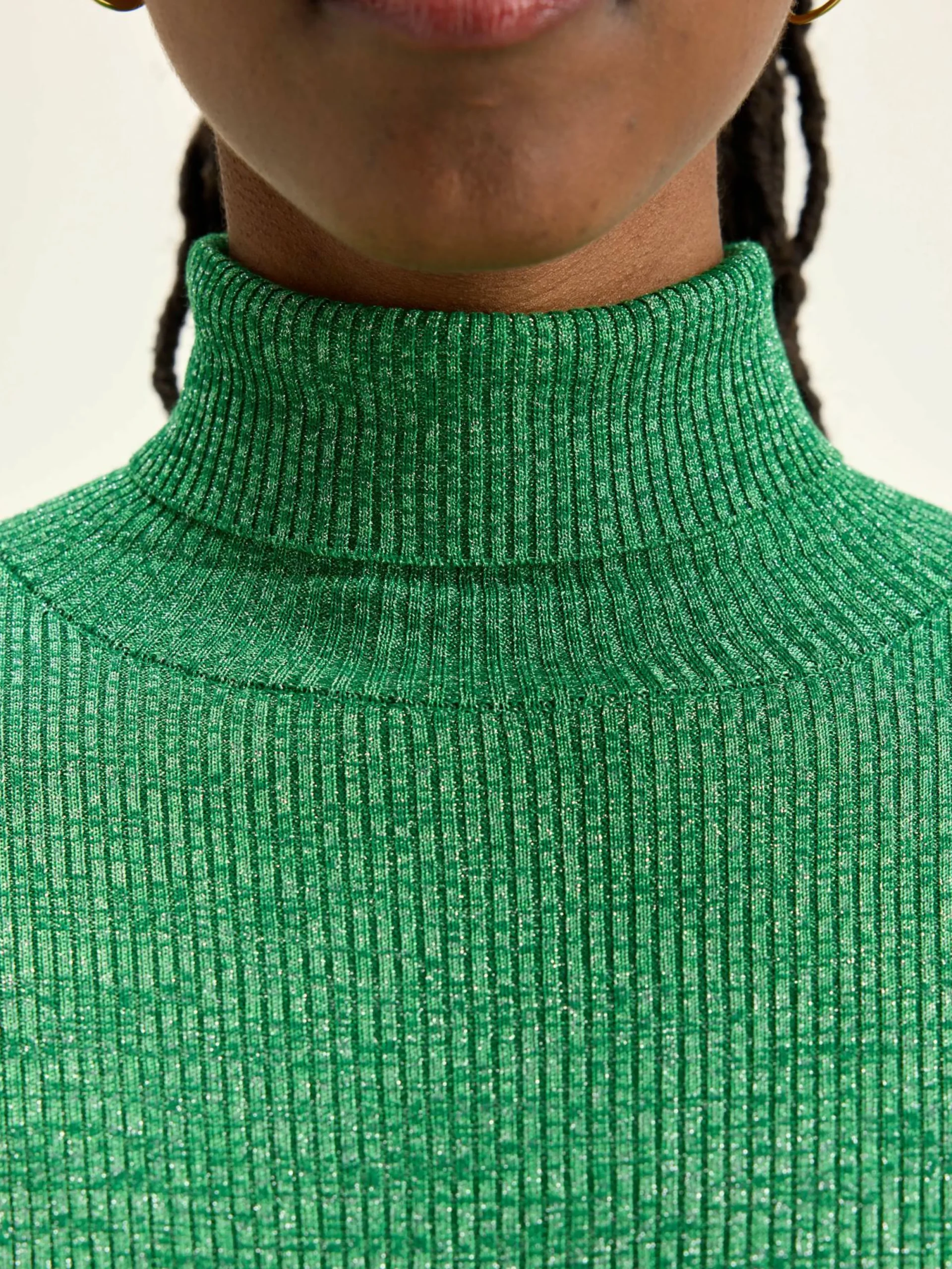 Pull chaussette en maille côtelée couleur vert chlorophylle avec fil lurex.