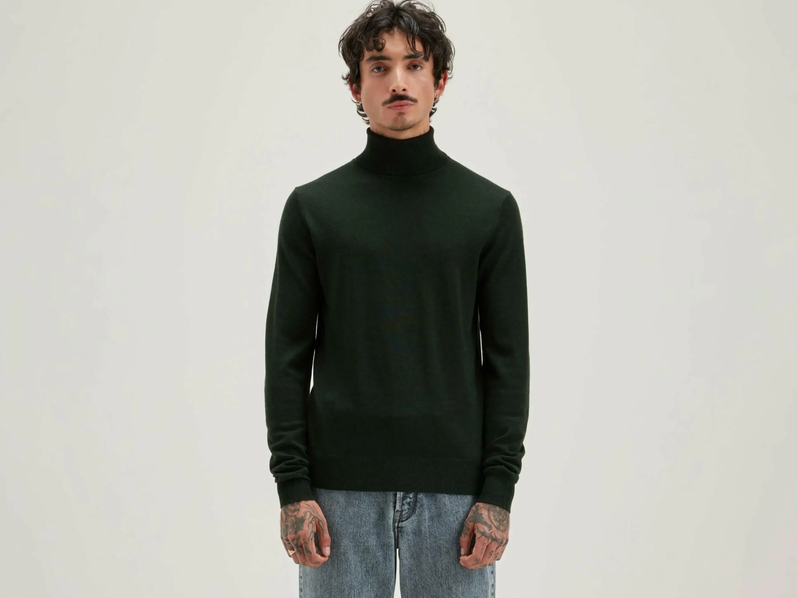 Pull classique à col roulé en laine mérinos superfine couleur vert forêt.
