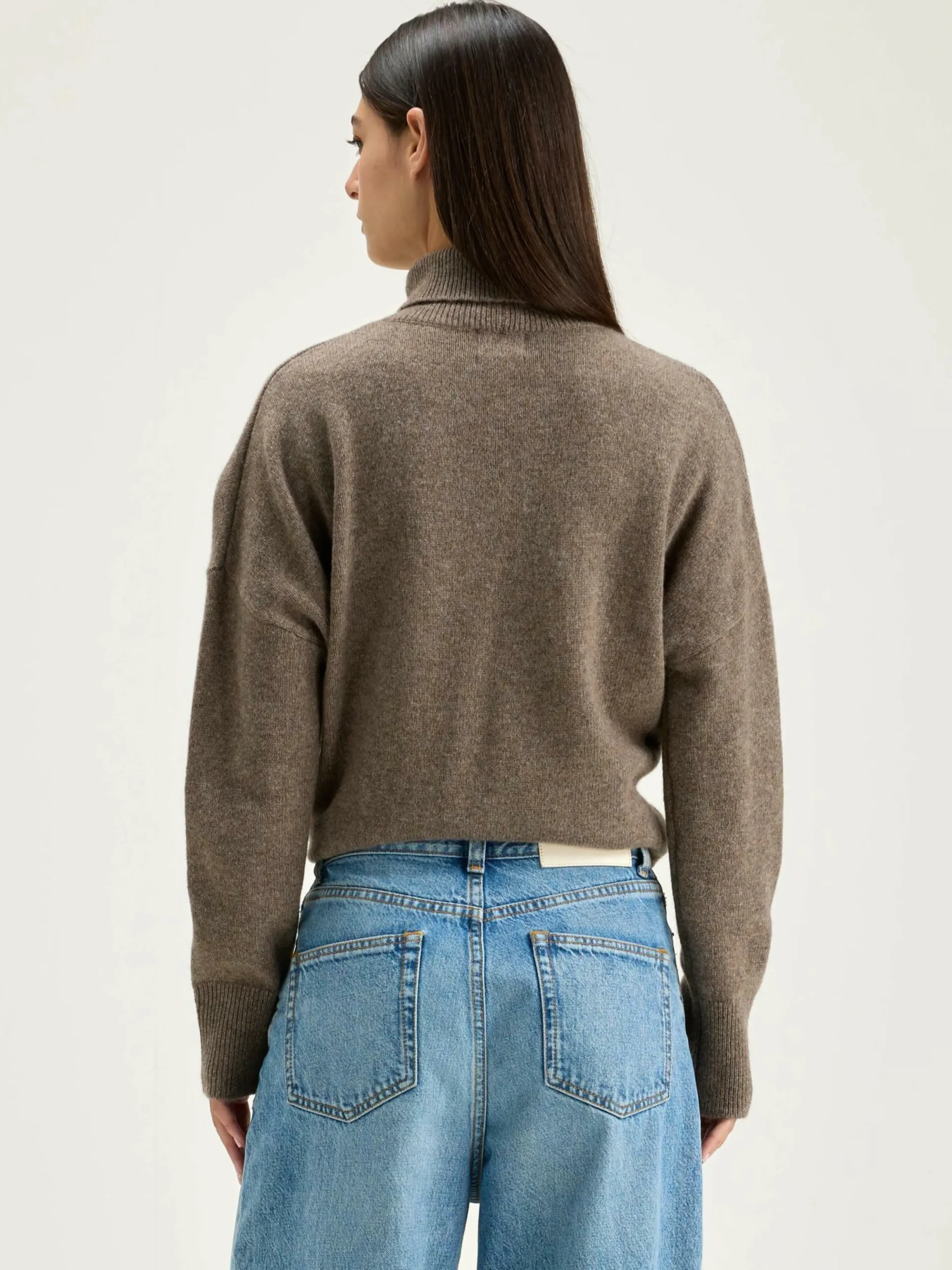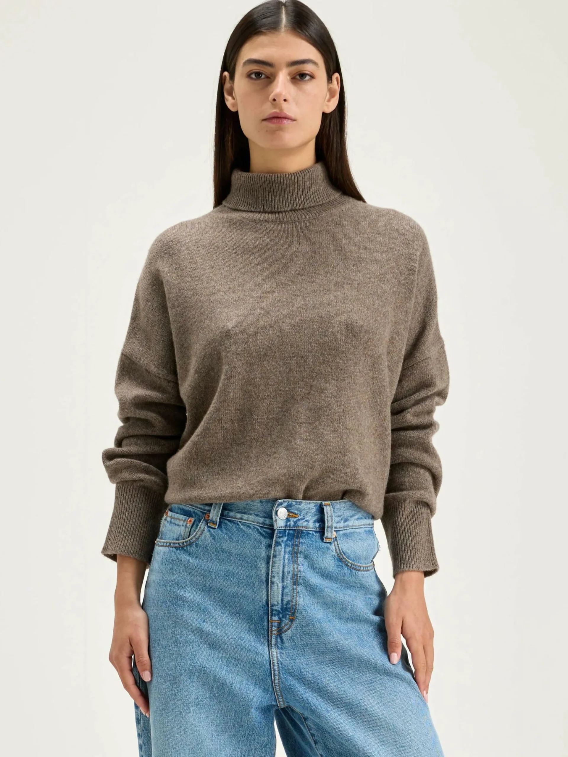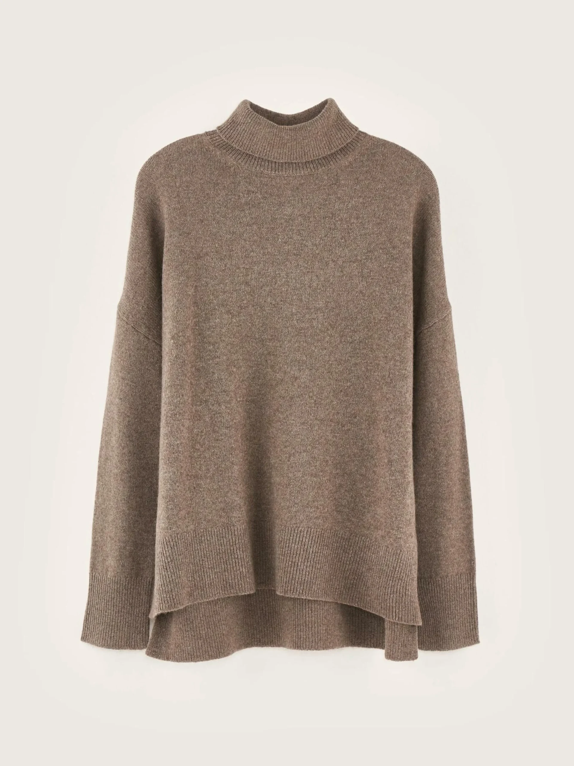 Pull gris foncé oversize à col roulé avec manches extra longues.