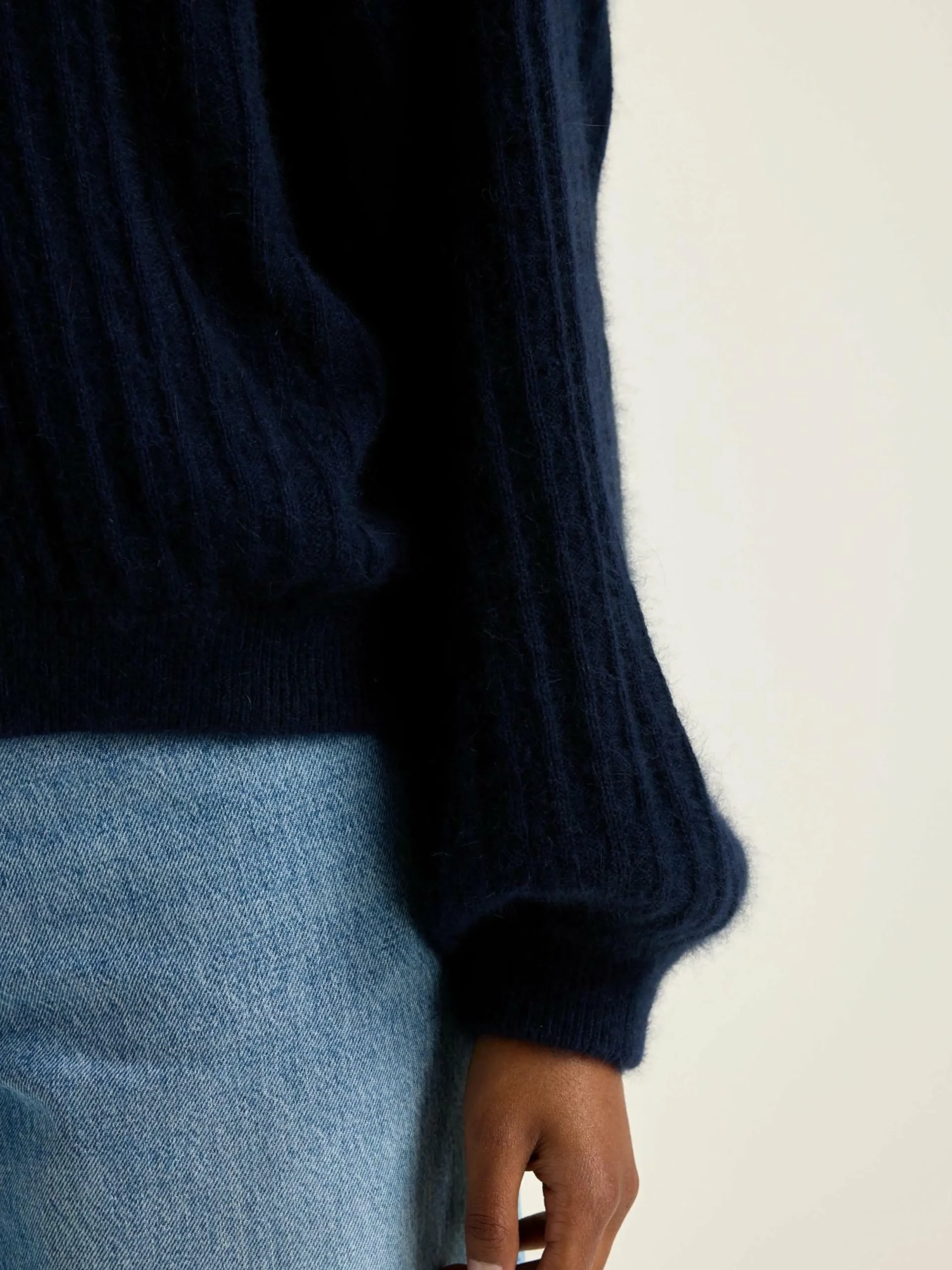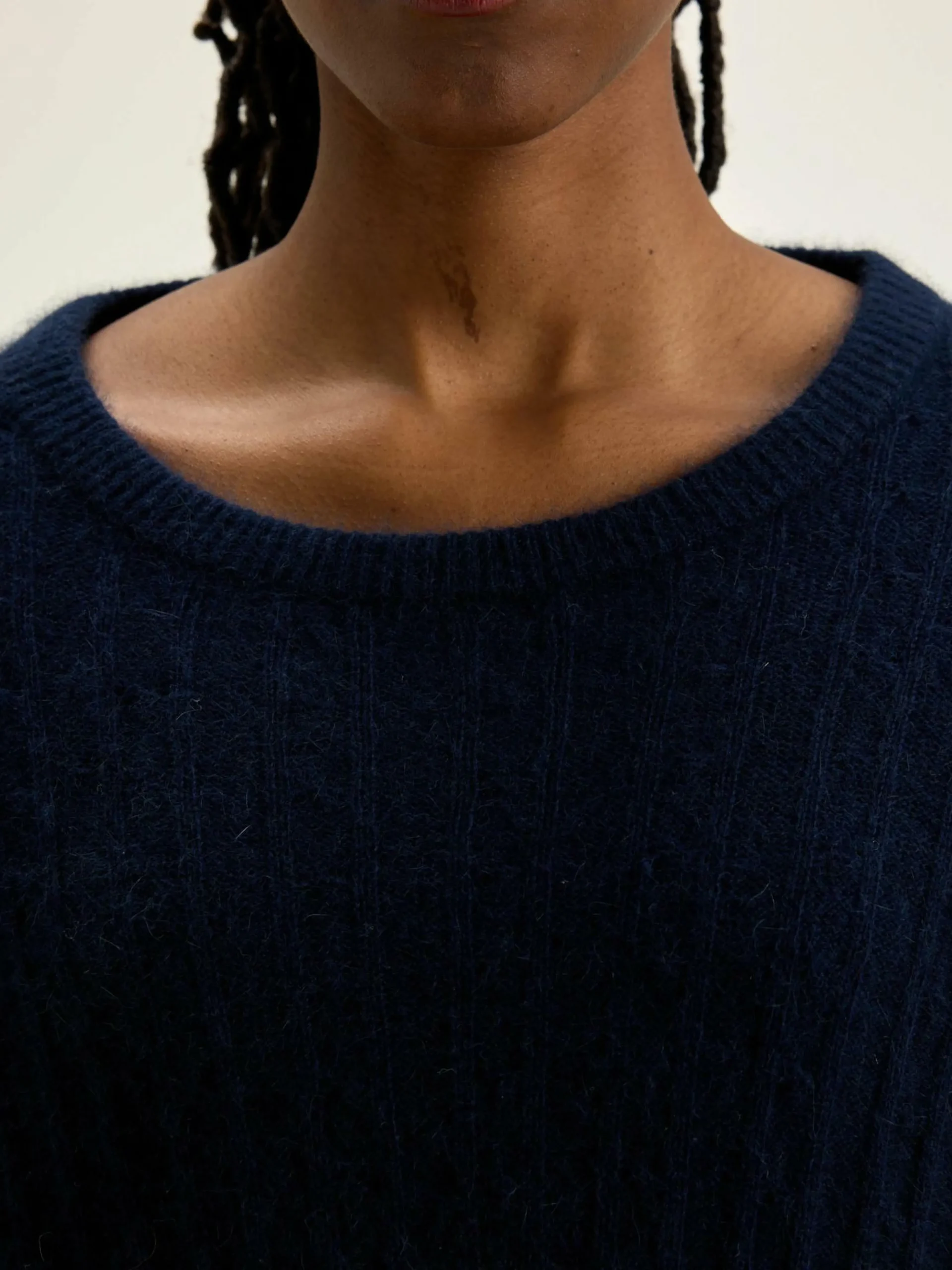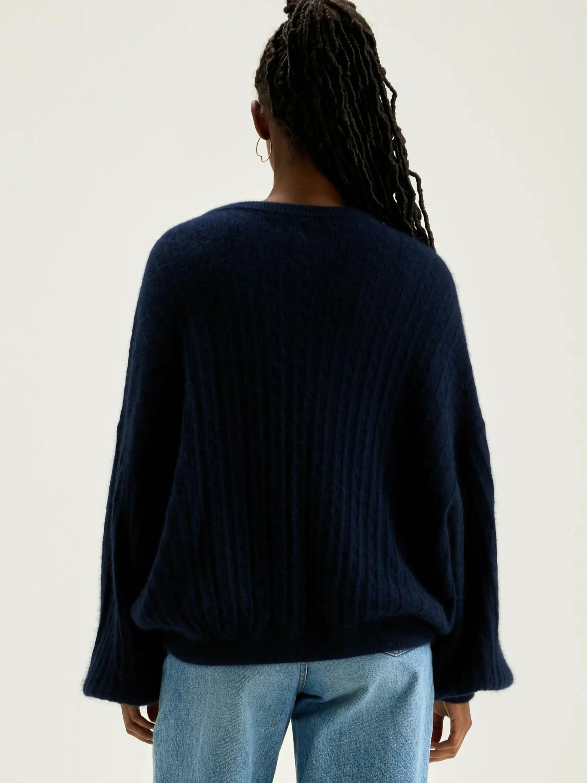 Pull cropped et volumineux tricoté en torsades inversées bleu encre.
