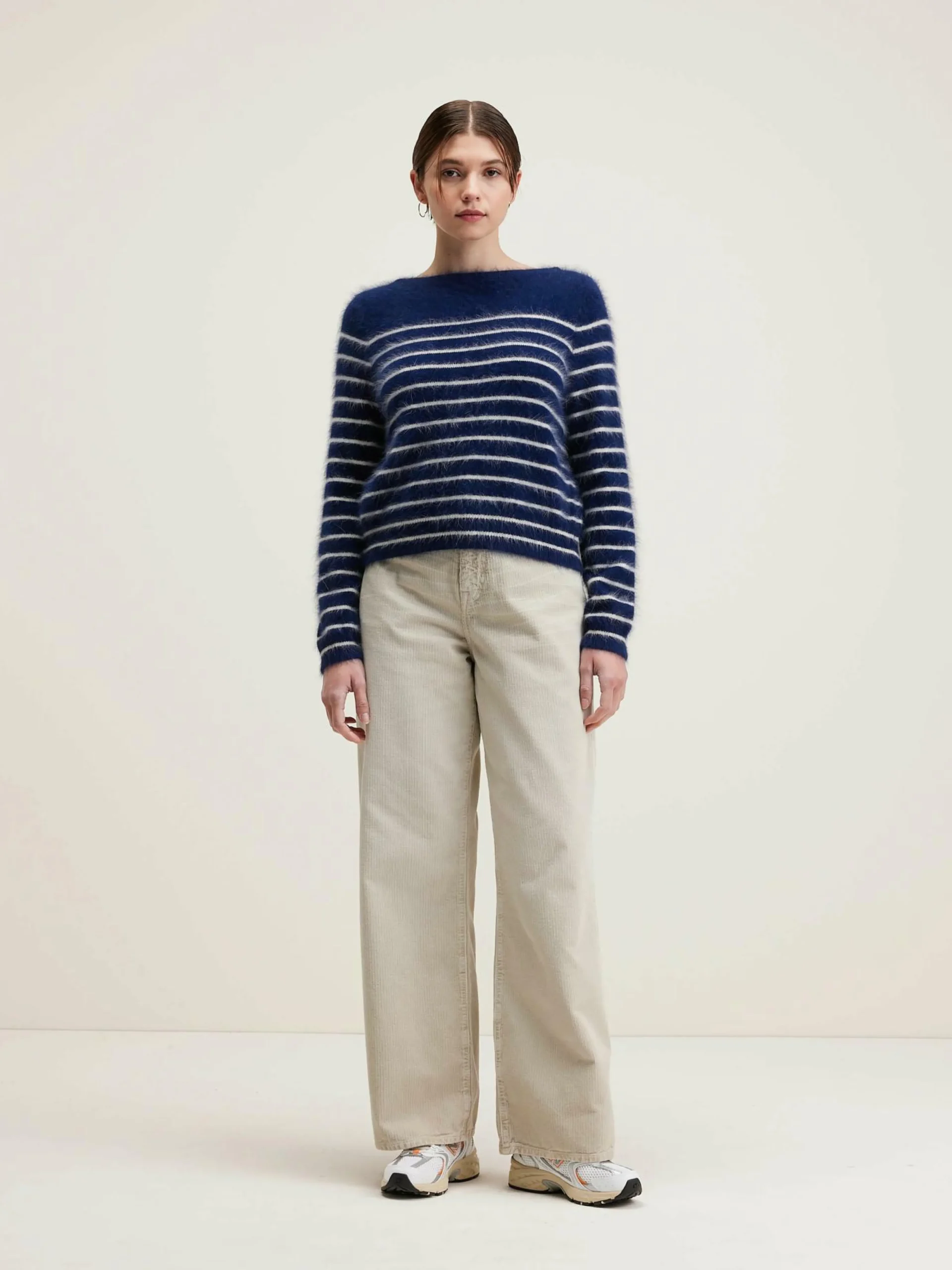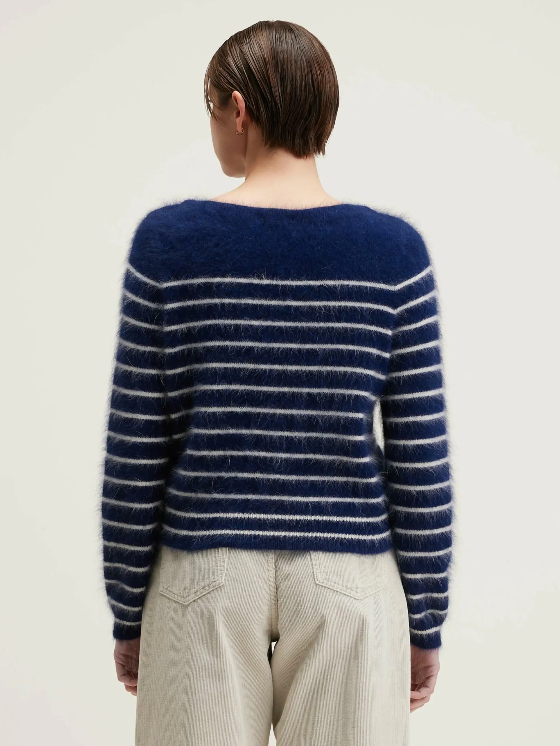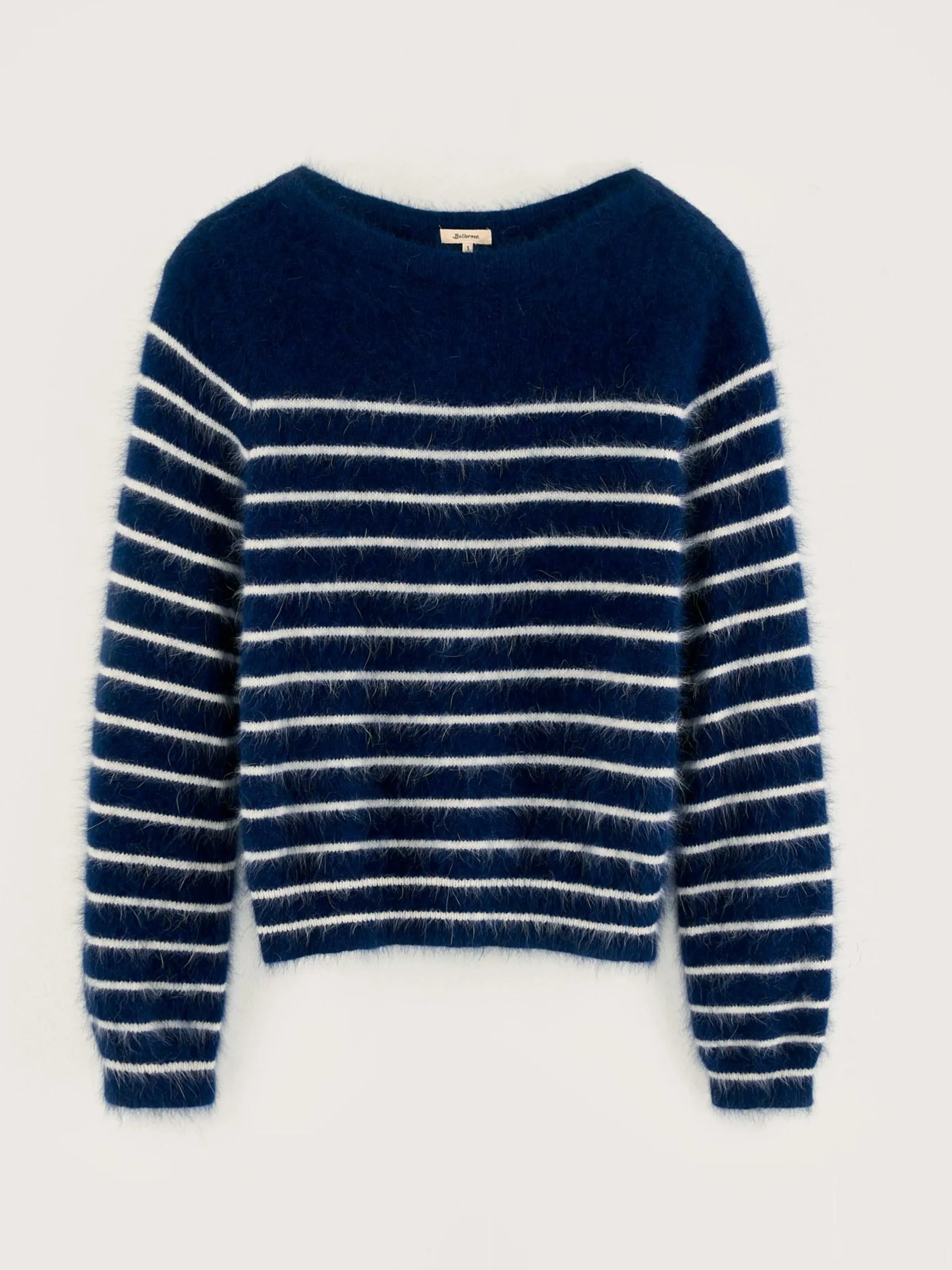 Pull classique à col bateau en angora rayé bleu et blanc.