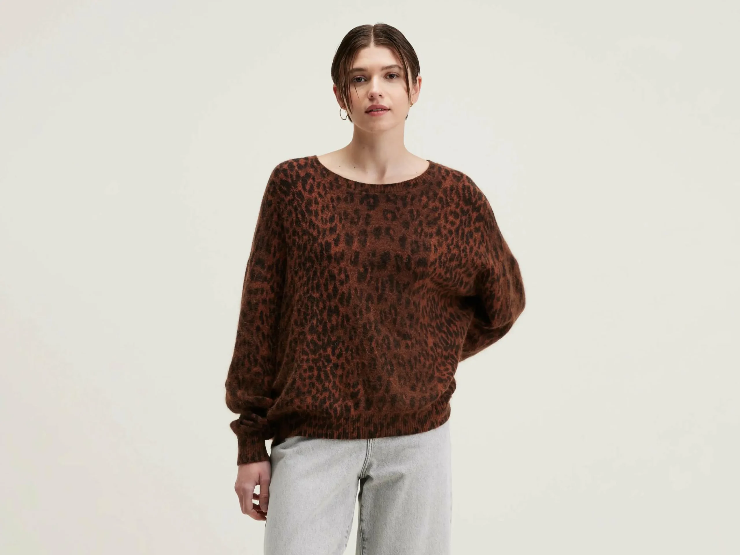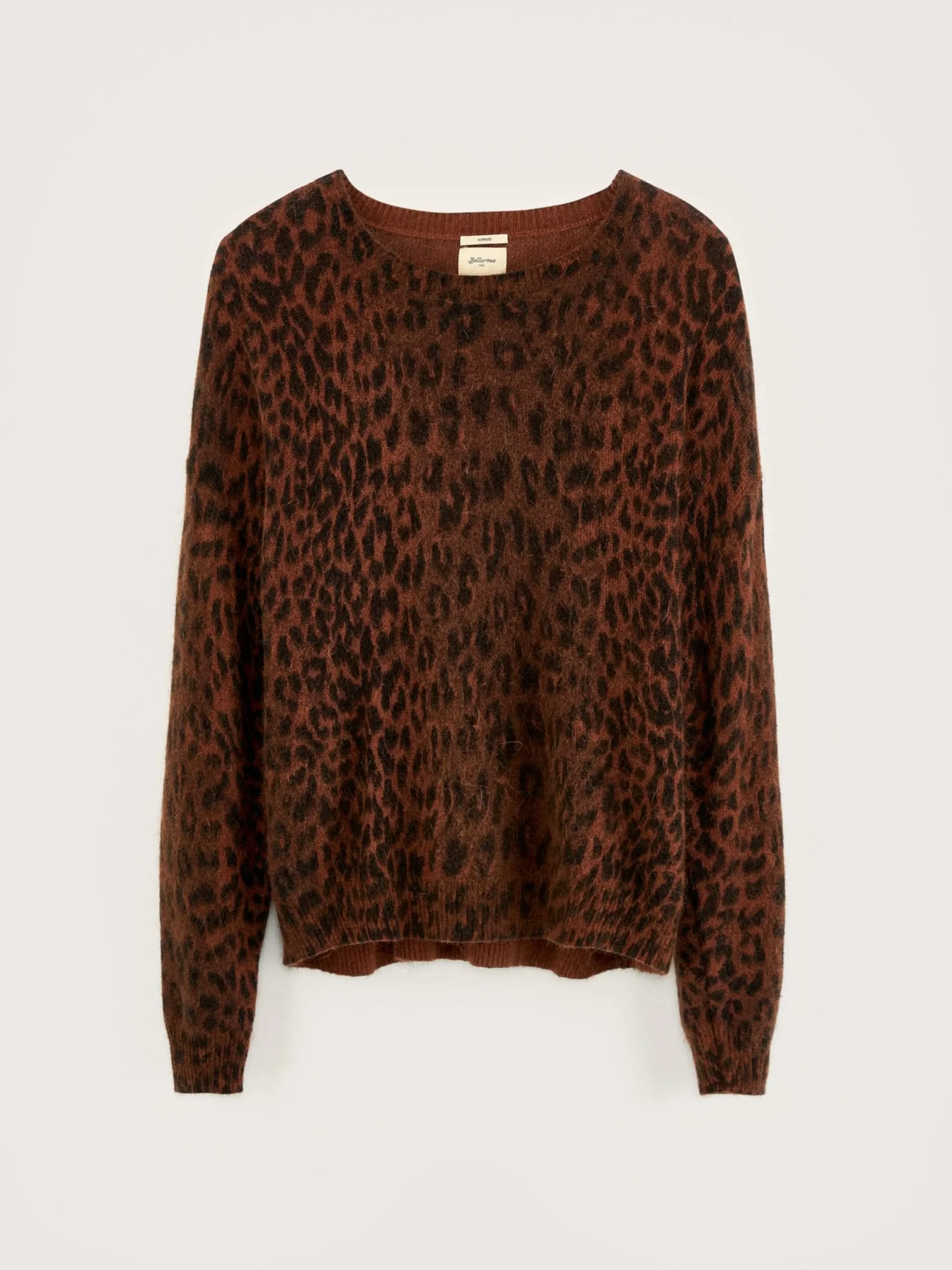 Pull oversize en angora mélangé, col rond, motif léopard.