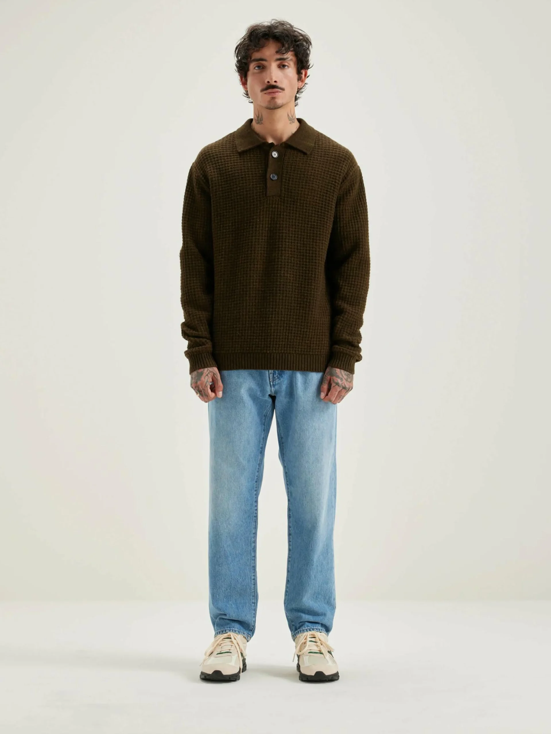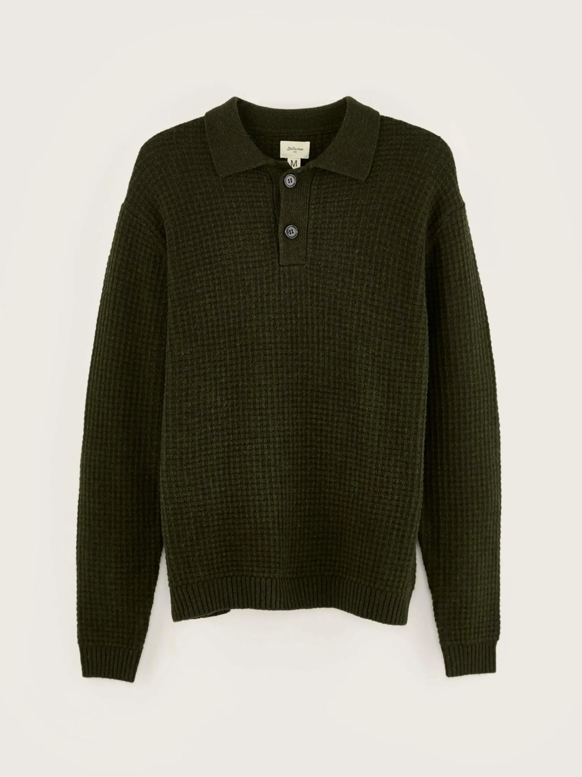 Pull style polo en laine vert olive tricotée en nid d’abeille.