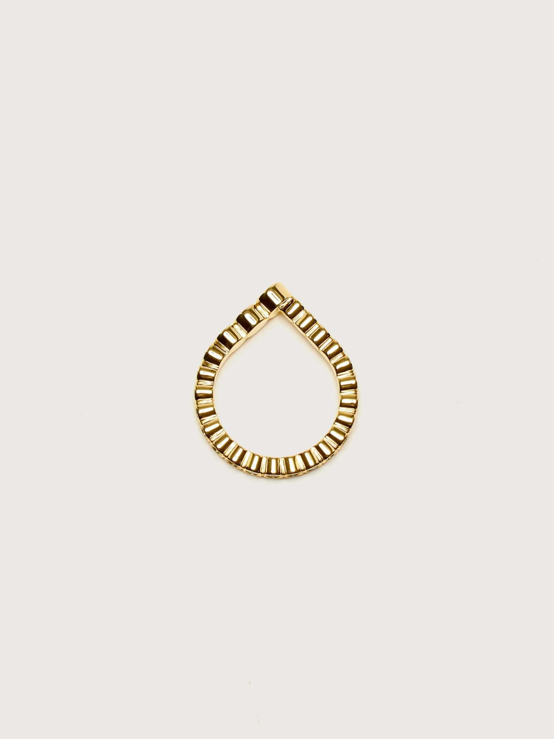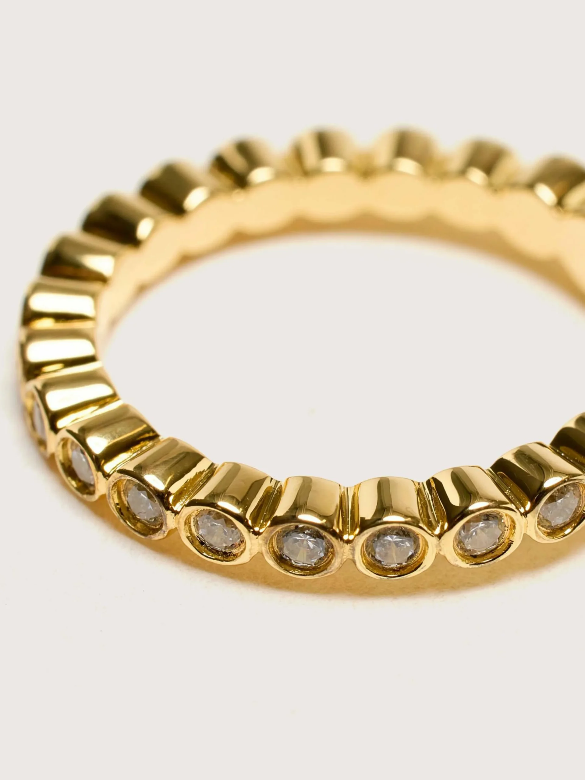 La bague Odette de RAGBAG est ornée de pierres en zircon cubique blanc qui passent du petit au grand autour de la bande plaquée or 18 carats.