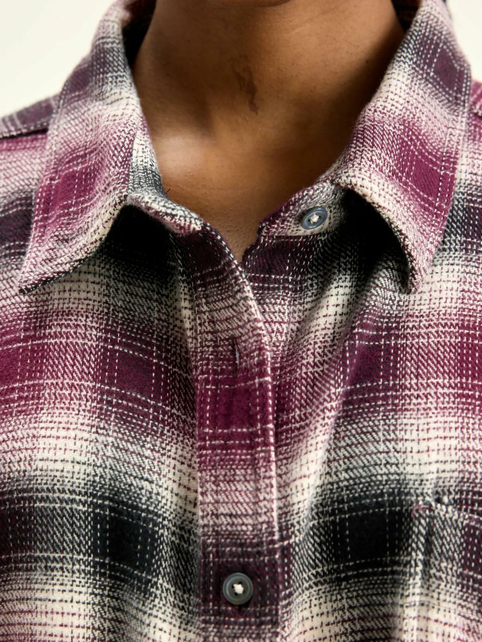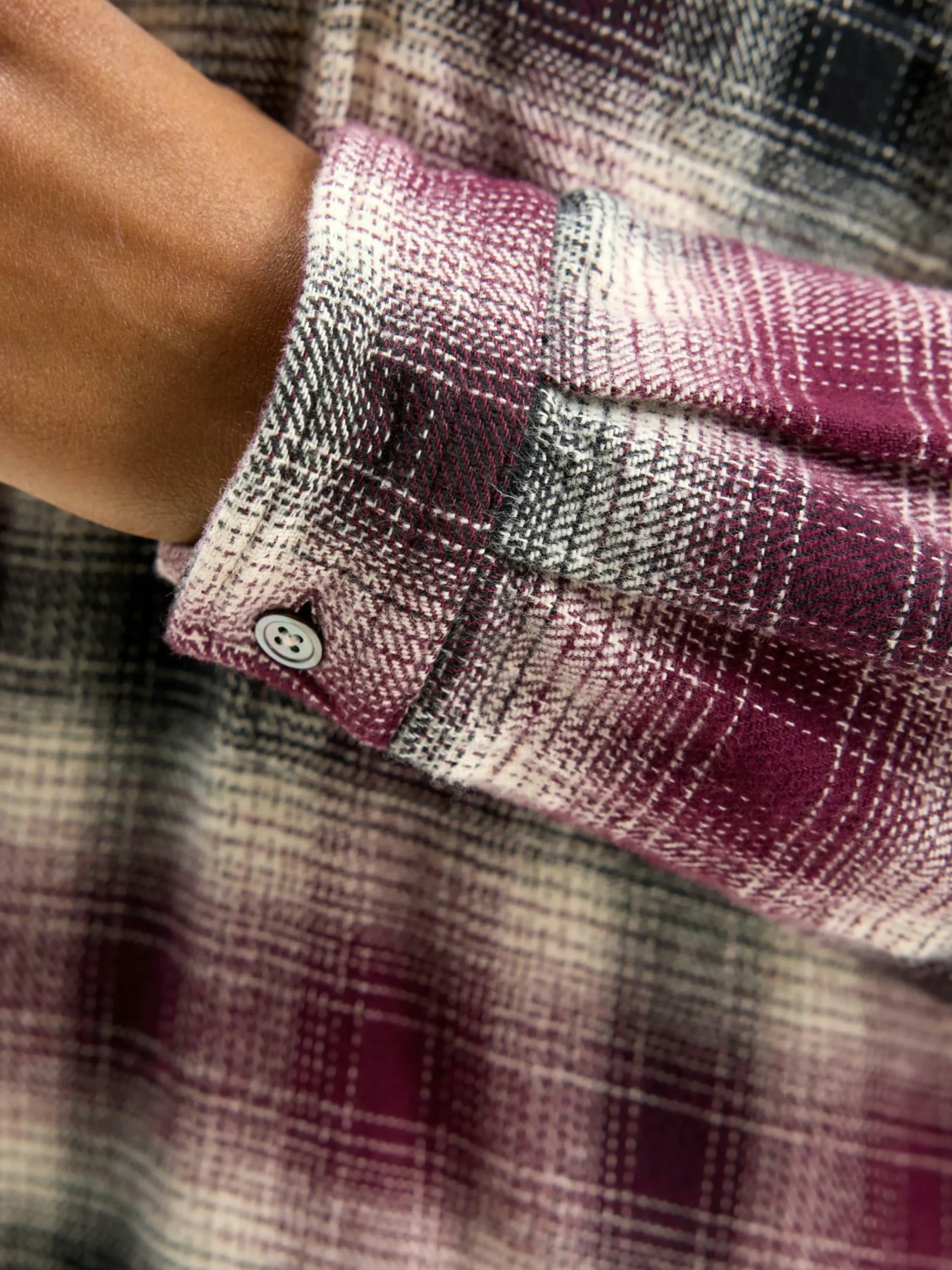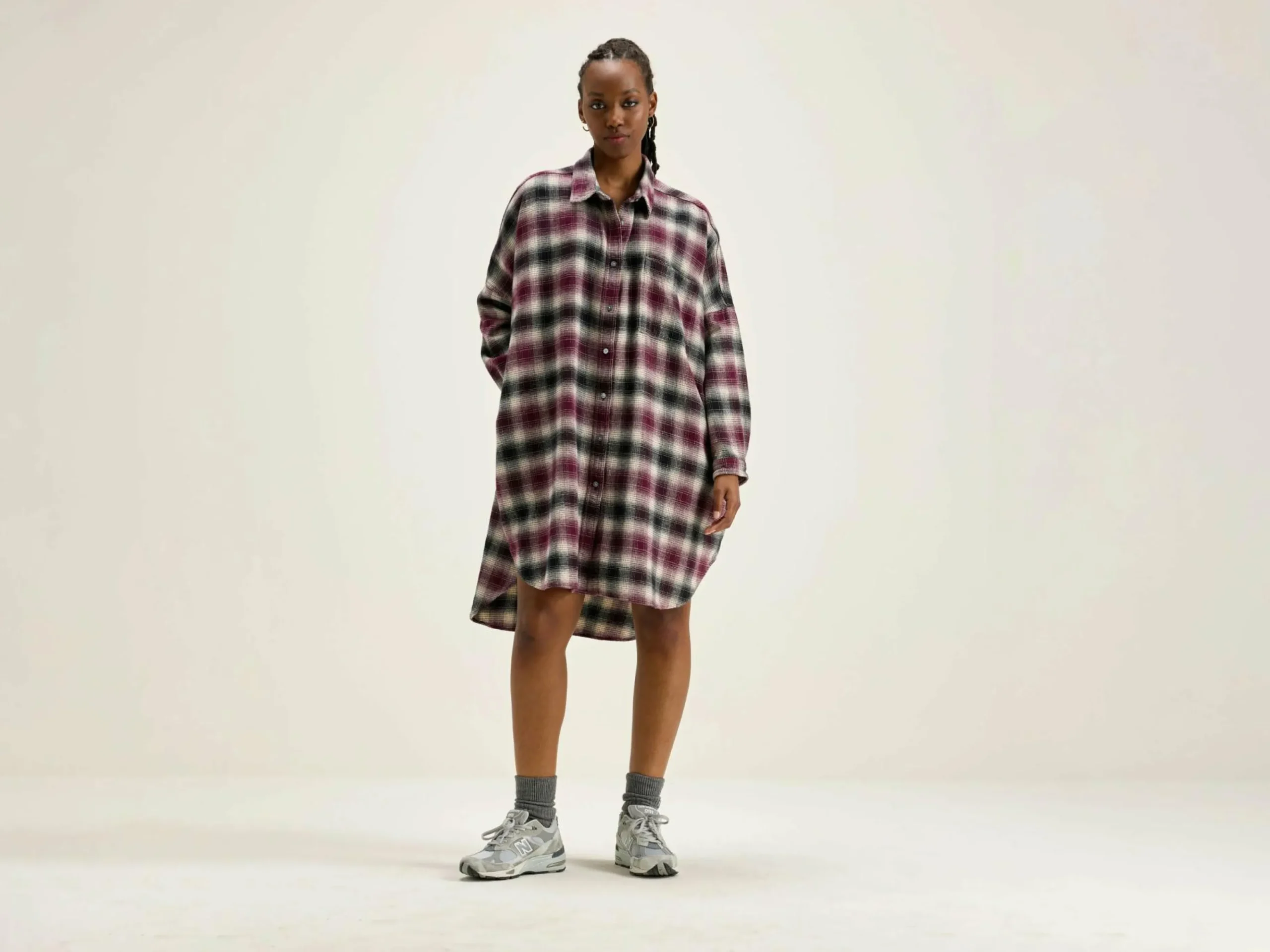 Robe chemise à manches longues, coupe oversize fabriquée en coton brossé à carreaux bordeaux, noirs et écrus.
