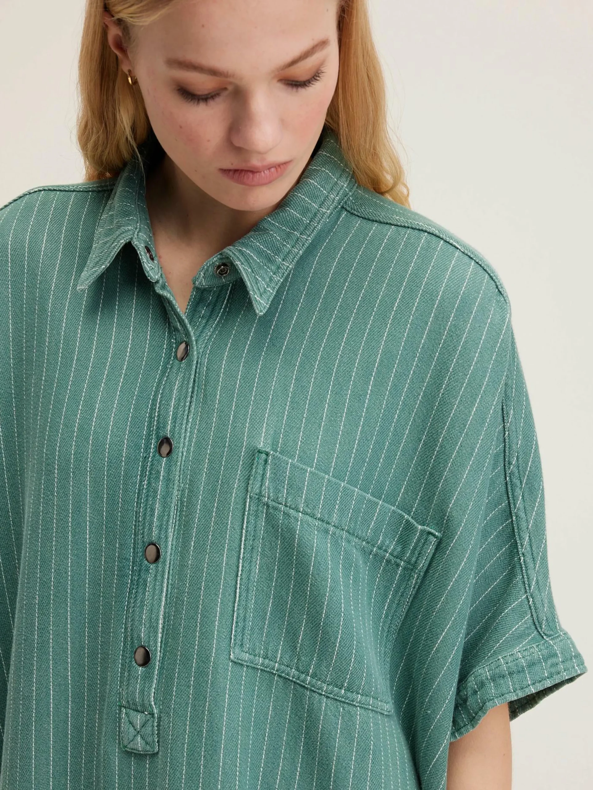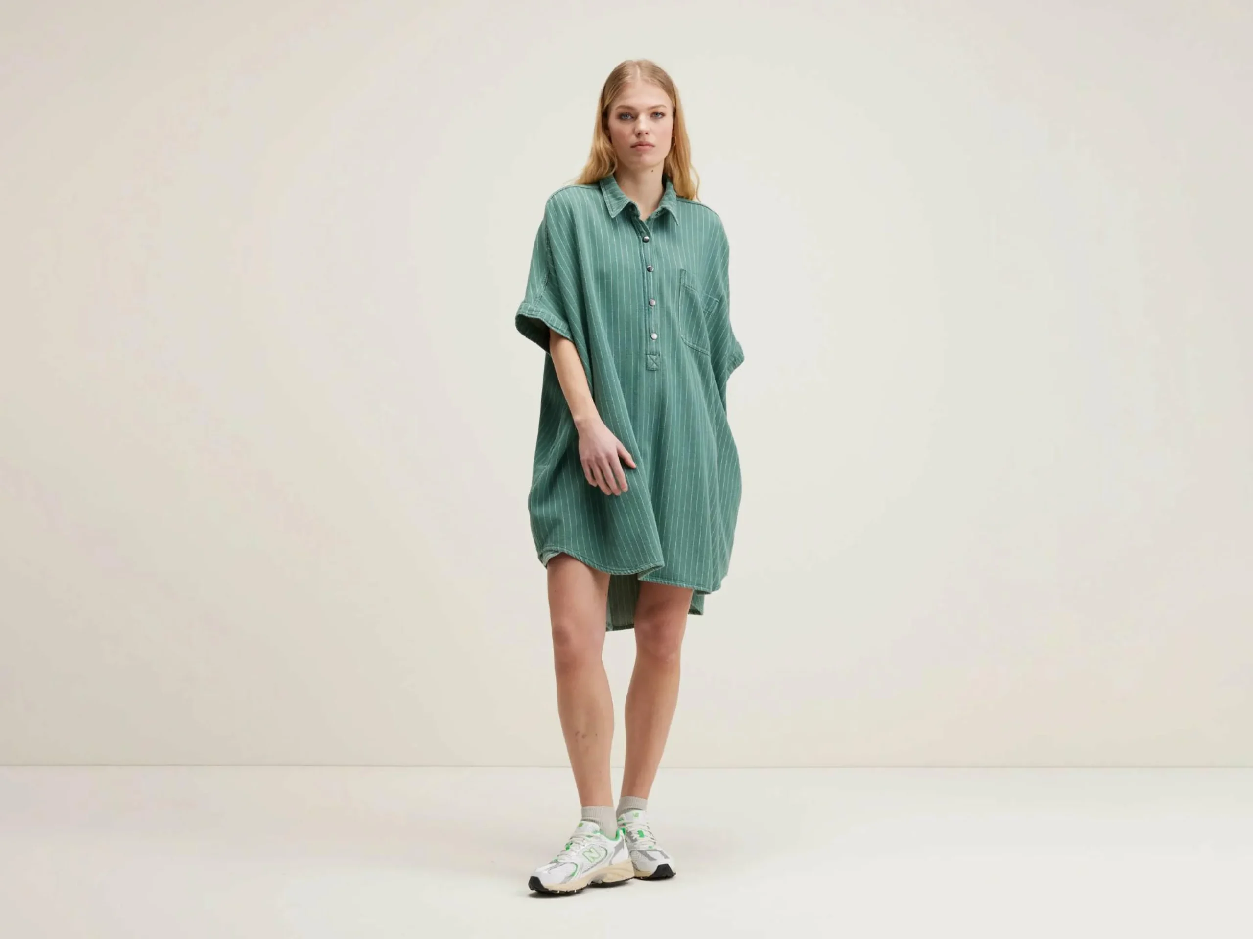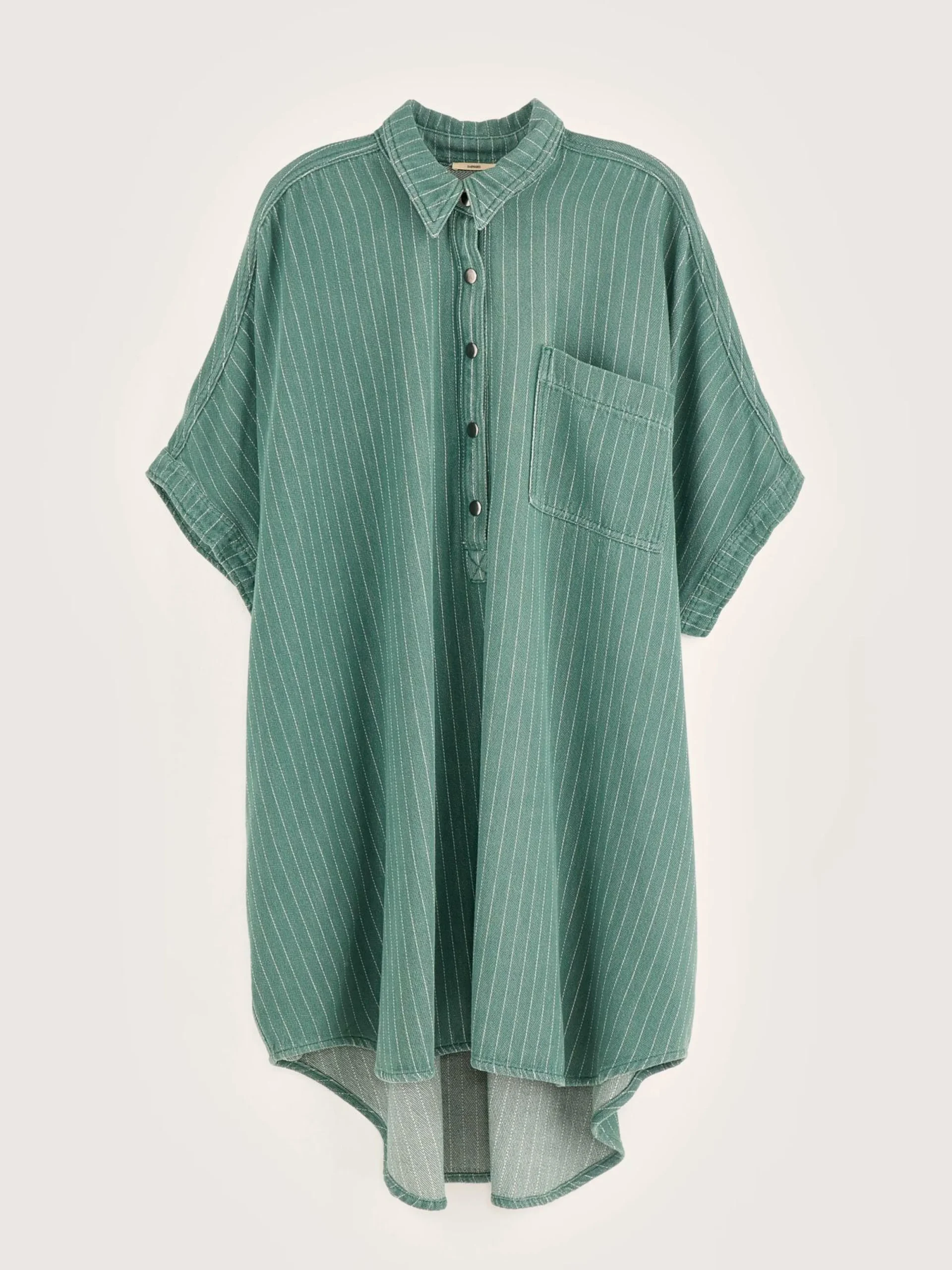 Robe chemise oversize en denim de coton vert à fines rayures blanches.