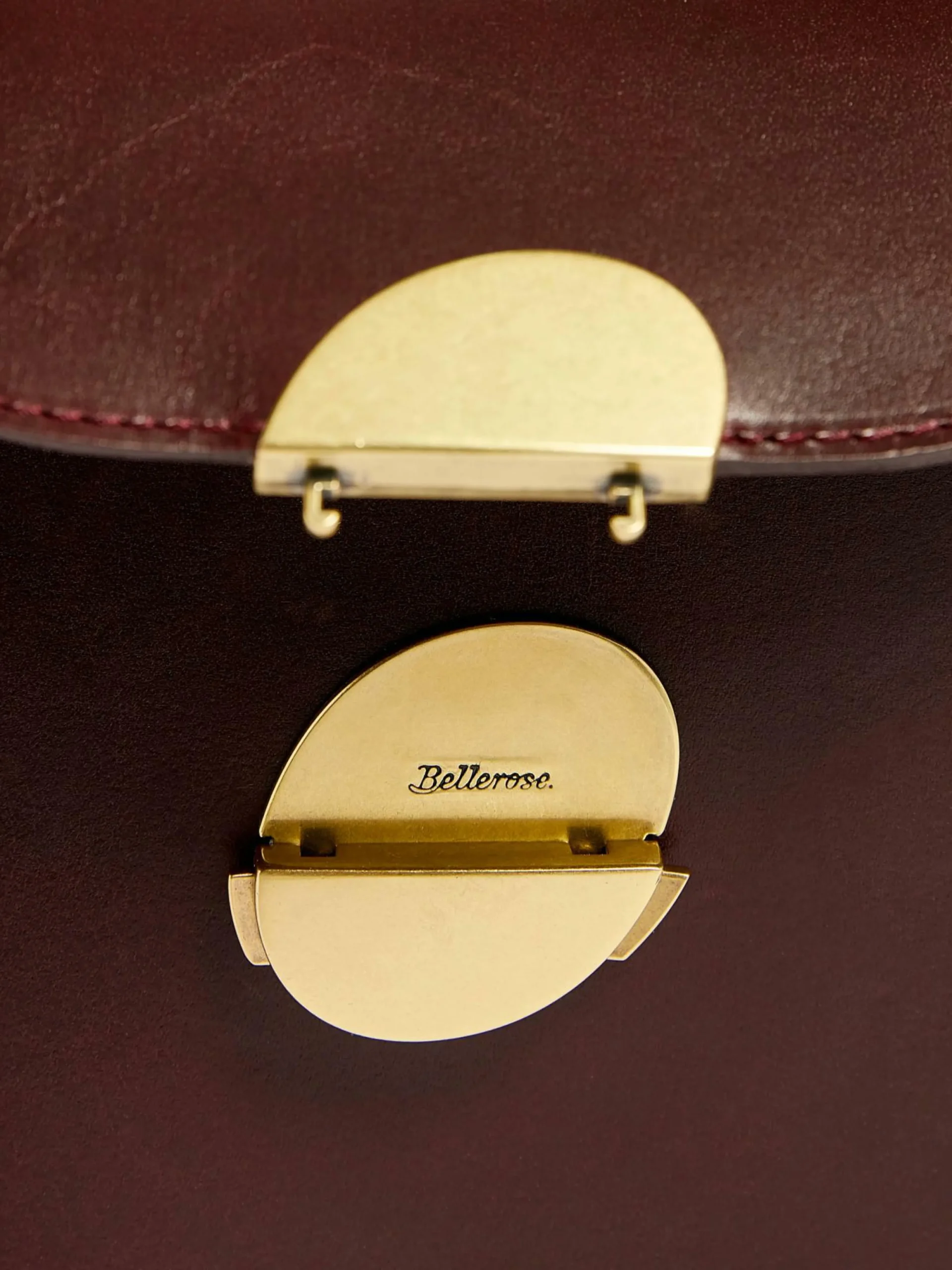 Sac bandoulière en demi-lune avec fermoir poli en cuir lisse couleur bordeaux fermé par une boucle en métal poli.