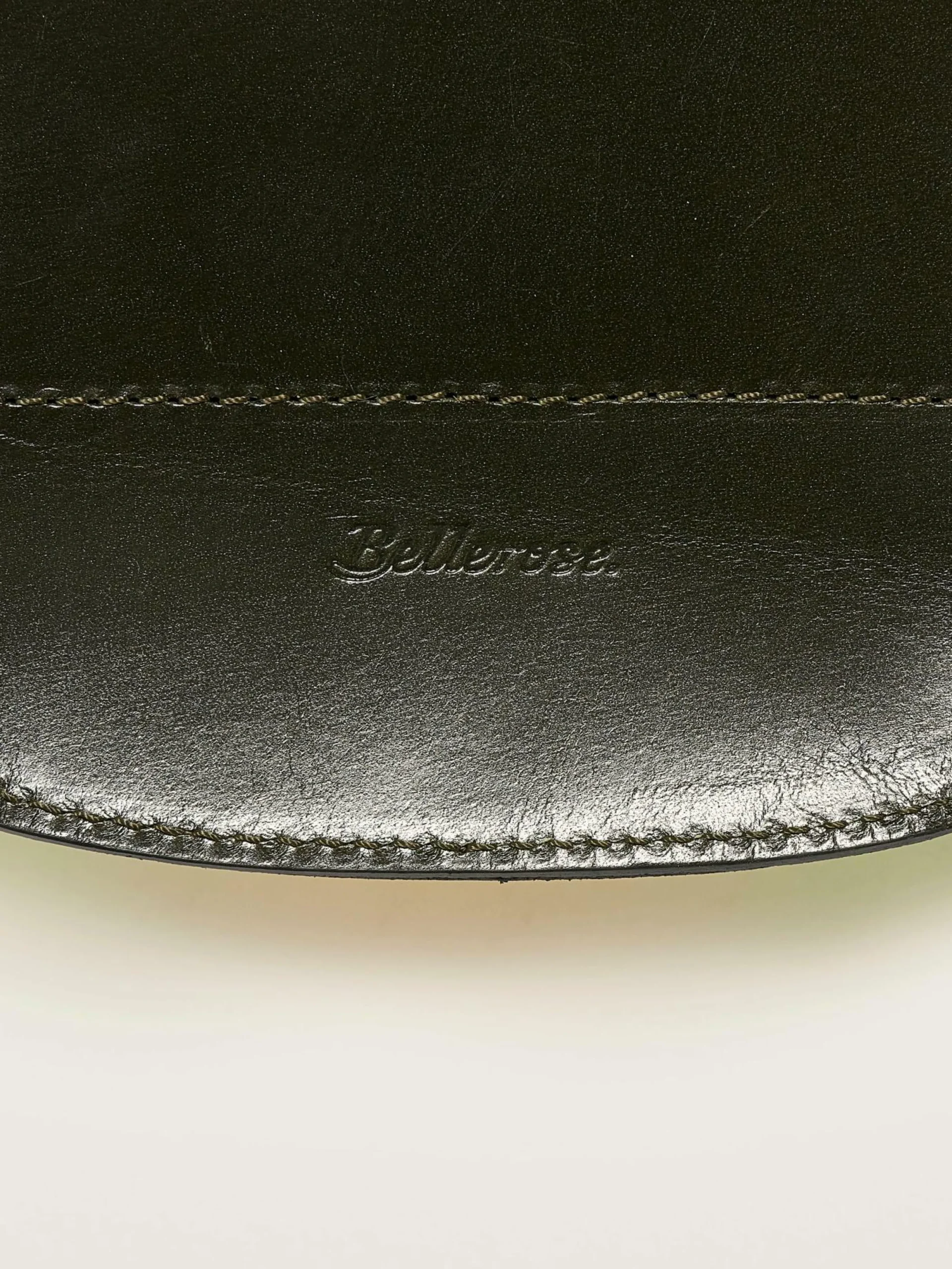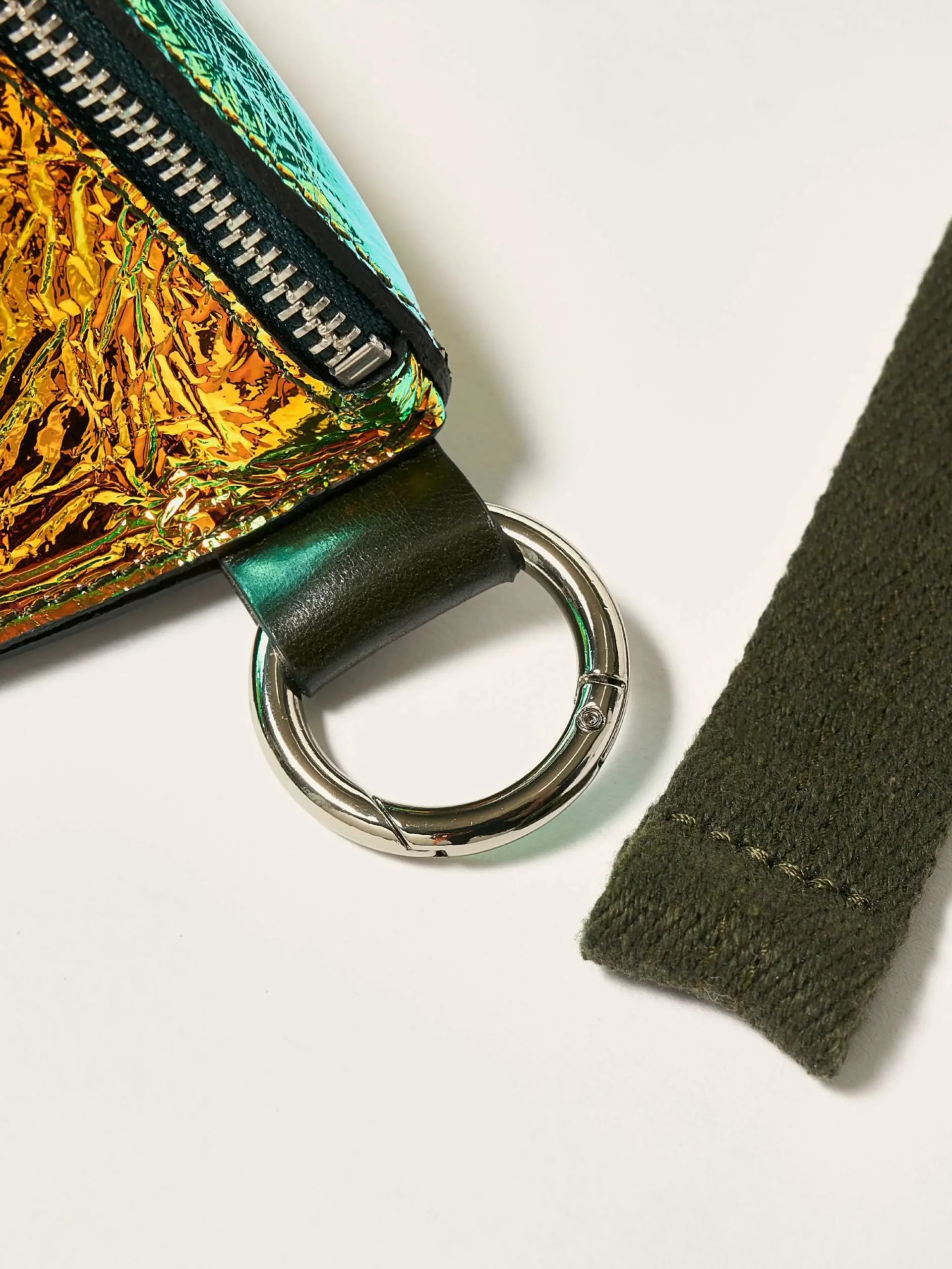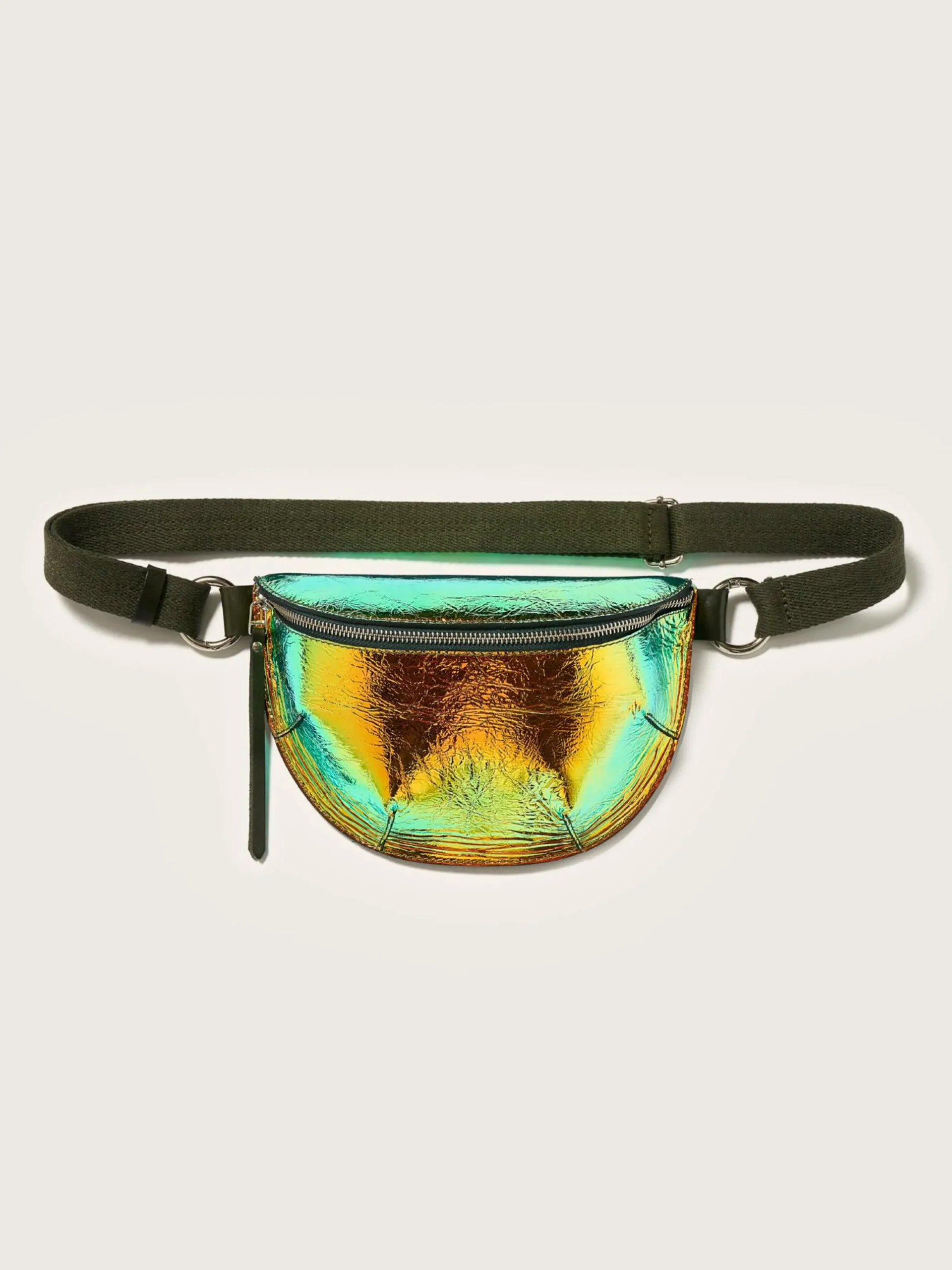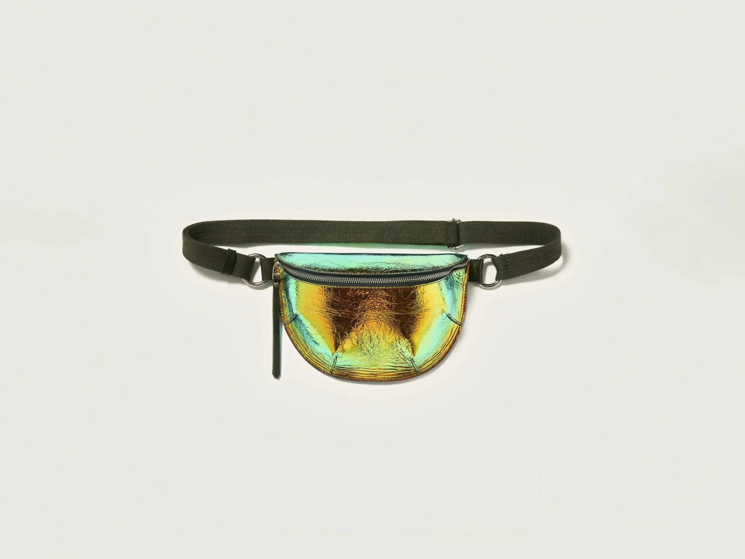 Sac banane en cuir lisse au fini brillant couleur vert foncé.