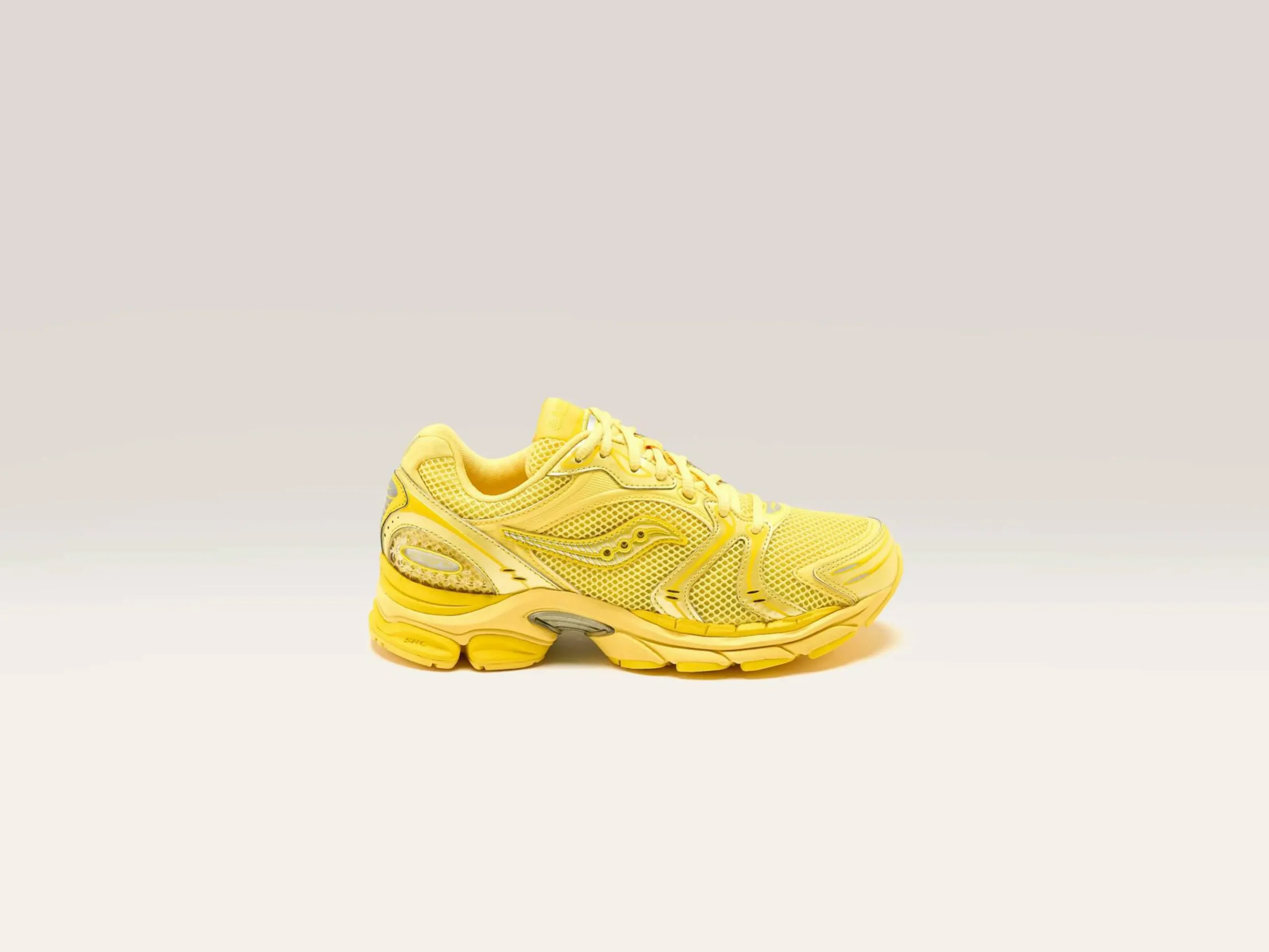 La Saucony ProGrid Triumph 4 Chroma présente un design jaune vif et une silhouette de course à pied.