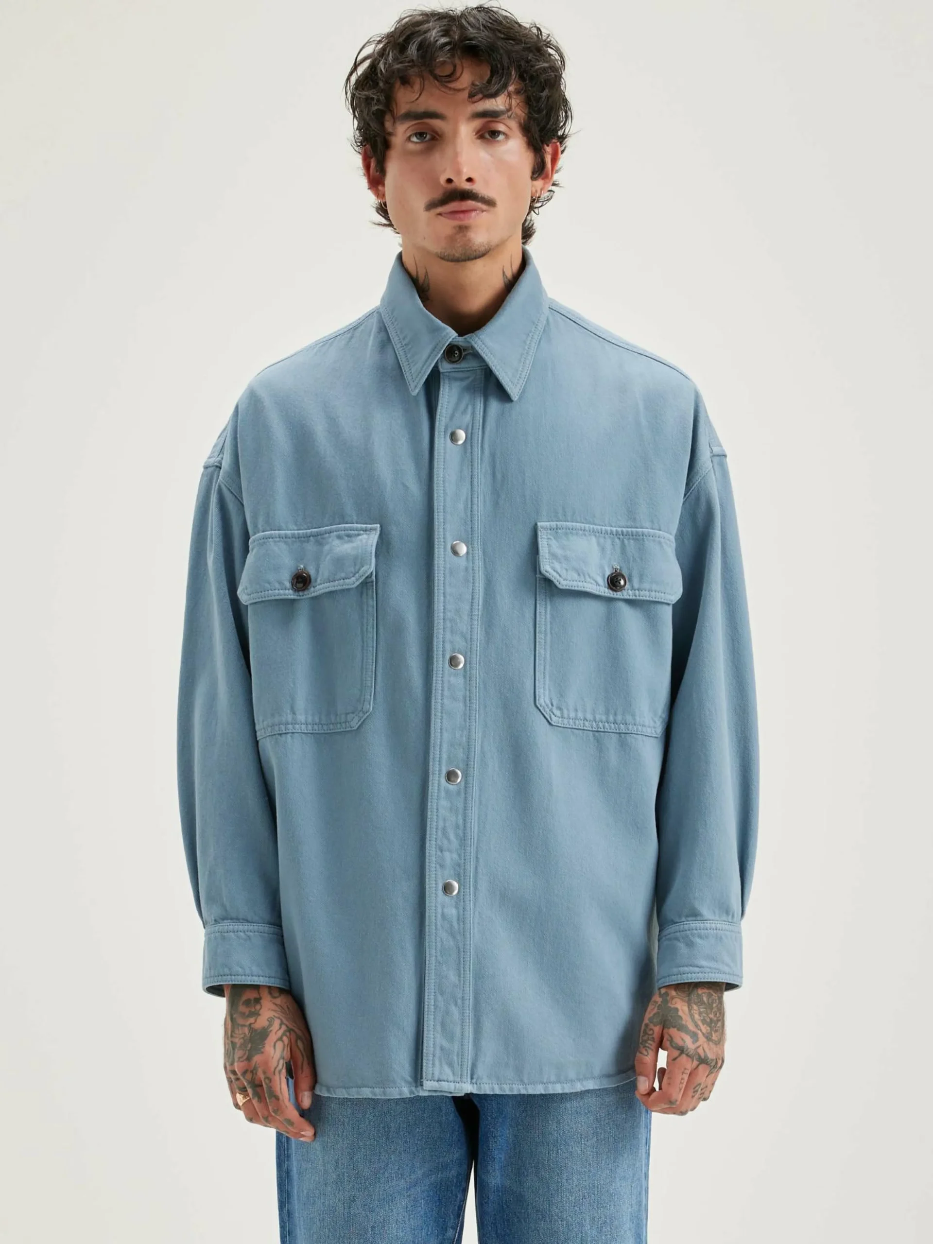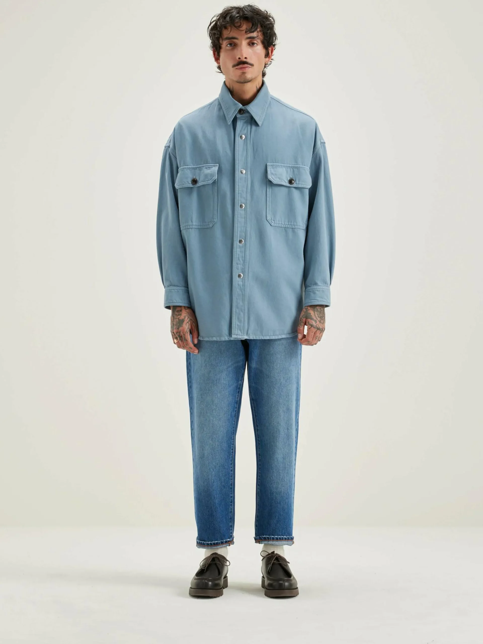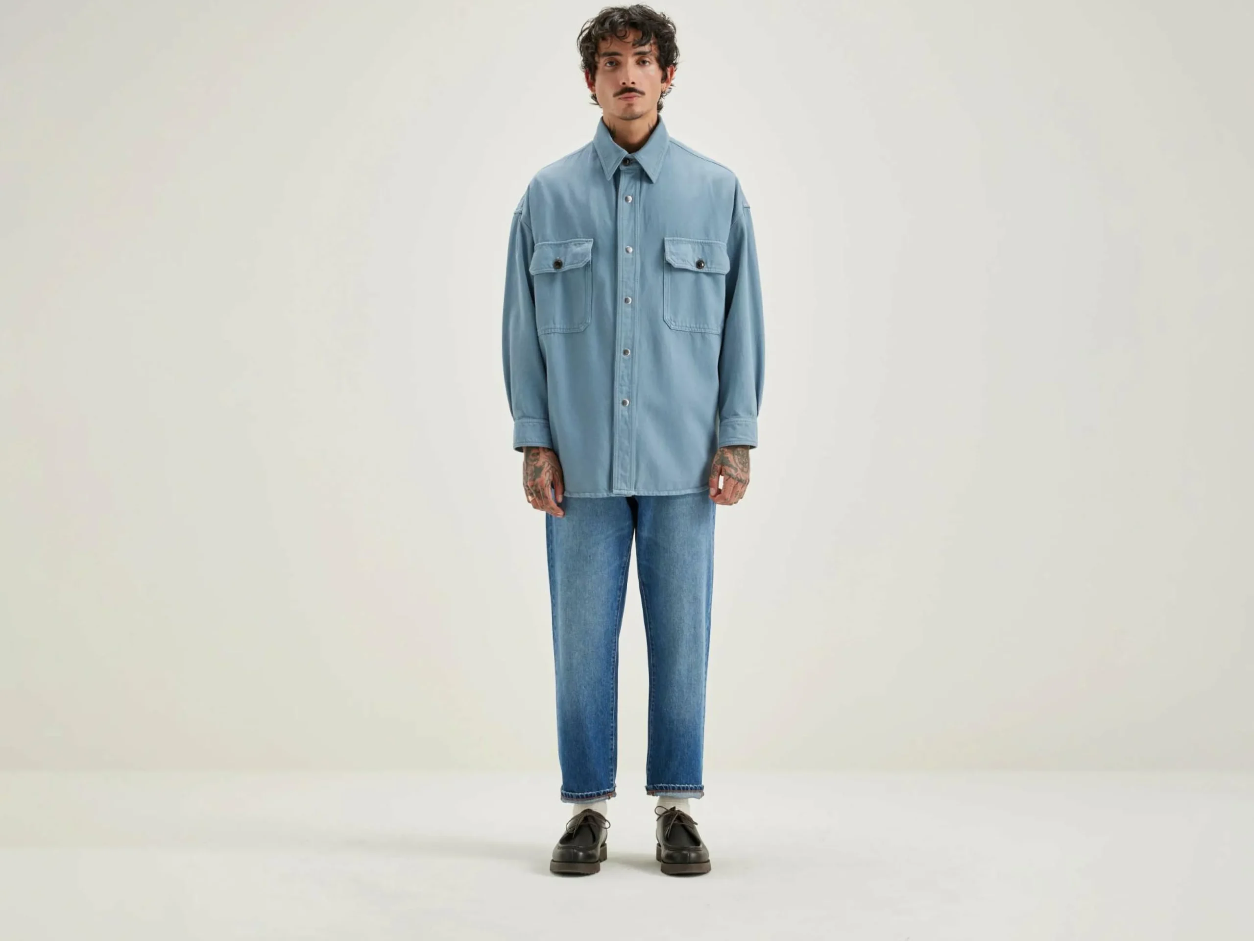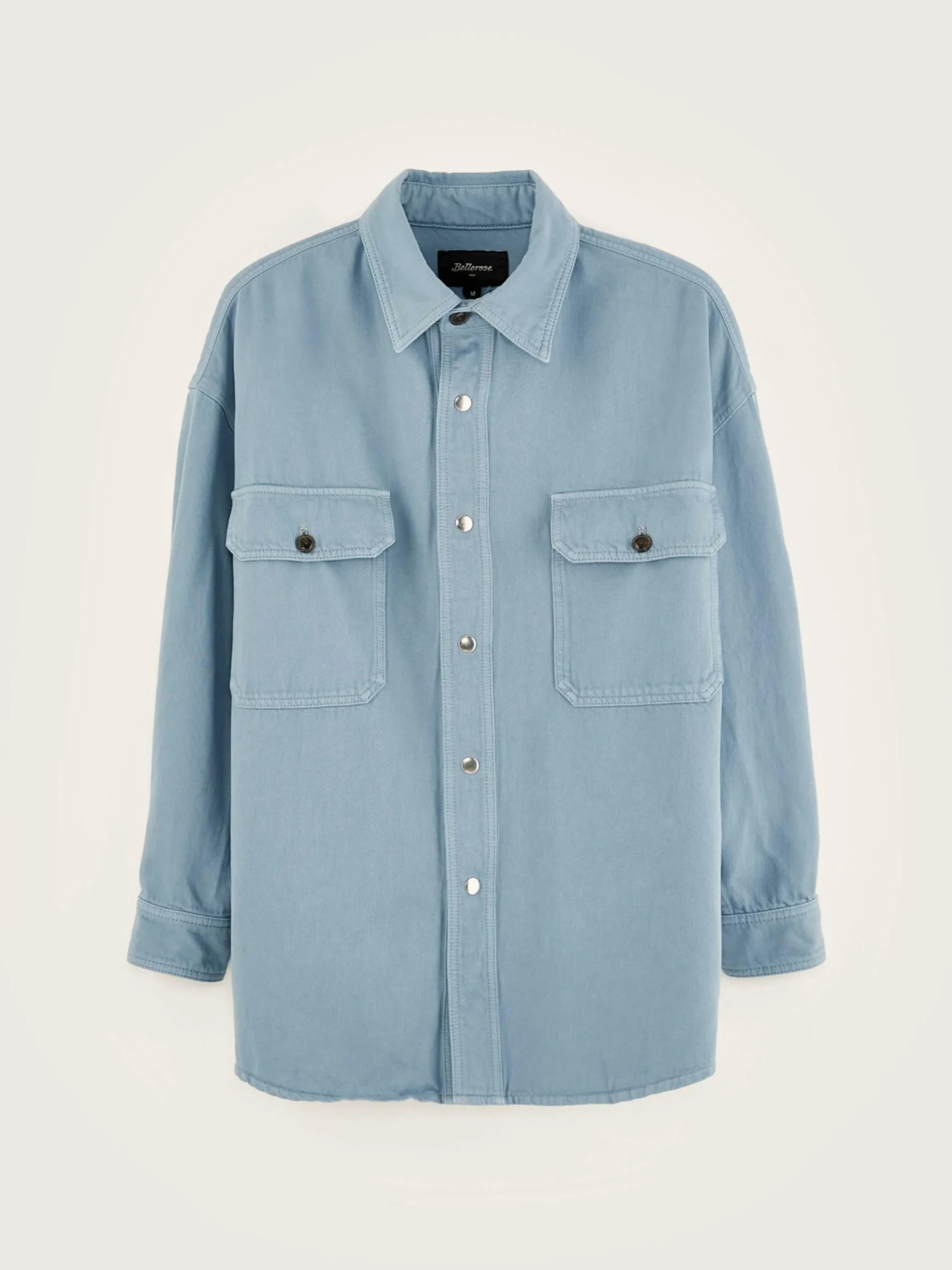 Surchemise en coton bleu chambray, coupe oversize et poche plaquée à l’avant.