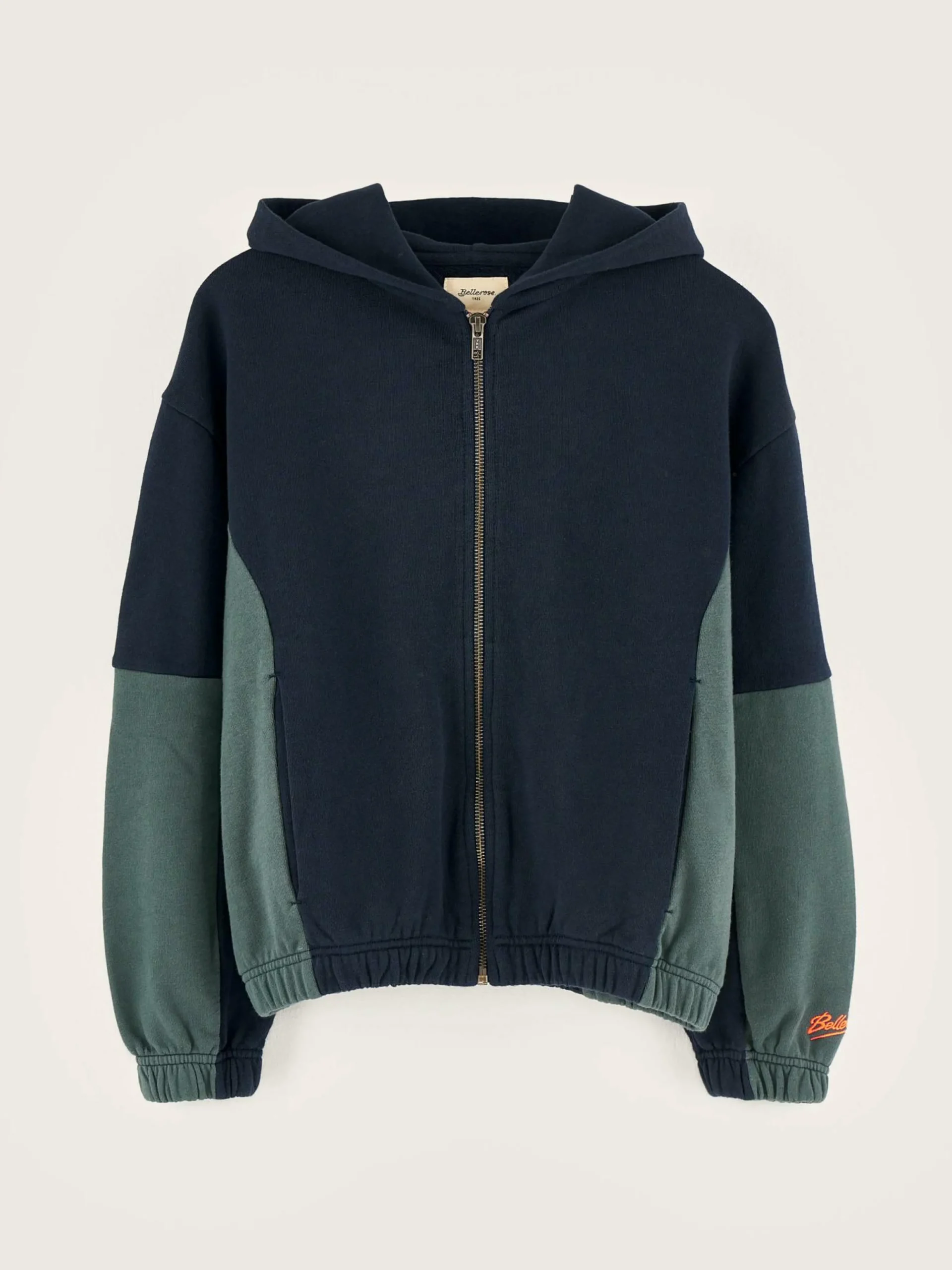 Sweatshirt zippé à capuche coupe décontractée, style color-block, en jersey bleu foncé et vert mousse.