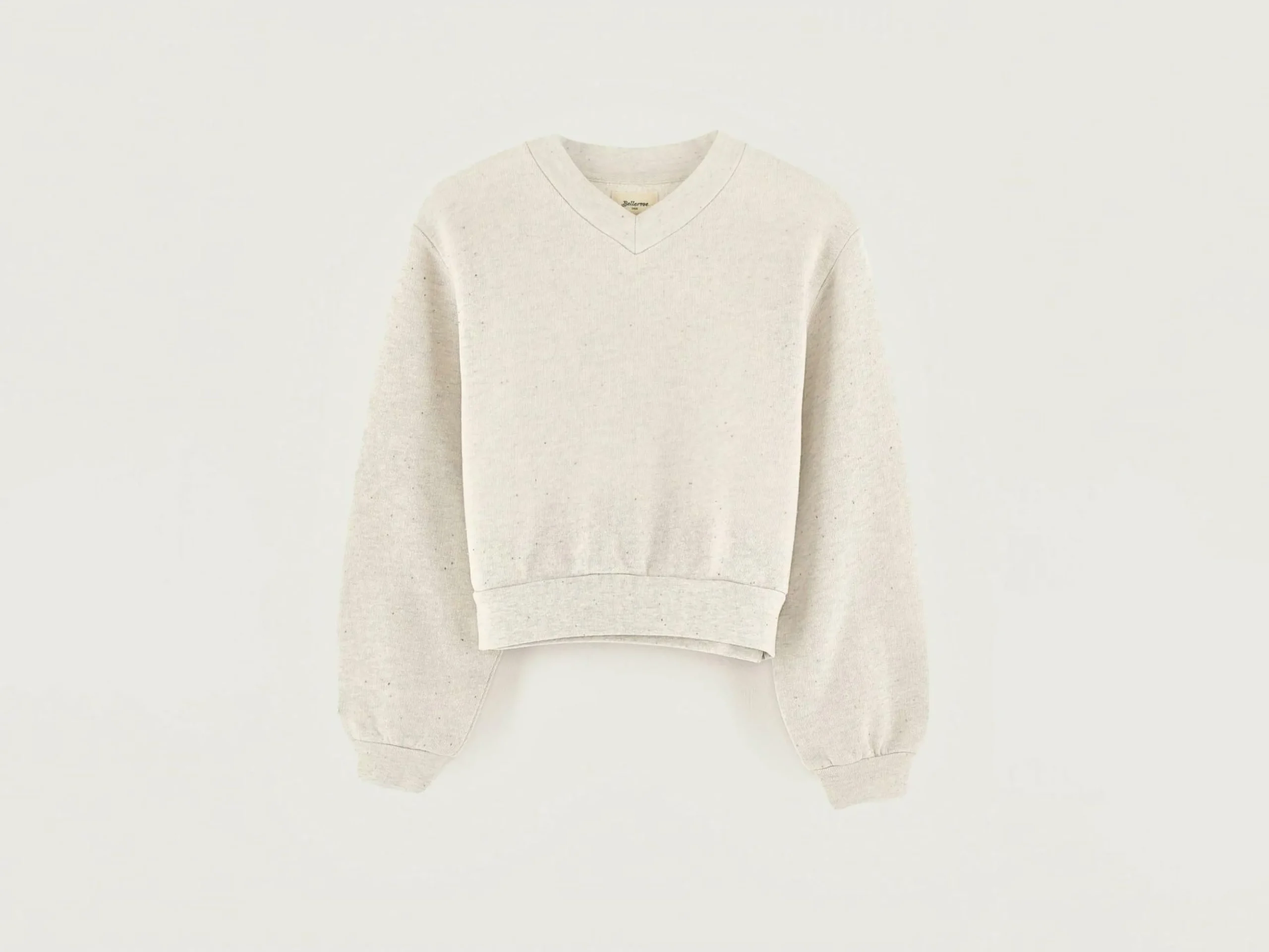 Sweatshirt décontracté à col V, en jersey gris chiné avec neps multicolores.