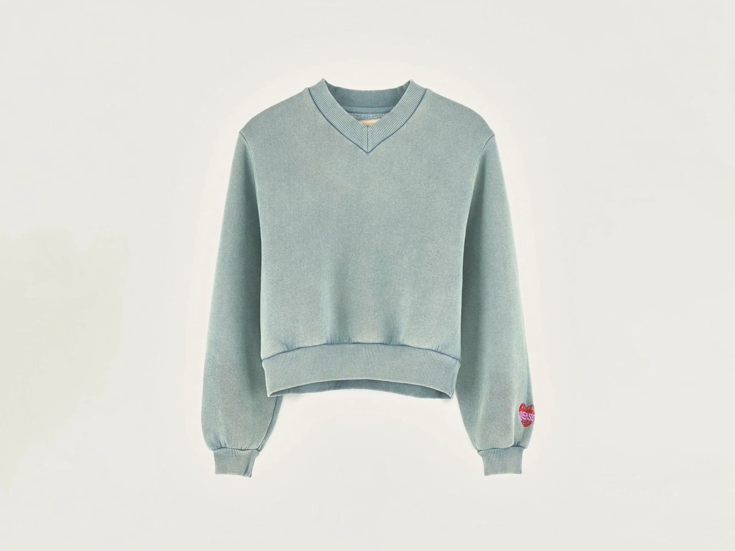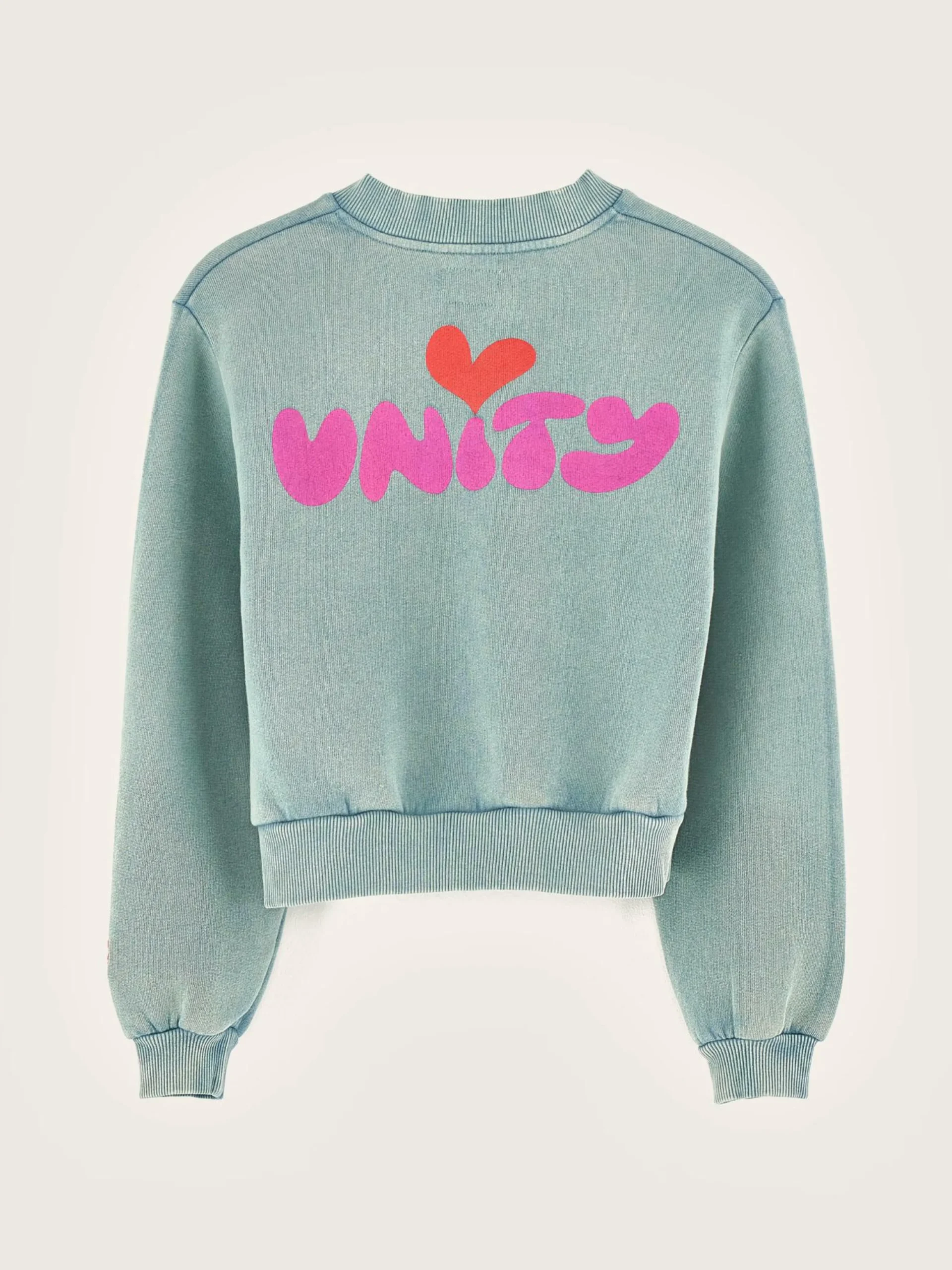 Sweatshirt décontracté à col V, en jersey bleu et imprimé « Unity » sur l’arrière.
